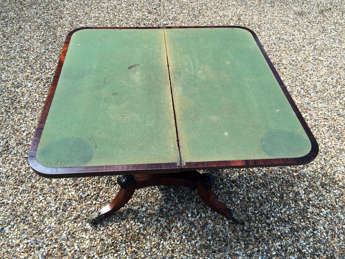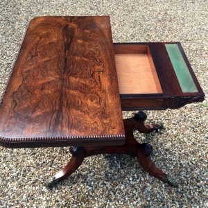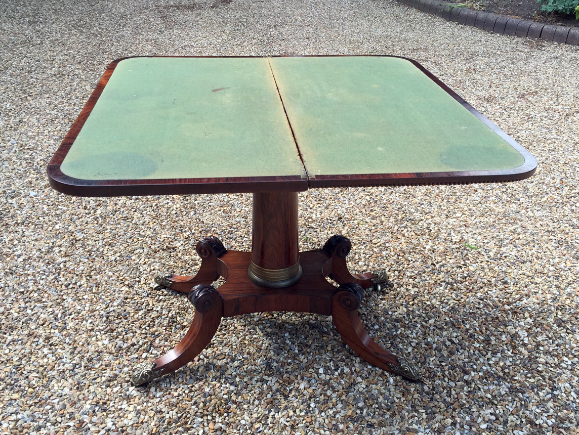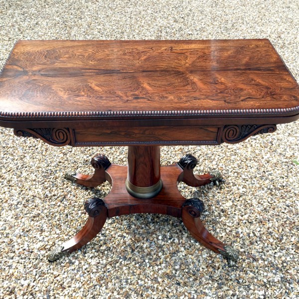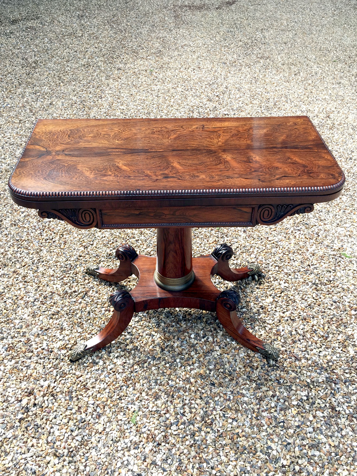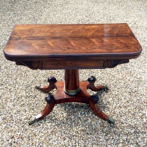 A superb quality Regency Rosewood Card Table with beautifully figured rosewood and original biase. The cylindrical stem has a figured brass collar on centre which issues four carved acanthus leaf sabre shaped legs terminating in original brass anthemion swivel castors.