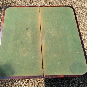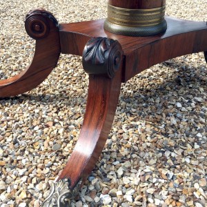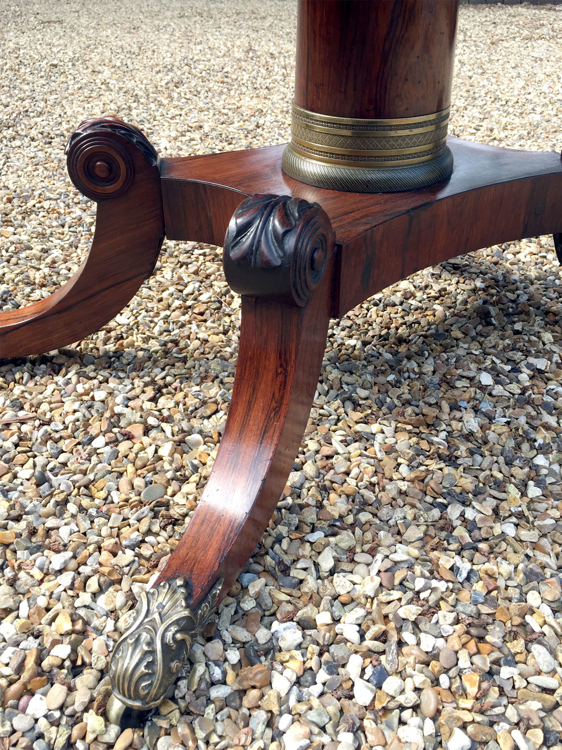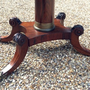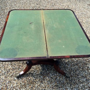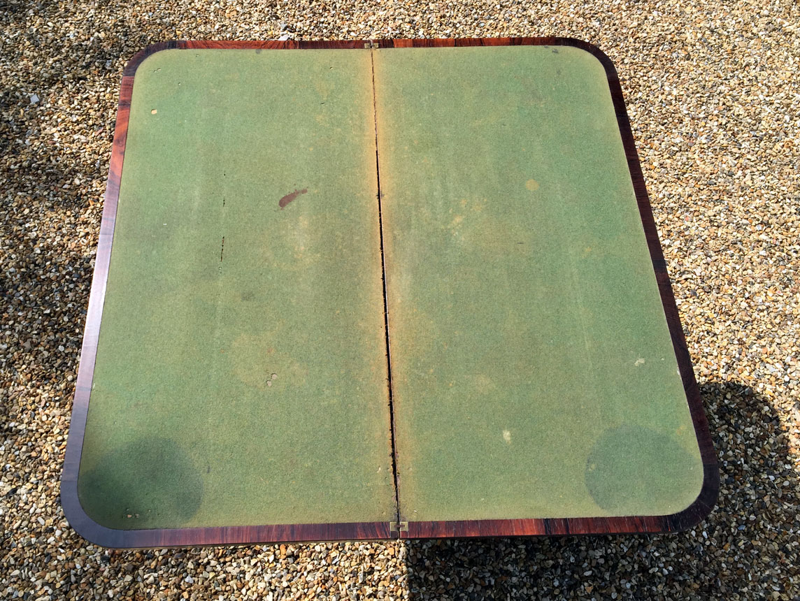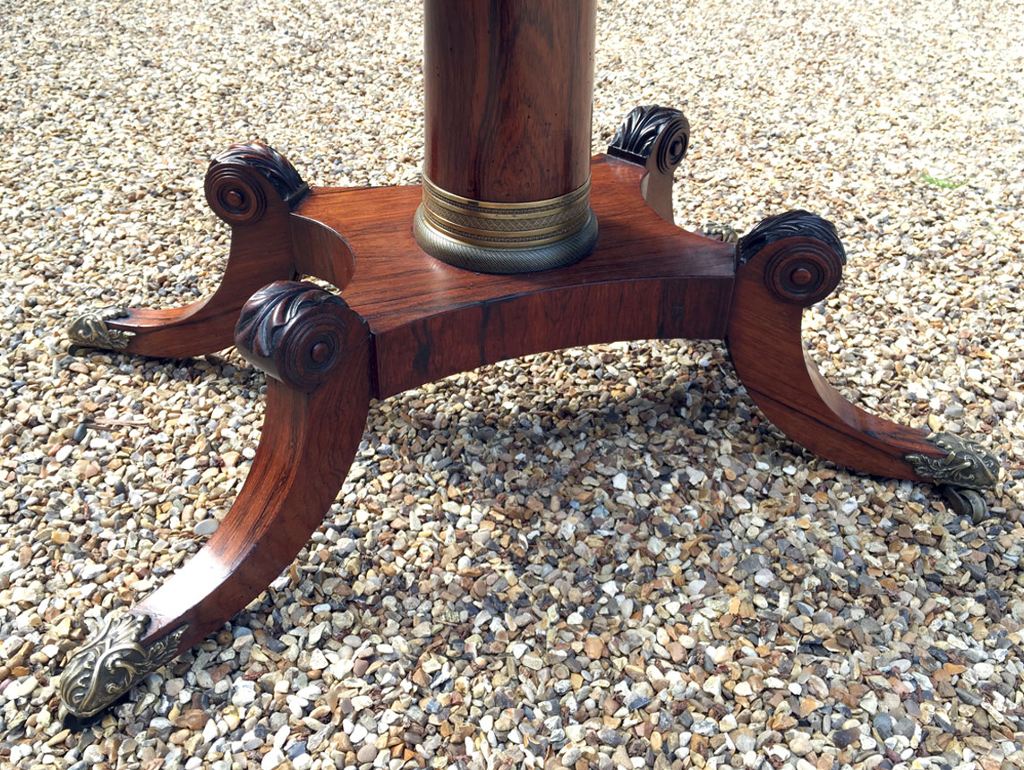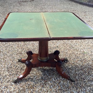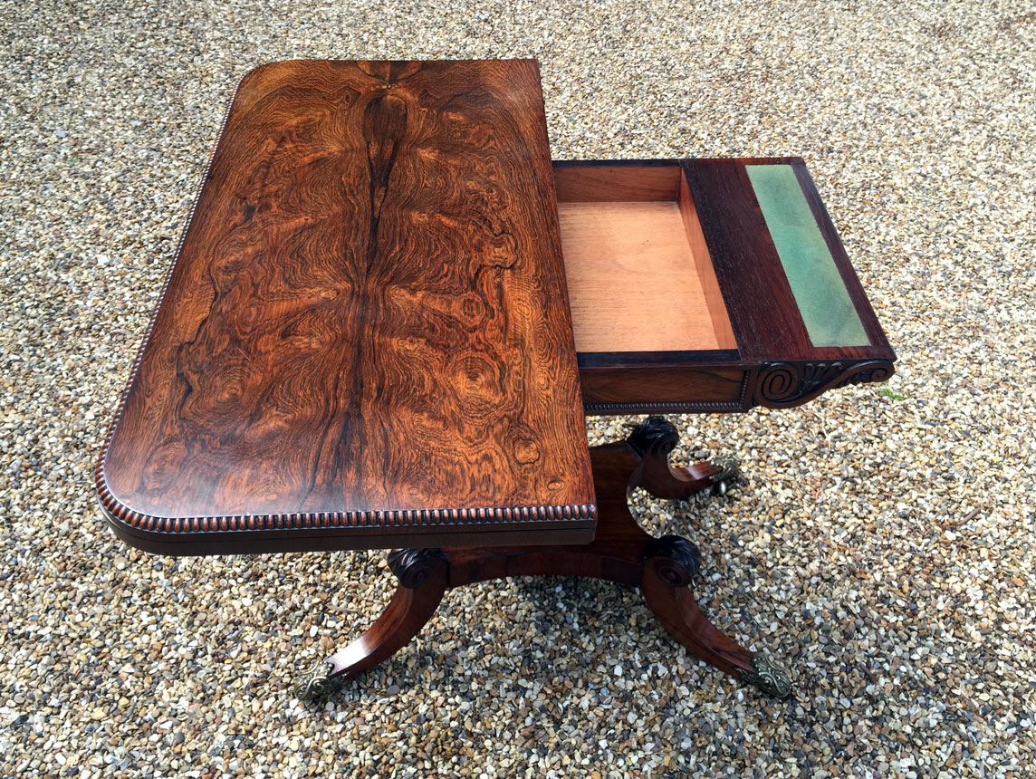 A superb quality Regency Rosewood Card Table with beautifully figured rosewood and original biase. The cylindrical stem has a figured brass collar on centre which issues four carved acanthus leaf sabre shaped legs terminating in original brass anthemion swivel castors.