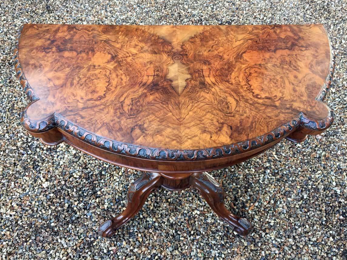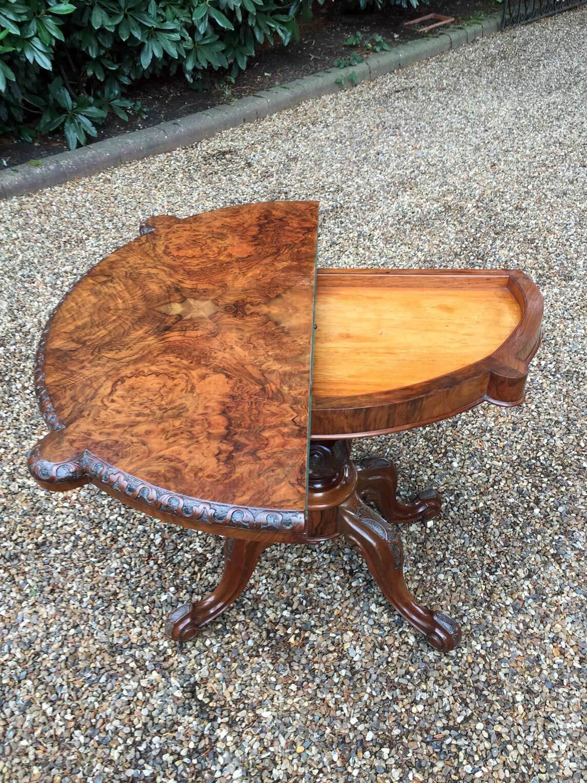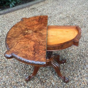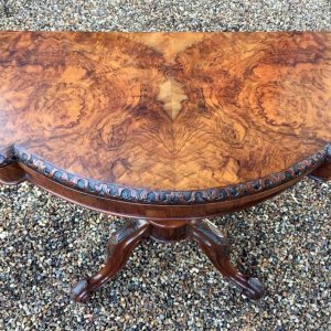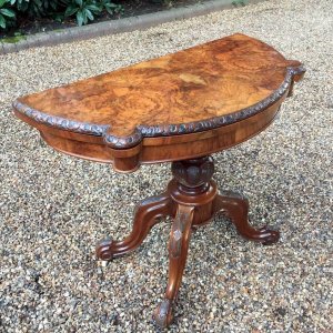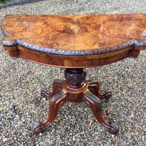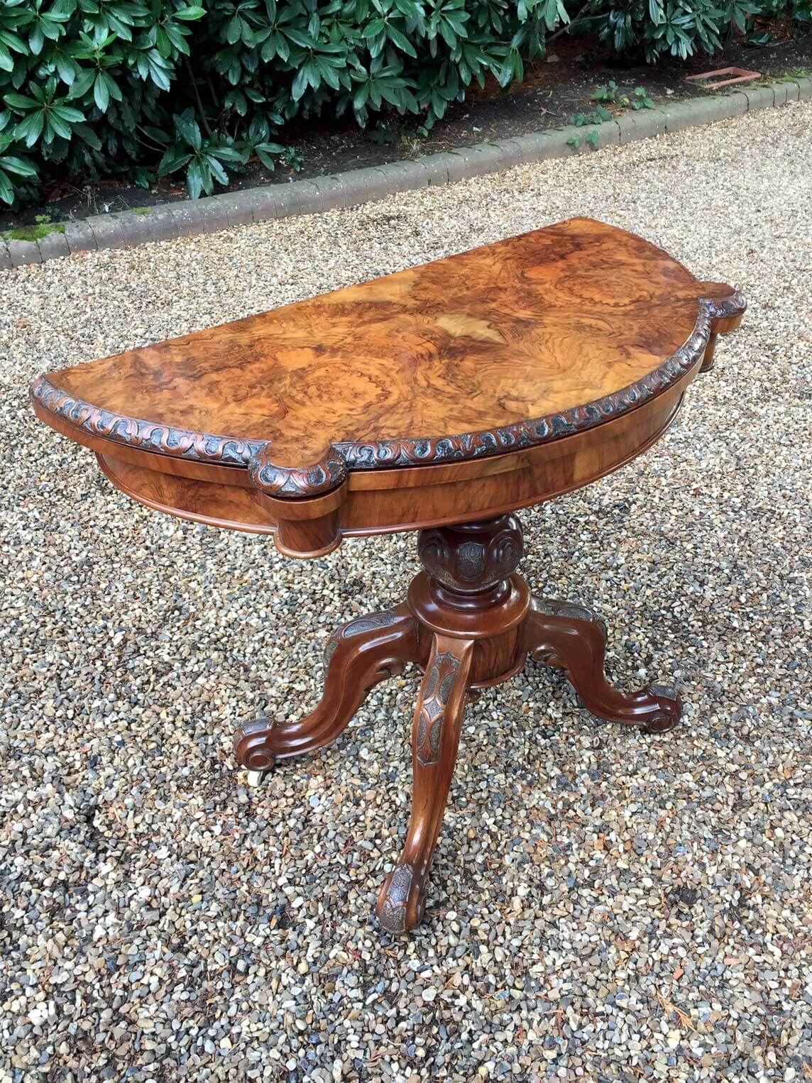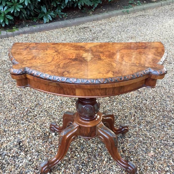 A beautiful 19th Century Victorian Burr Walnut Demi Lune Card Table of exceptional quality and condition. The turned and carved column supports, four well carved and shaped cabriole legs with the original castors. The burr walnut underfrieze and top are complimented with a carved edging that really sets the piece off. The top rotates by 90 degrees and unfolds to convert to the card table with green baize.