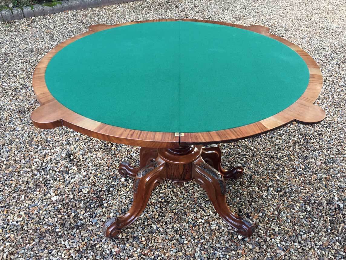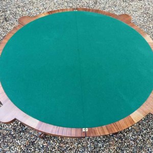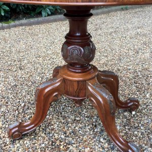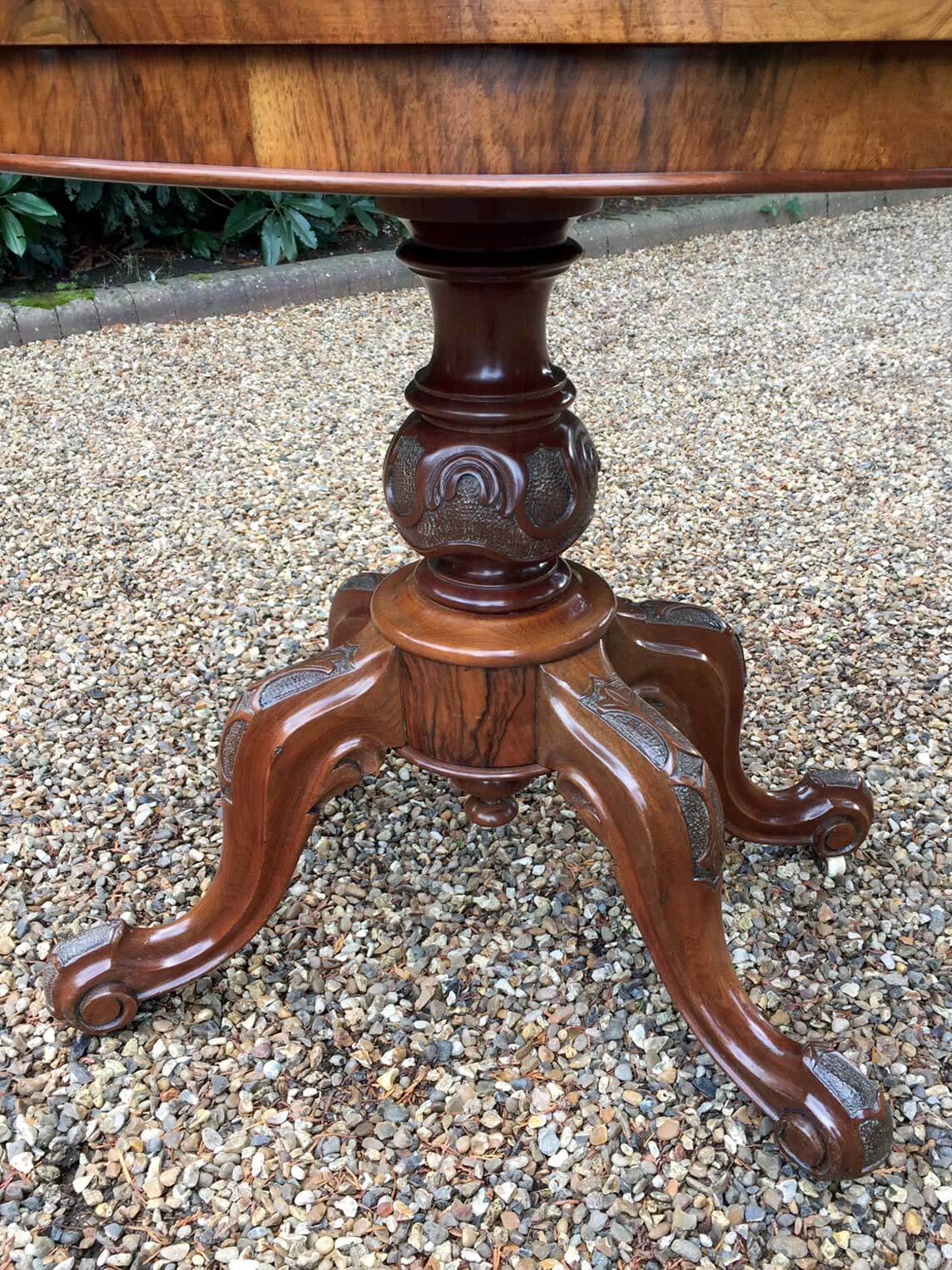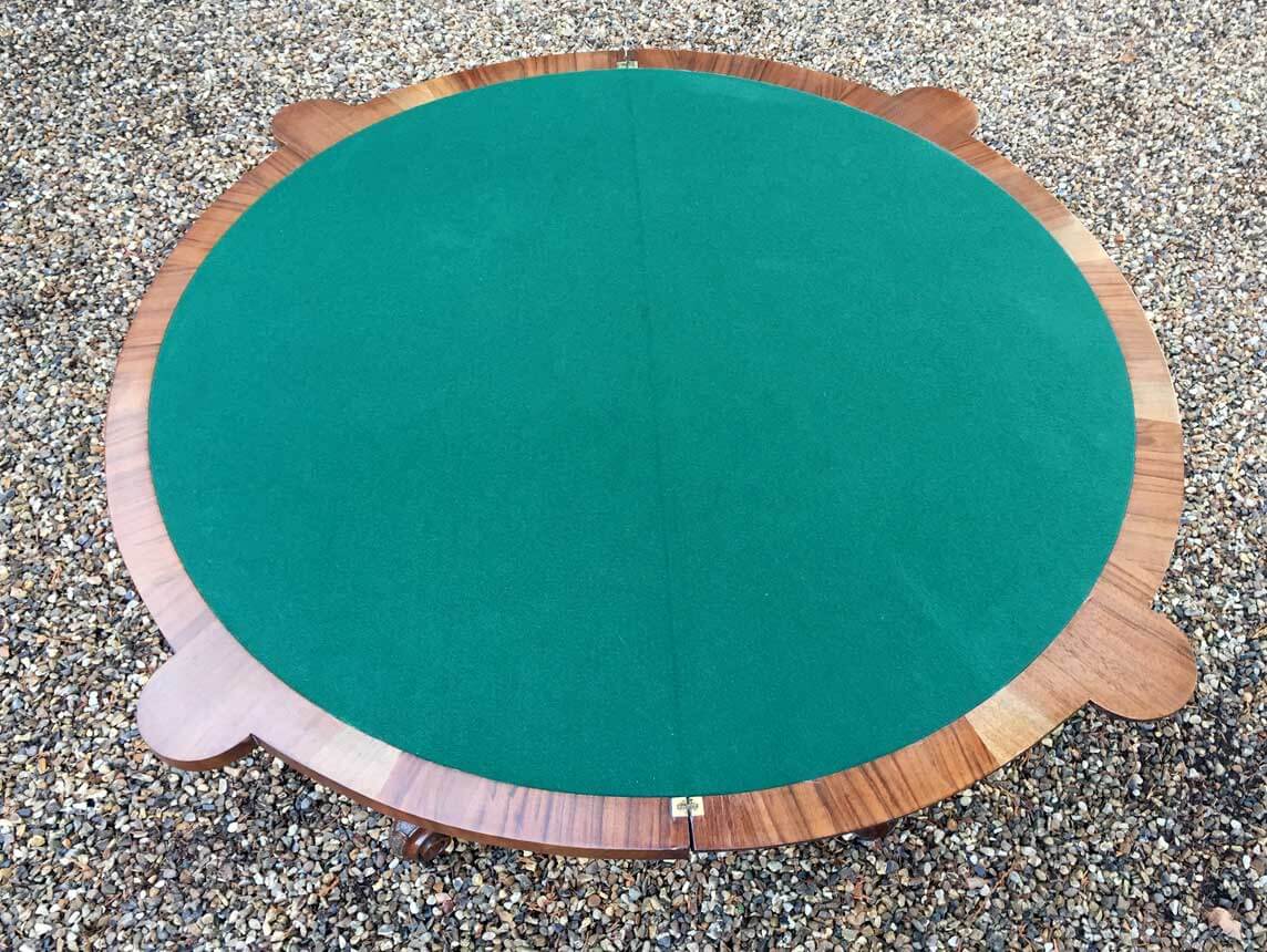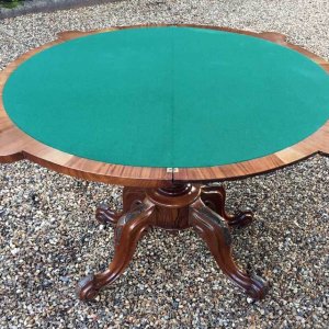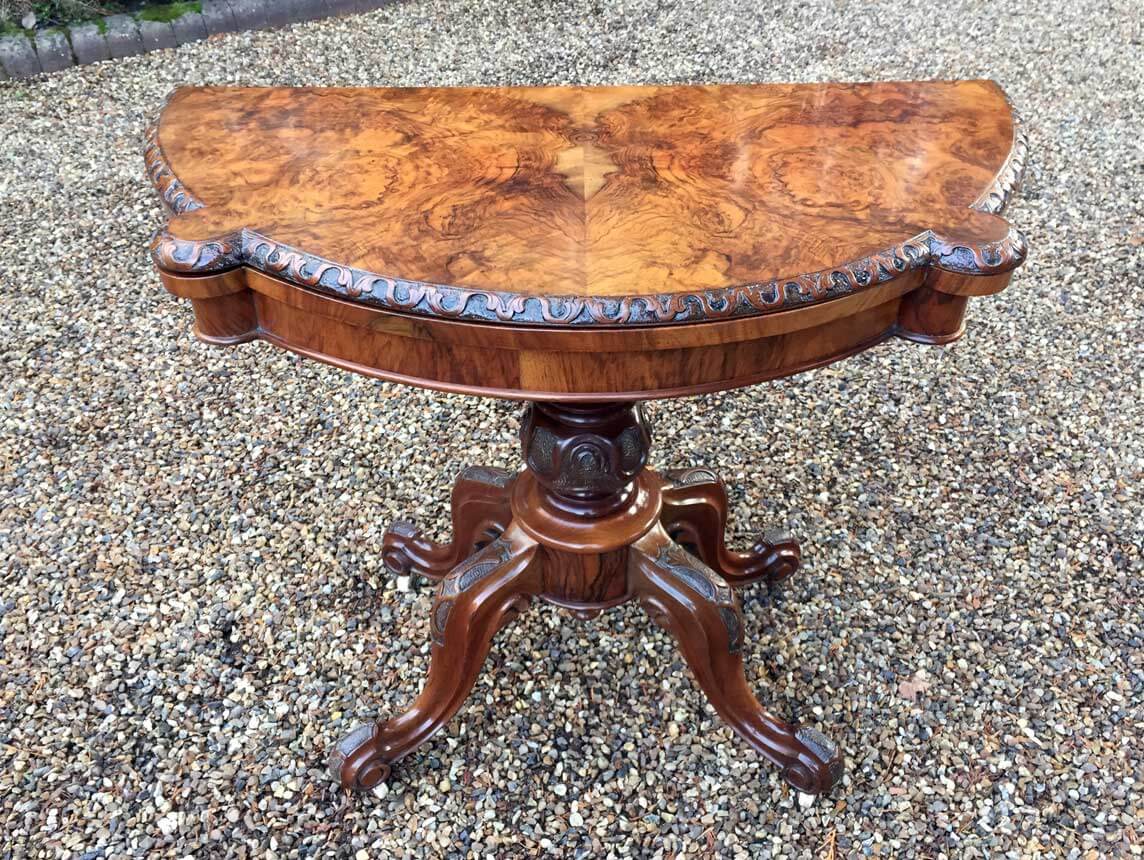 A beautiful 19th Century Victorian Burr Walnut Demi Lune Card Table of exceptional quality and condition. The turned and carved column supports, four well carved and shaped cabriole legs with the original castors. The burr walnut underfrieze and top are complimented with a carved edging that really sets the piece off. The top rotates by 90 degrees and unfolds to convert to the card table with green baize.