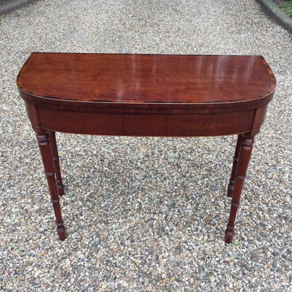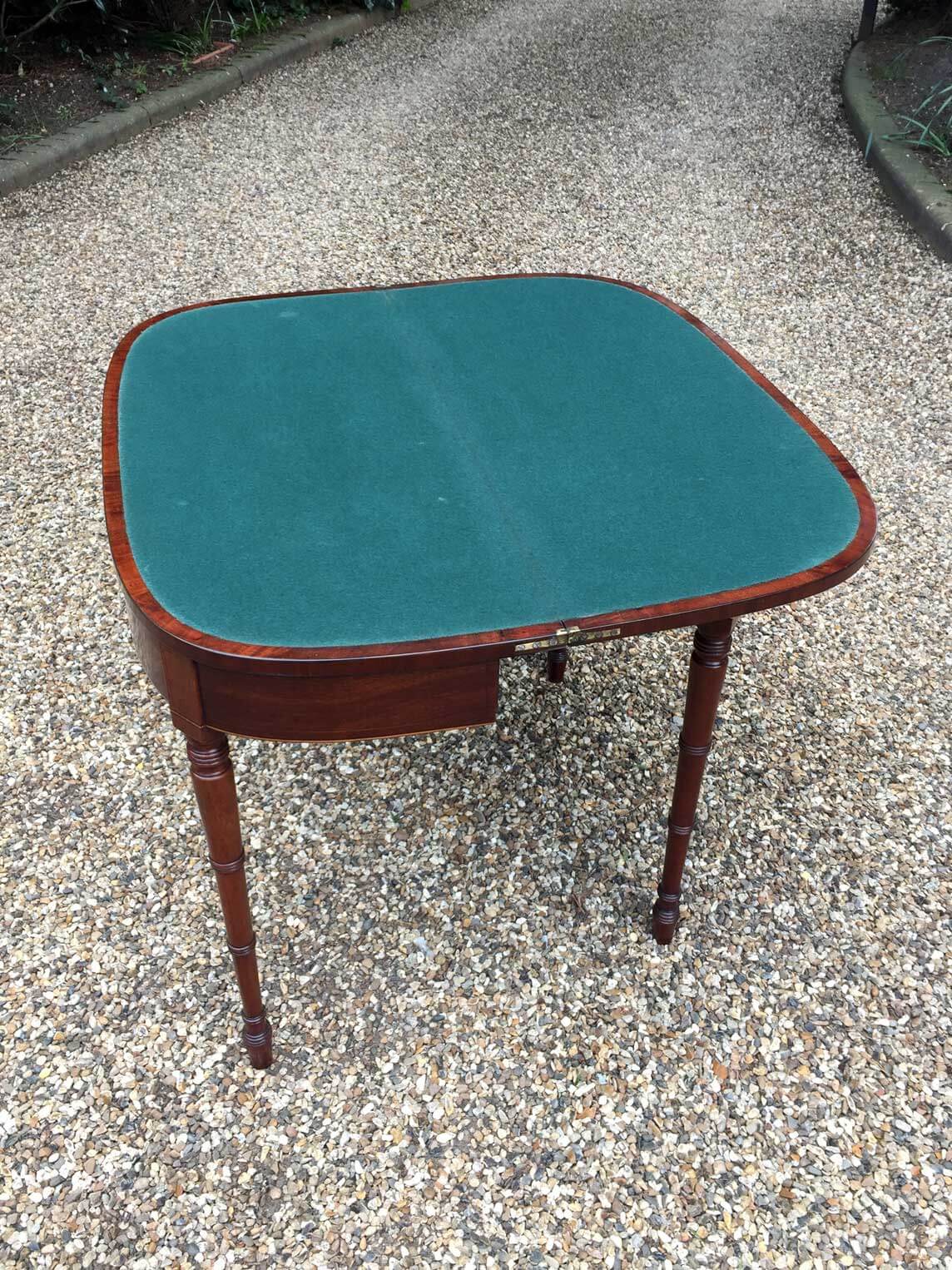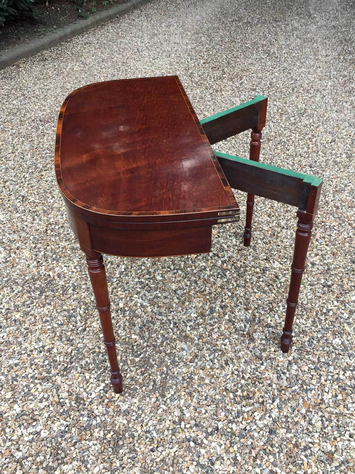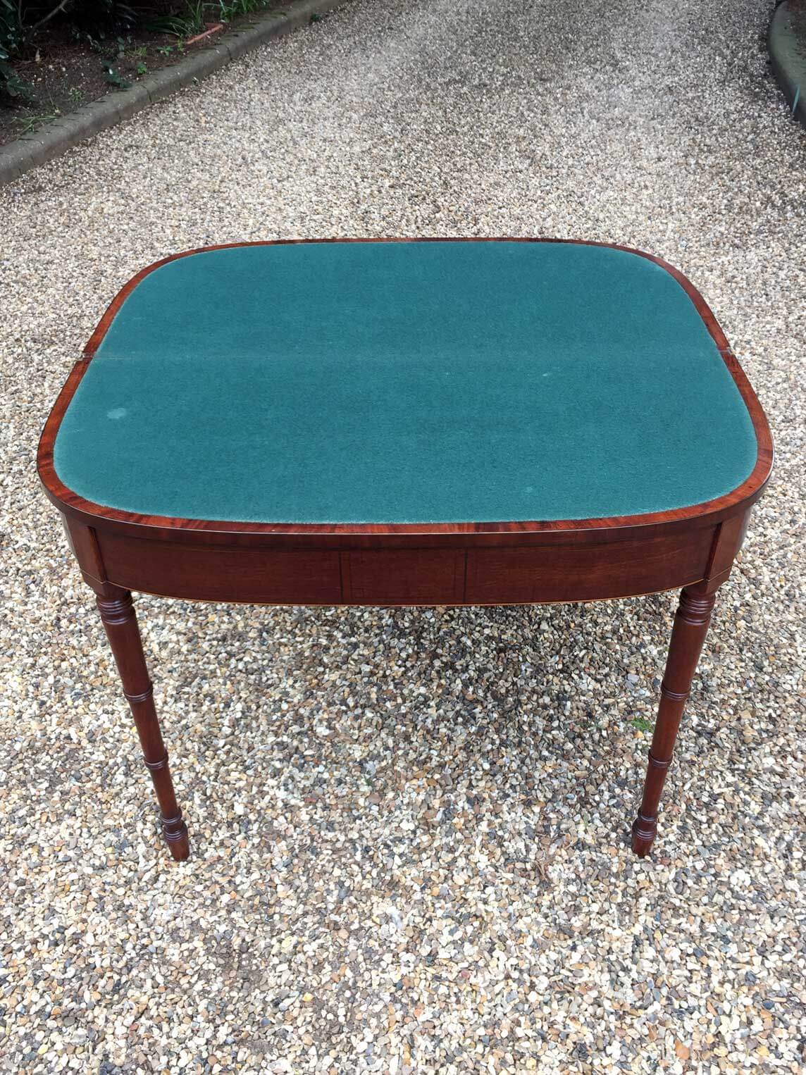 Georgian Plum Pudding Mahogany D-Shaped Card Table with inlay, crossbanded figured rosewood on the top with turned legs and original green baize inside.