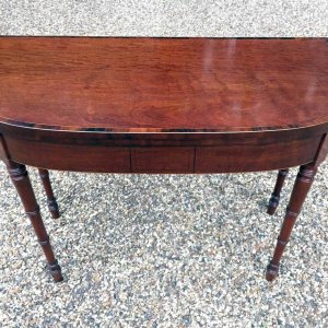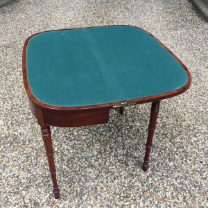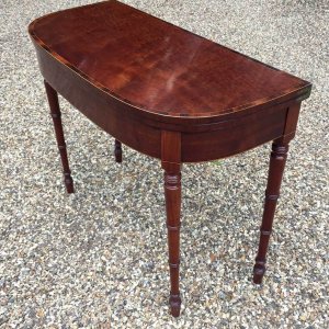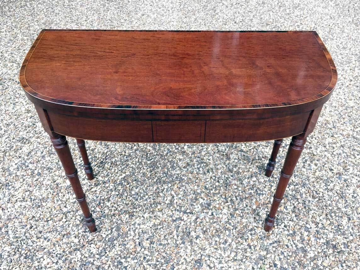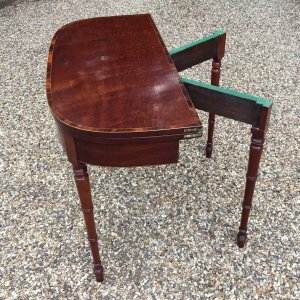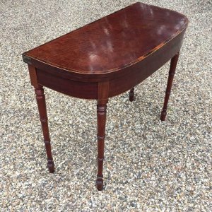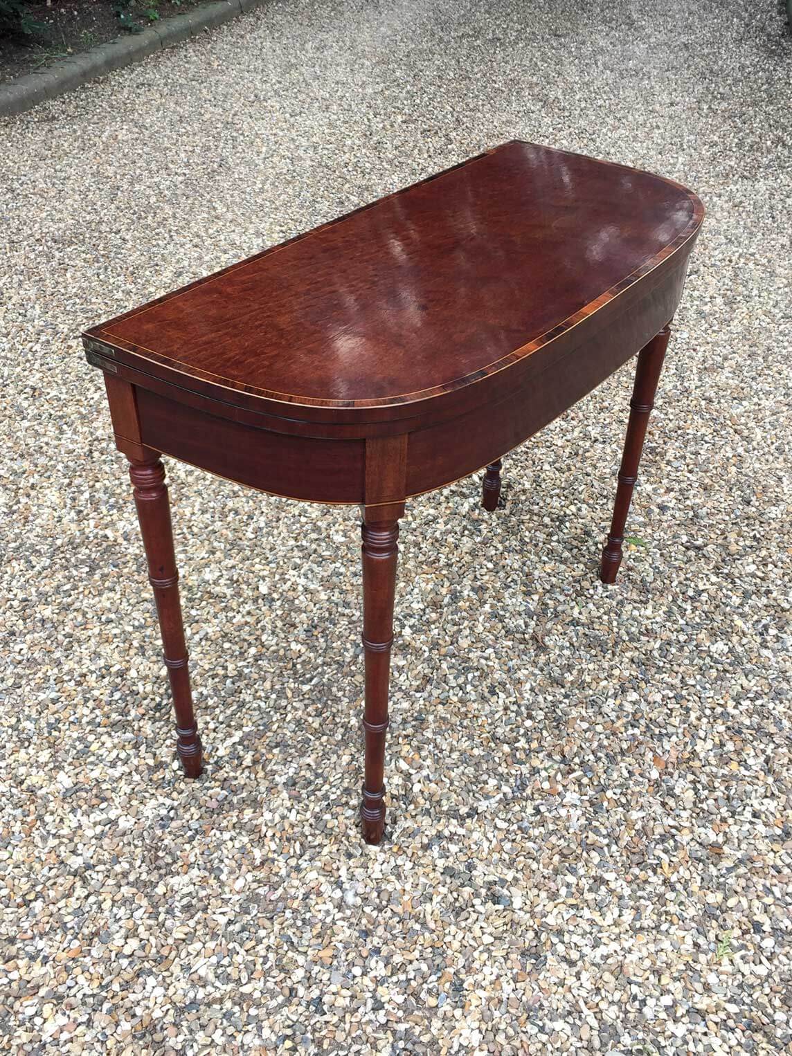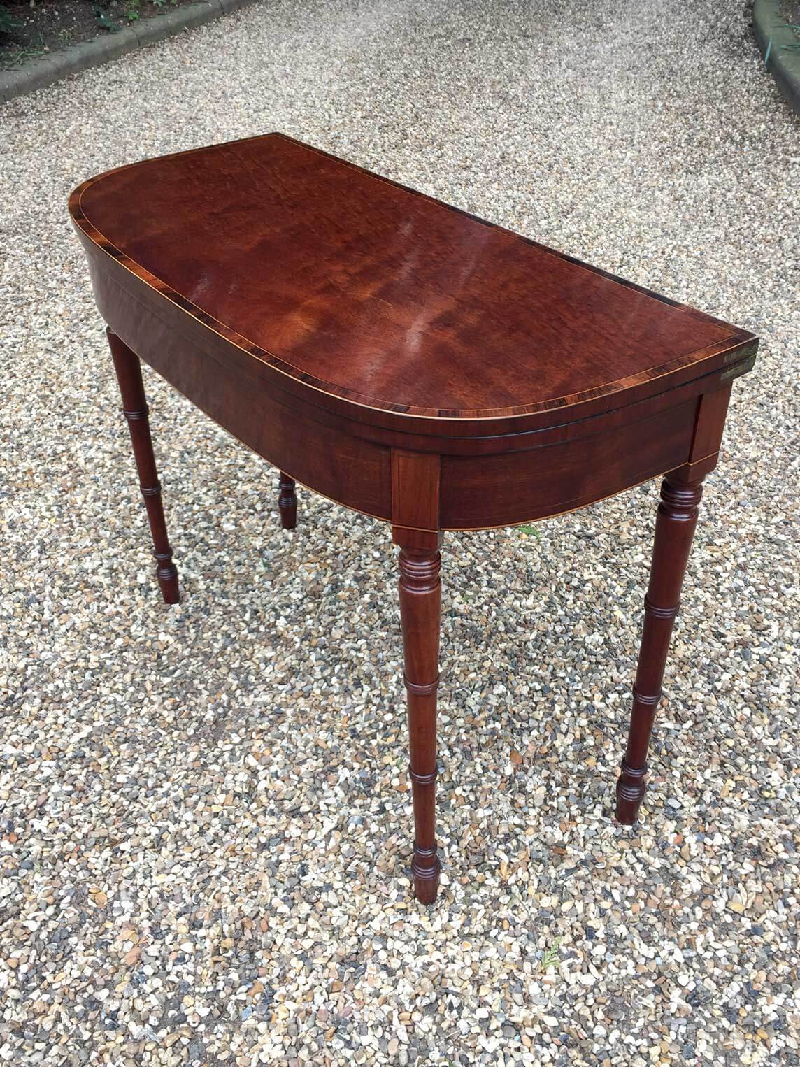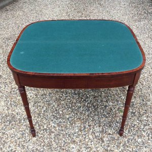 Georgian Plum Pudding Mahogany D-Shaped Card Table with inlay, crossbanded figured rosewood on the top with turned legs and original green baize inside.