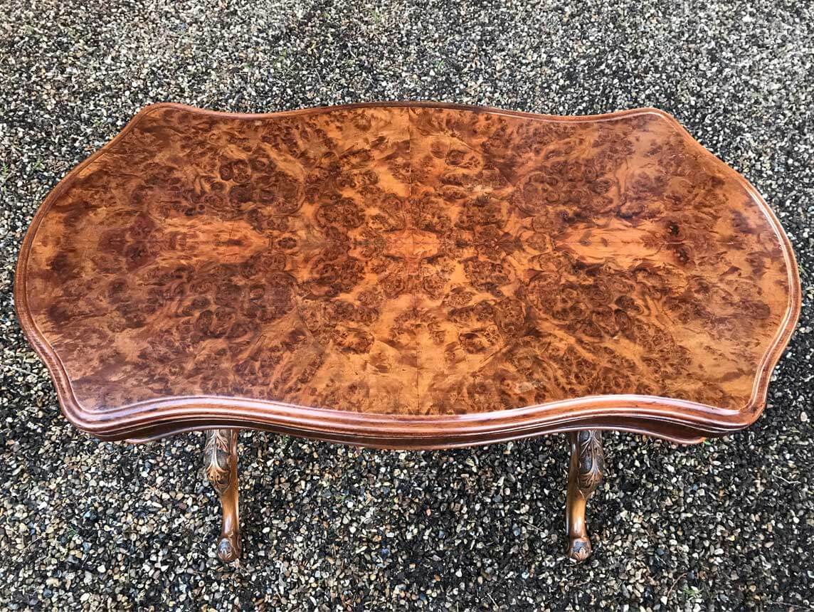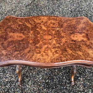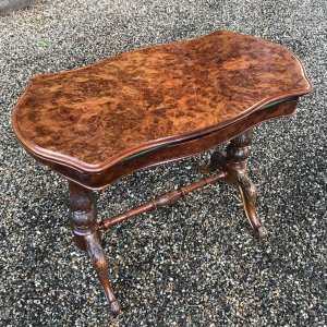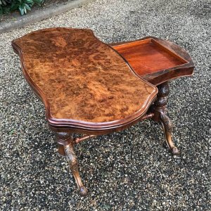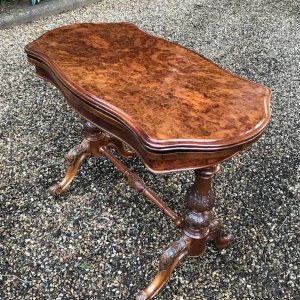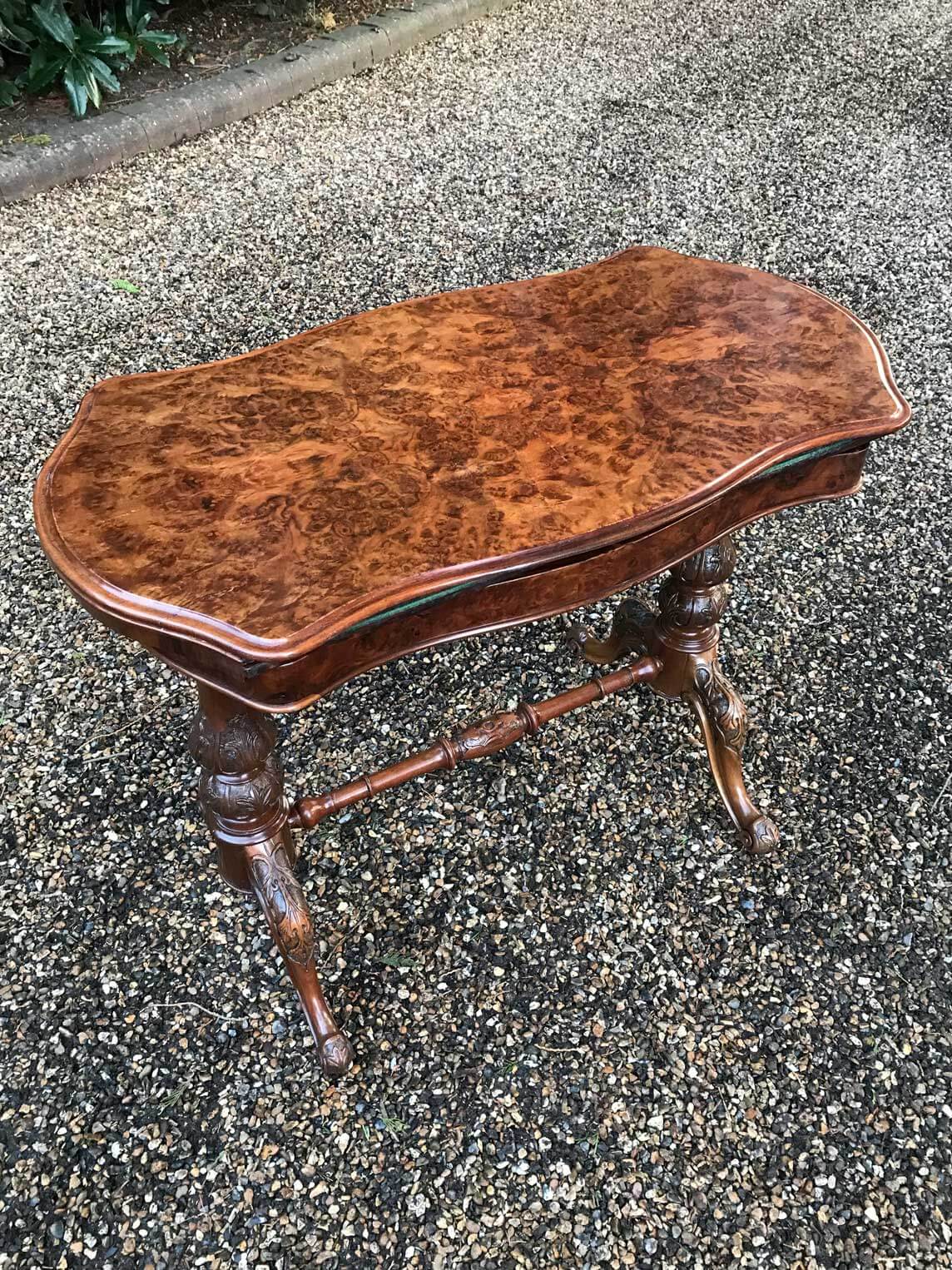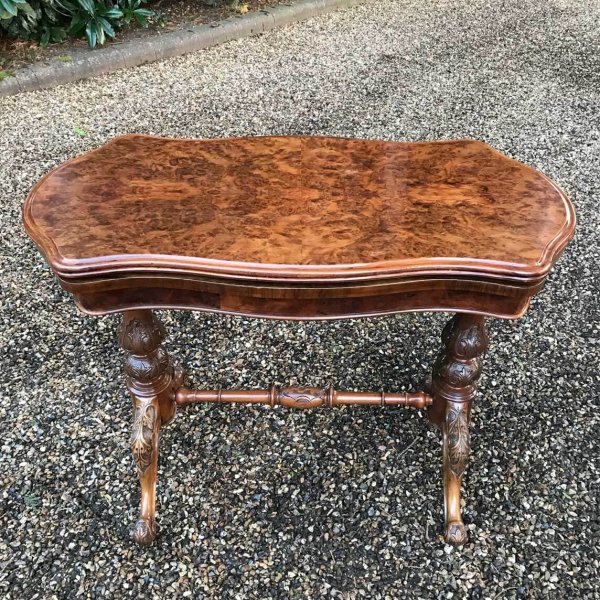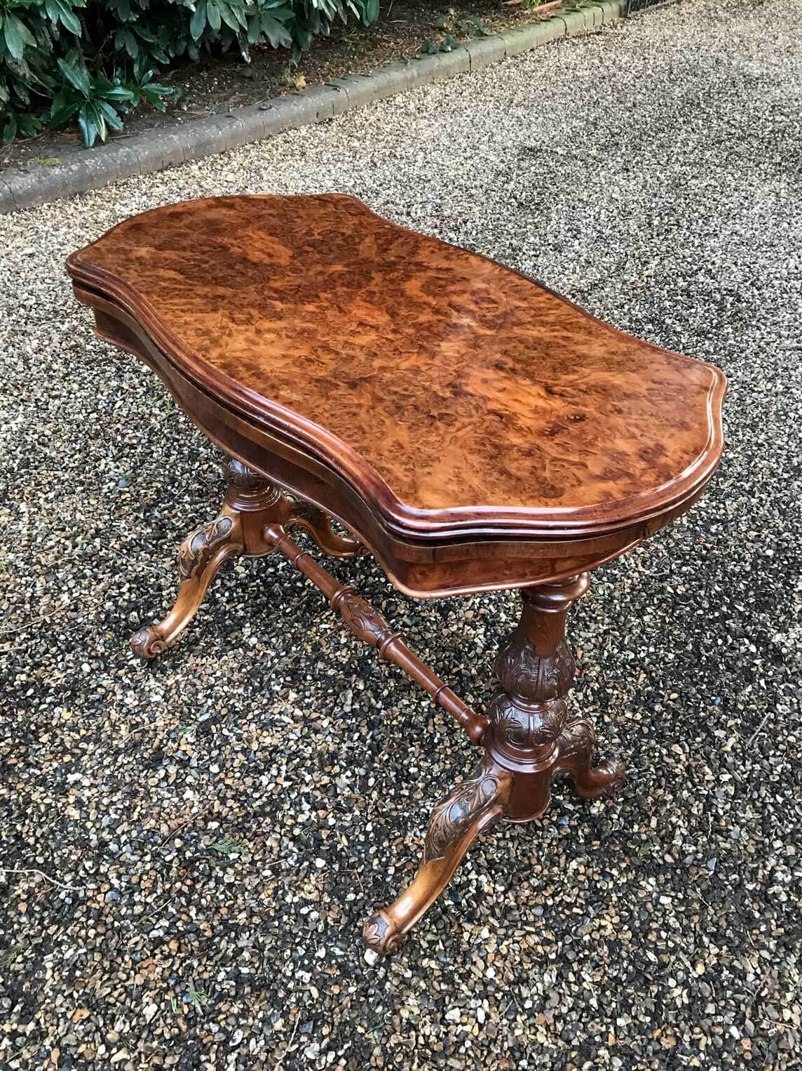 19th Century Victorian Burr Walnut Serpentine Card Table with quarter veneer highly figured burr walnut top and frieze, serpentine in shape with a round end and an inverted corner.