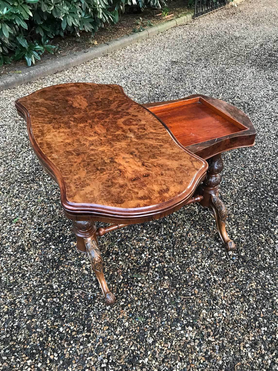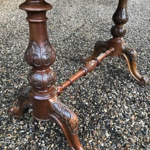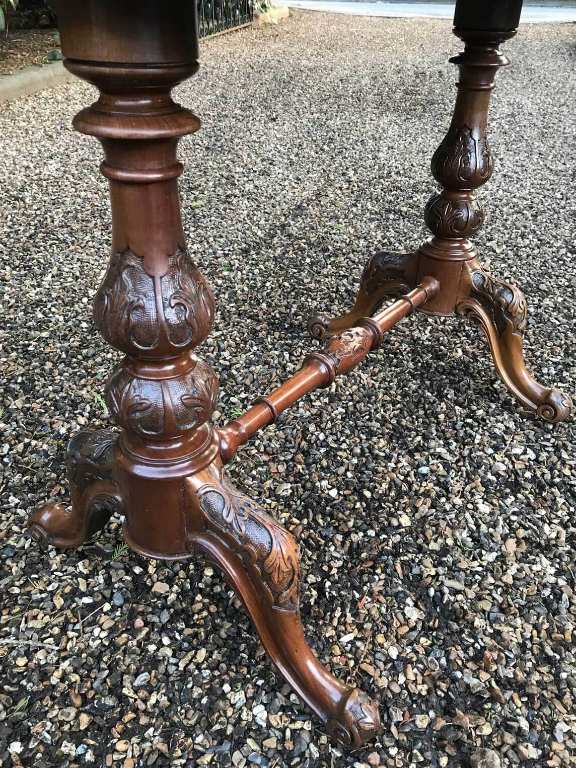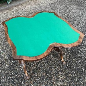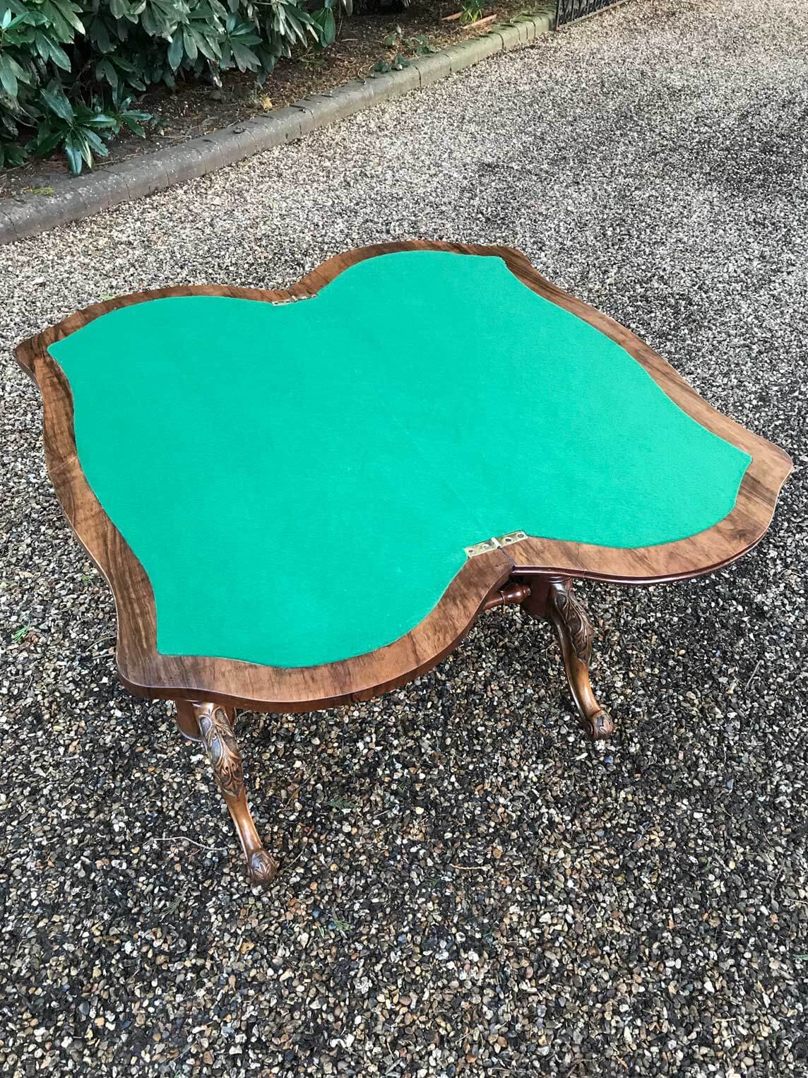 The turned supports are in solid walnut with finely carved gadrooned decoration to the lower turnings. The cabriole legs are well executed and proportioned and terminate with their original white china castors. The top rotates by 90 degrees and unfolds to convert to the card table.