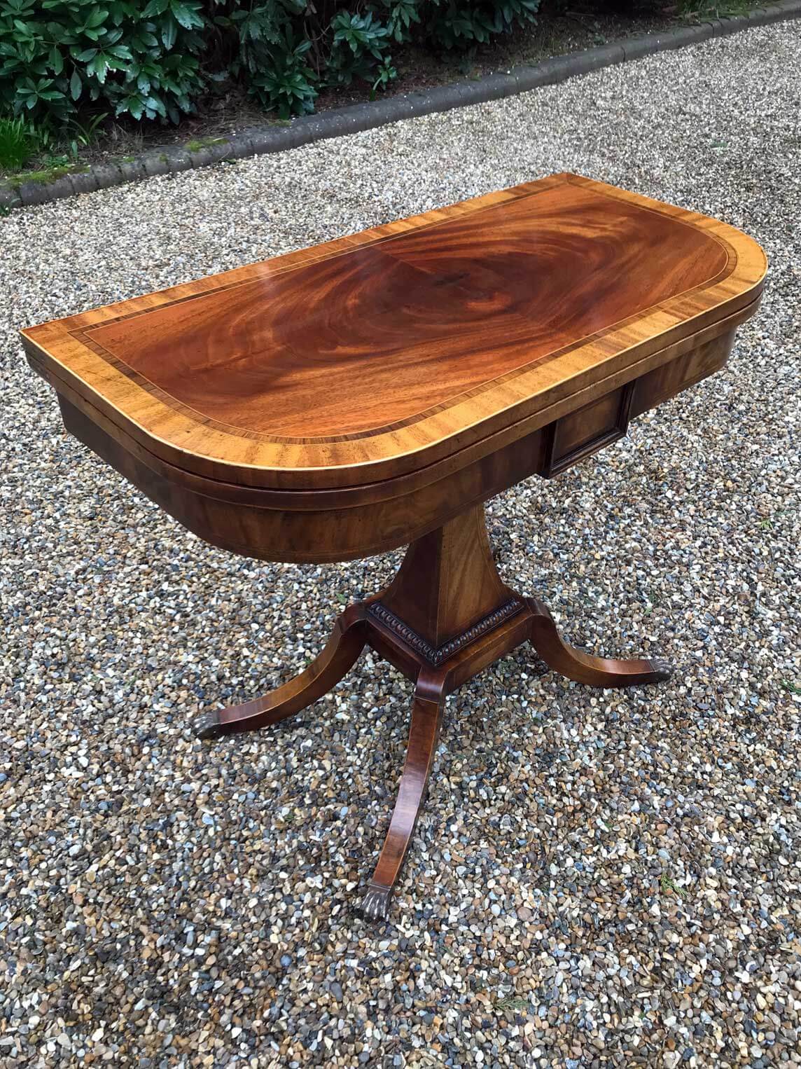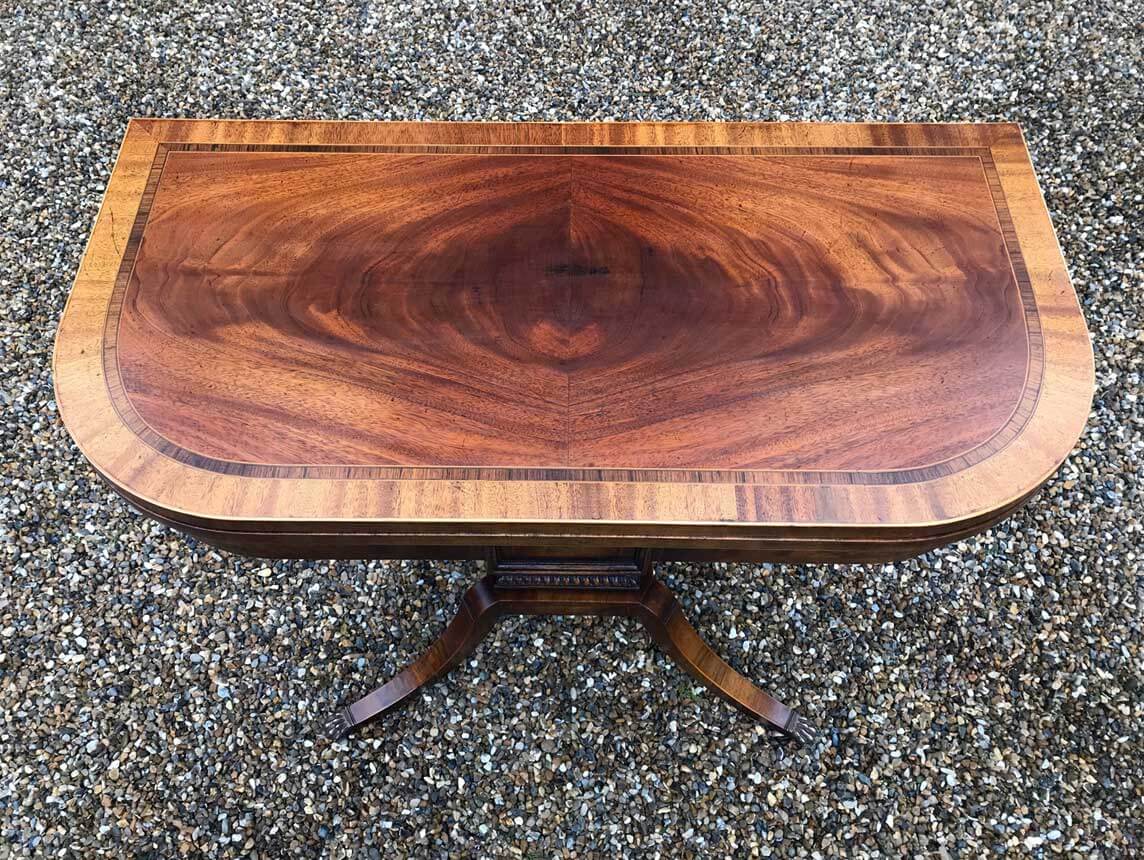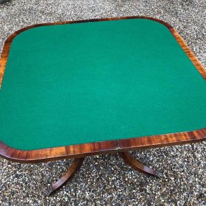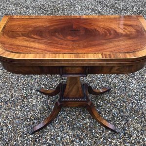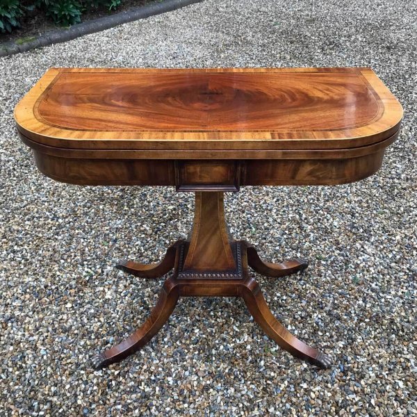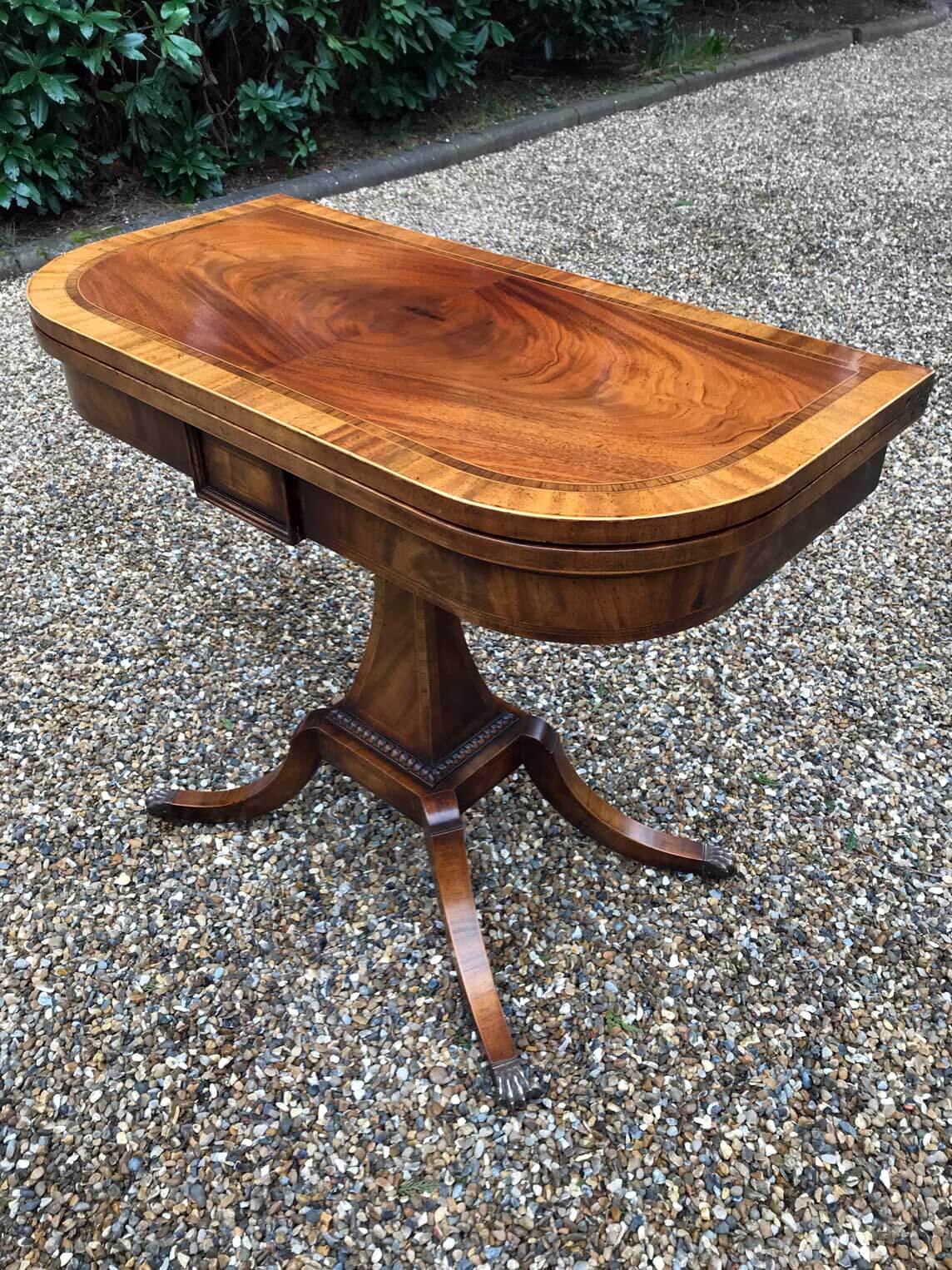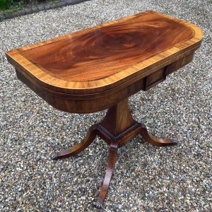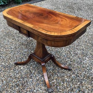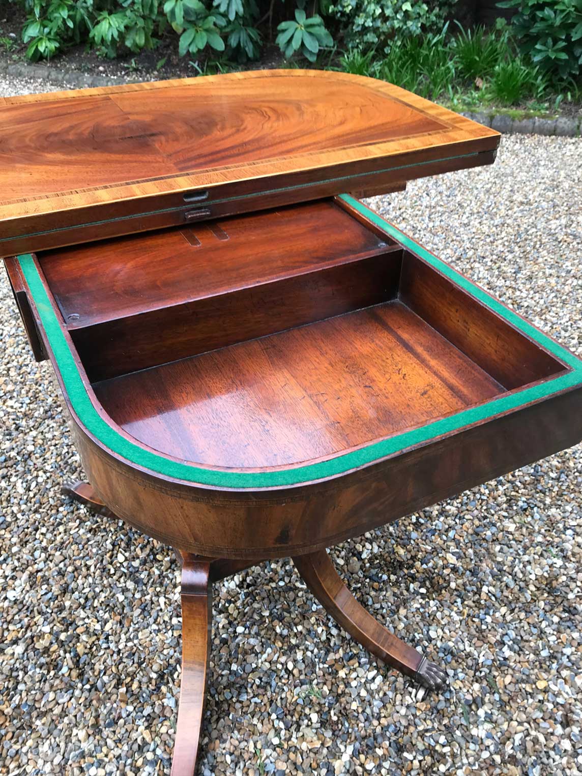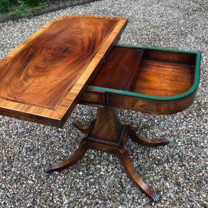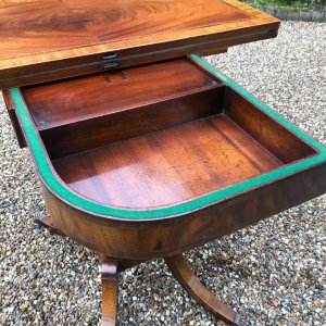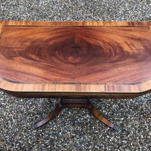 An original 19th Century Regency Inlaid Crossbanded D Shaped Mahogany Card Table with baize interior. Raised on a tempered chamfered column and splayed leg supports ending with brass claw feet and castors. The top swivels open to become a card table.