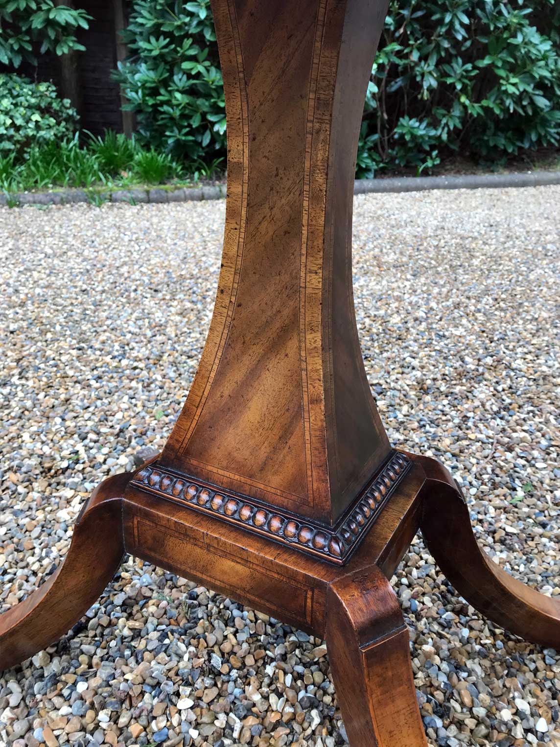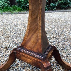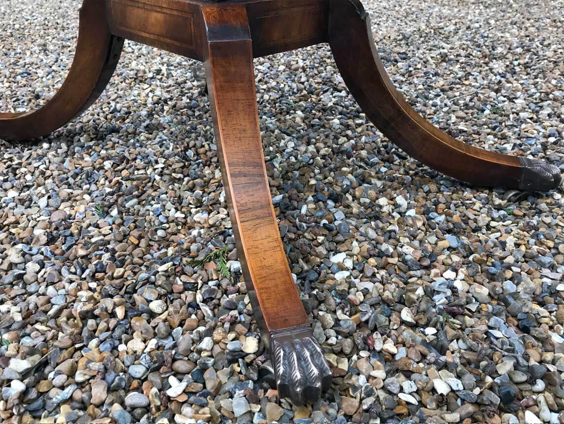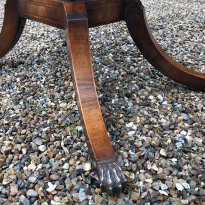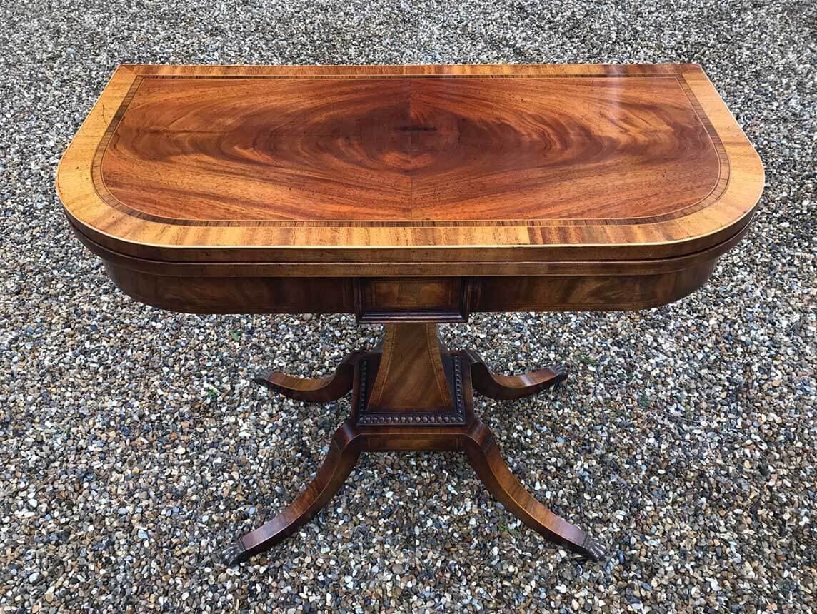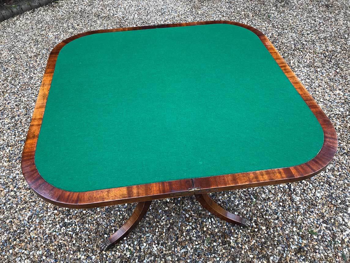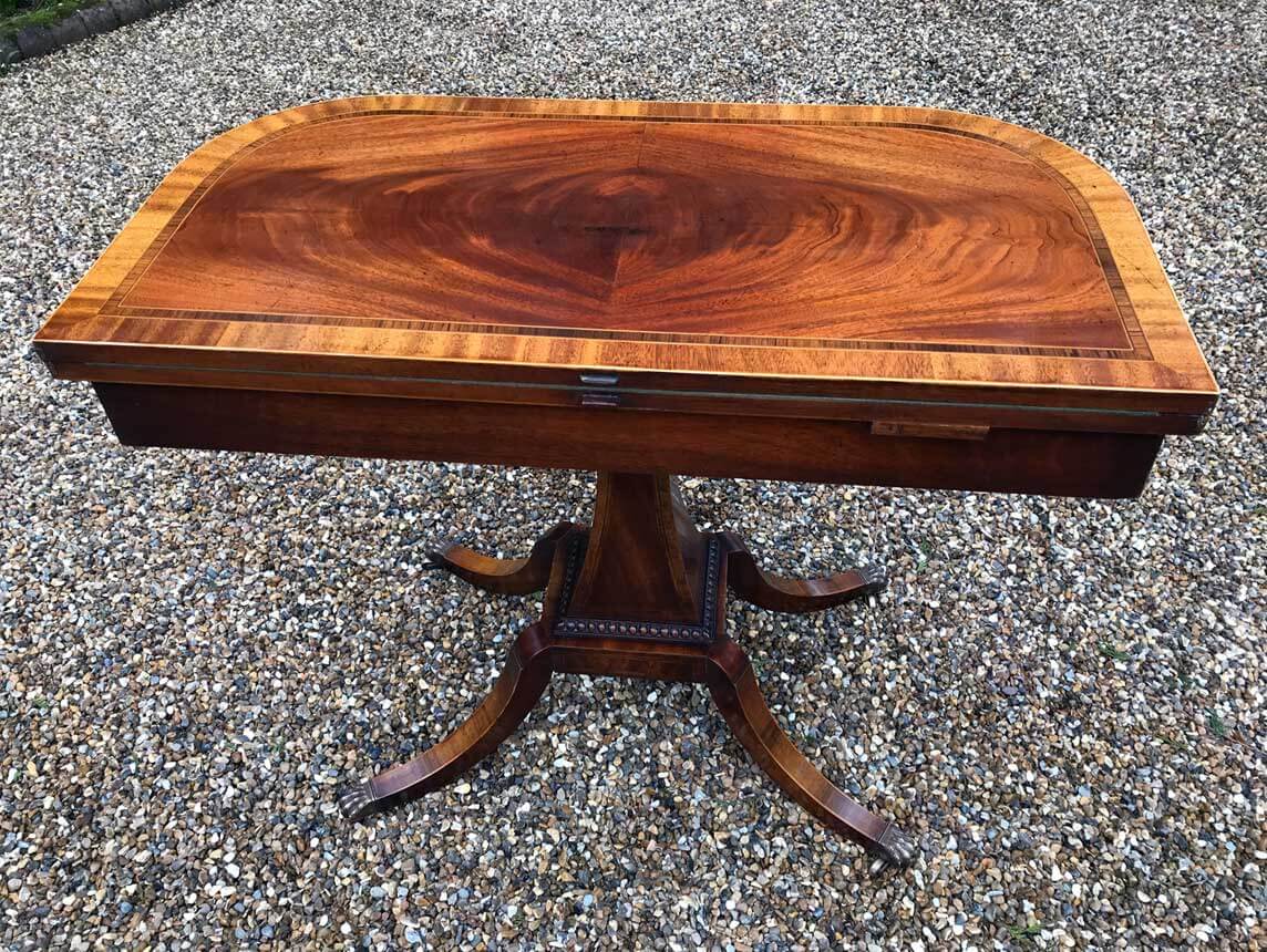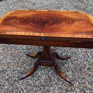 An original 19th Century Regency Inlaid Crossbanded D Shaped Mahogany Card Table with baize interior. Raised on a tempered chamfered column and splayed leg supports ending with brass claw feet and castors. The top swivels open to become a card table.