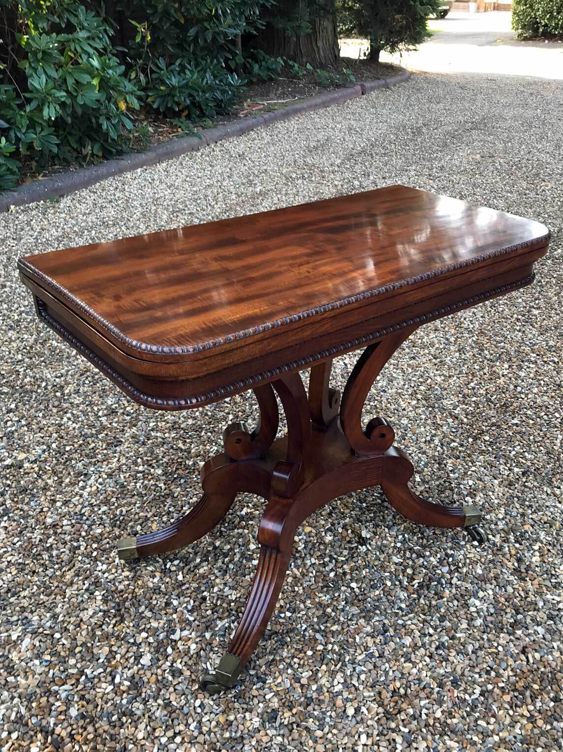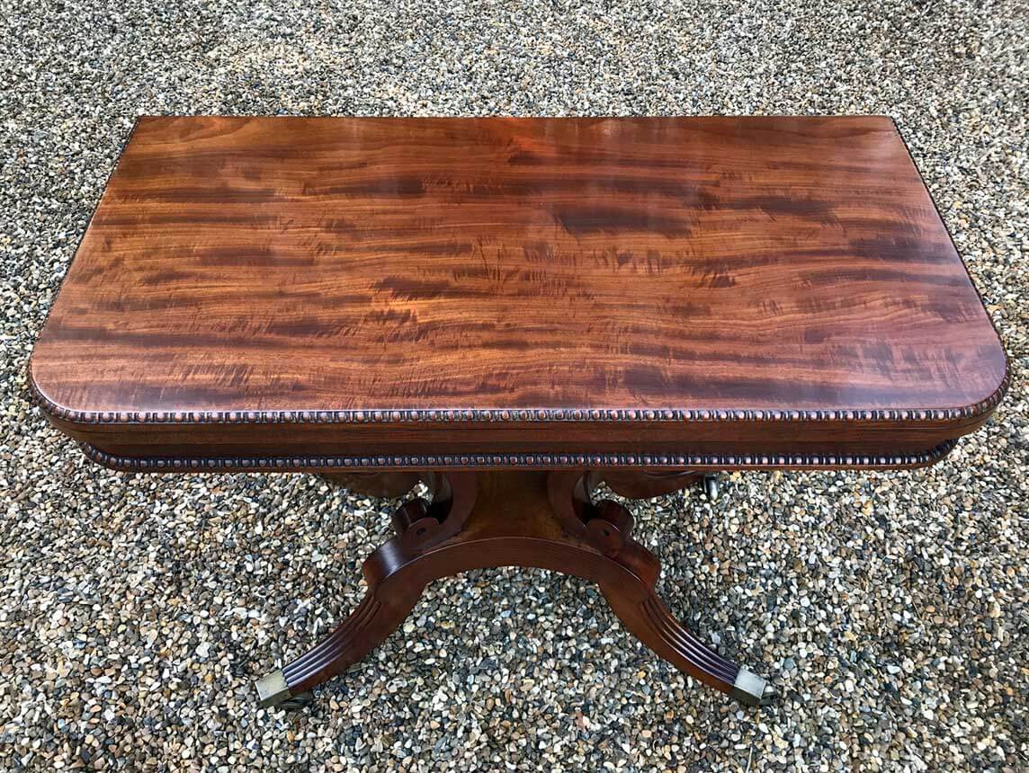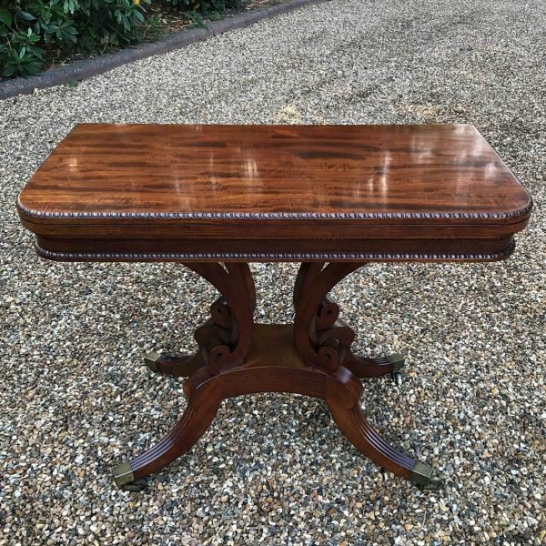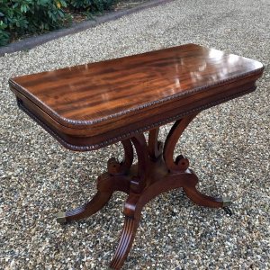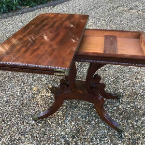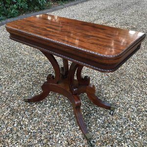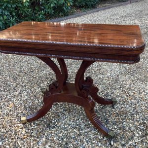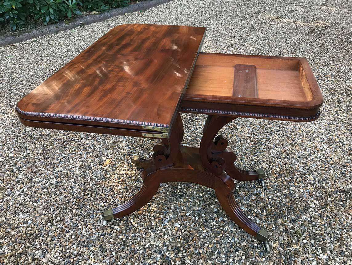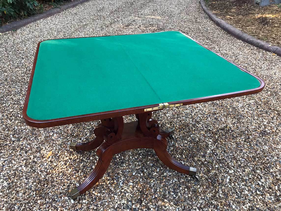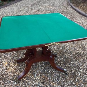 An original 19th Century Regency Mahogany Card Table with baize interior. With four central splayed columns and four splayed feet on original brass castors. The top swivels open to become a card table.