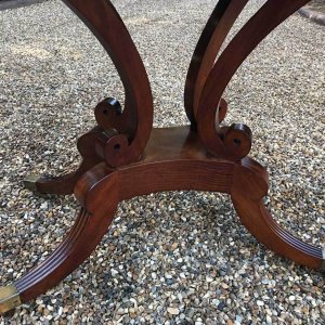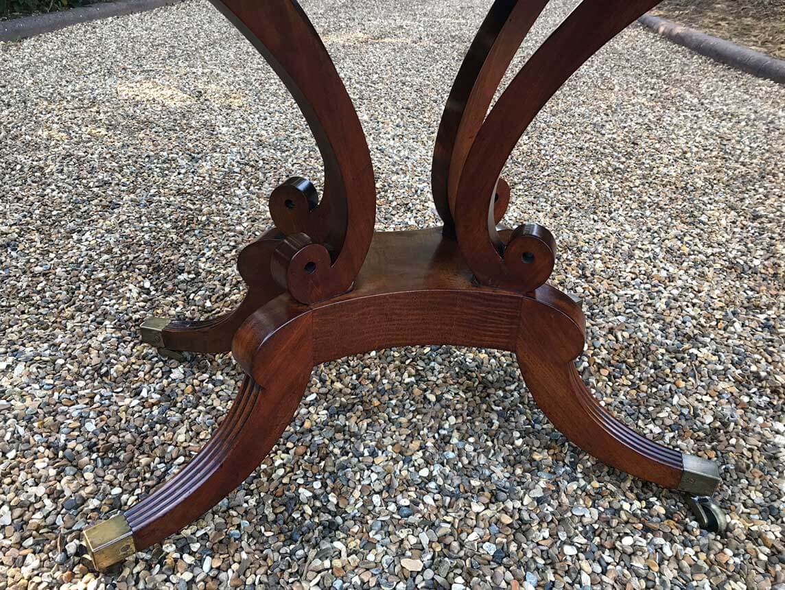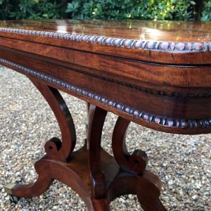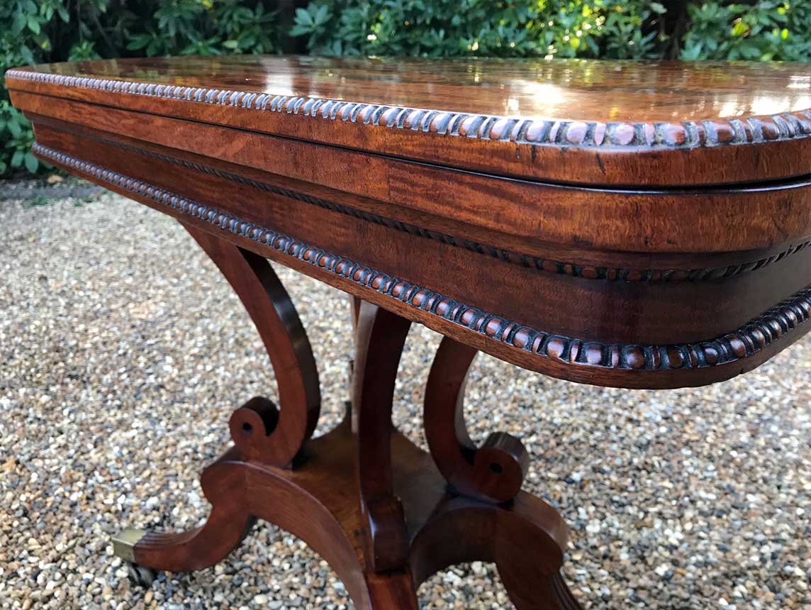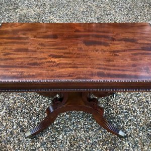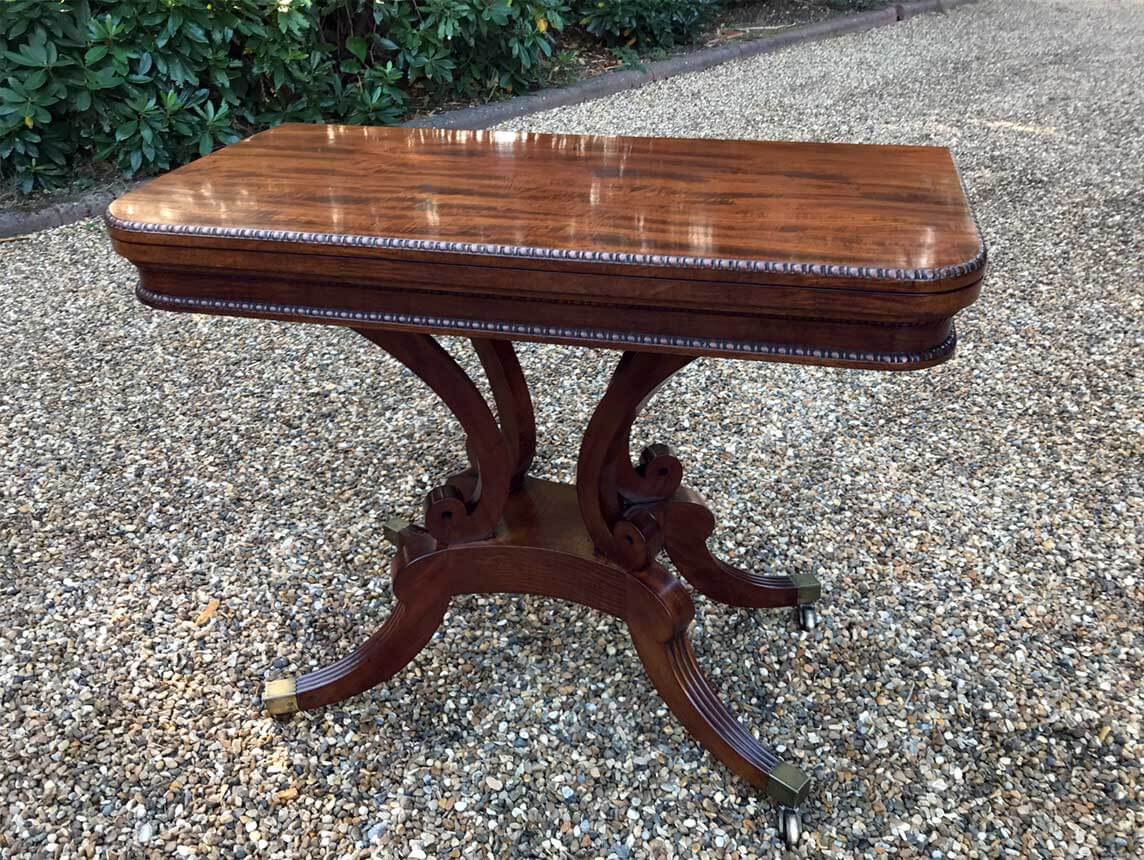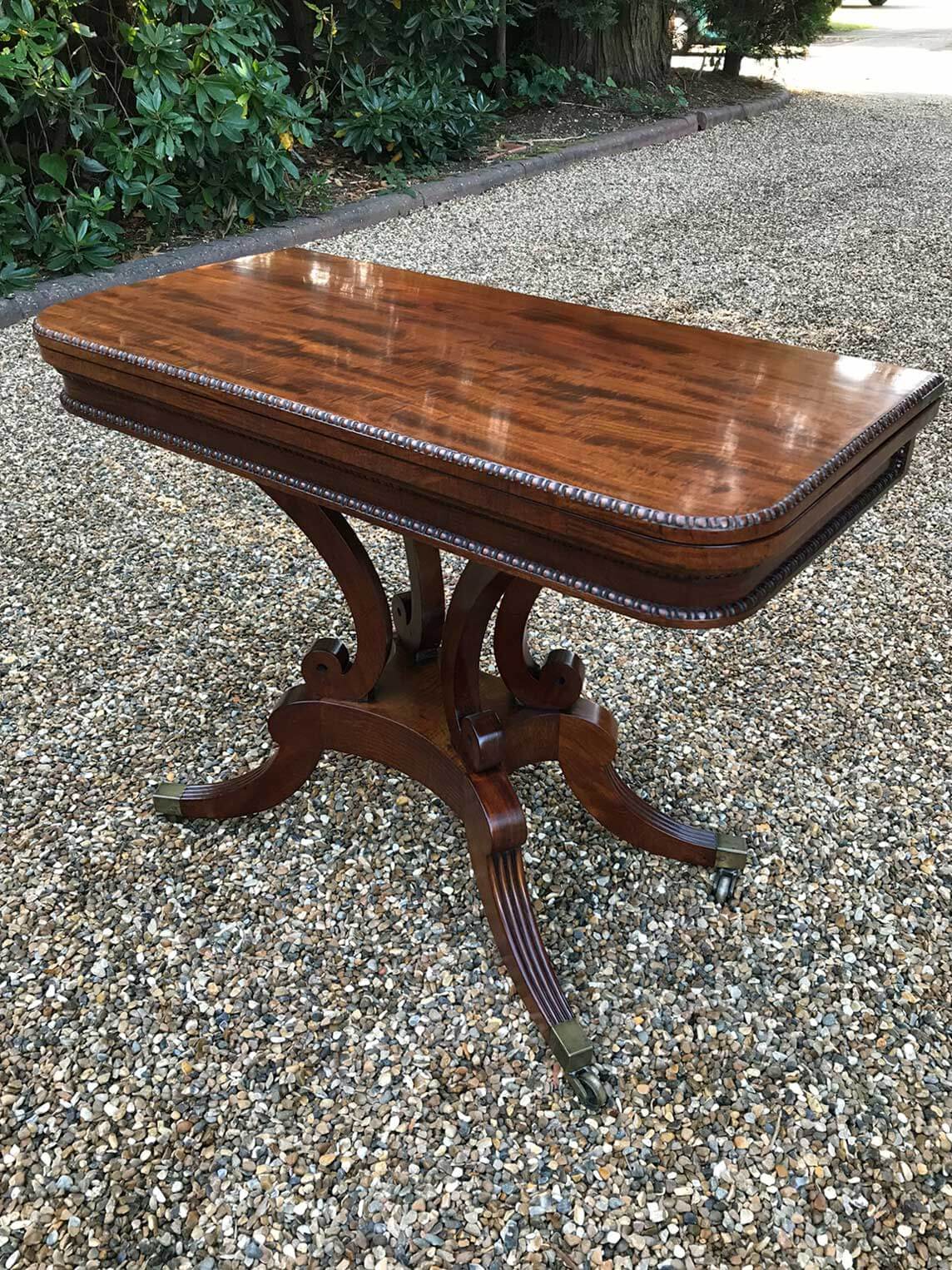 An original 19th Century Regency Mahogany Card Table with baize interior. With four central splayed columns and four splayed feet on original brass castors. The top swivels open to become a card table.