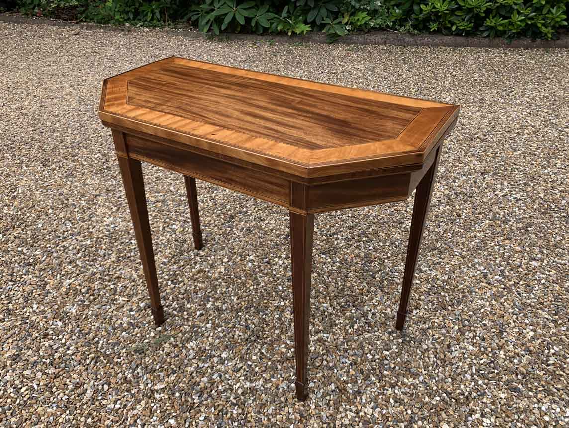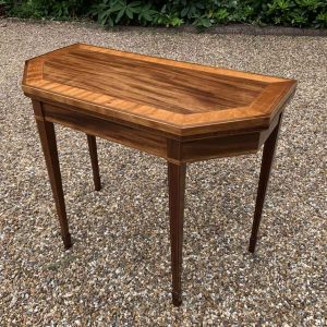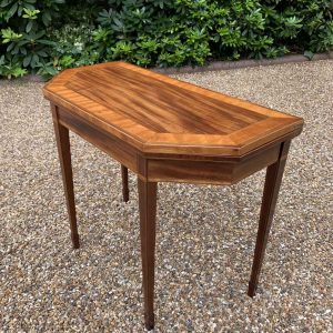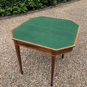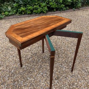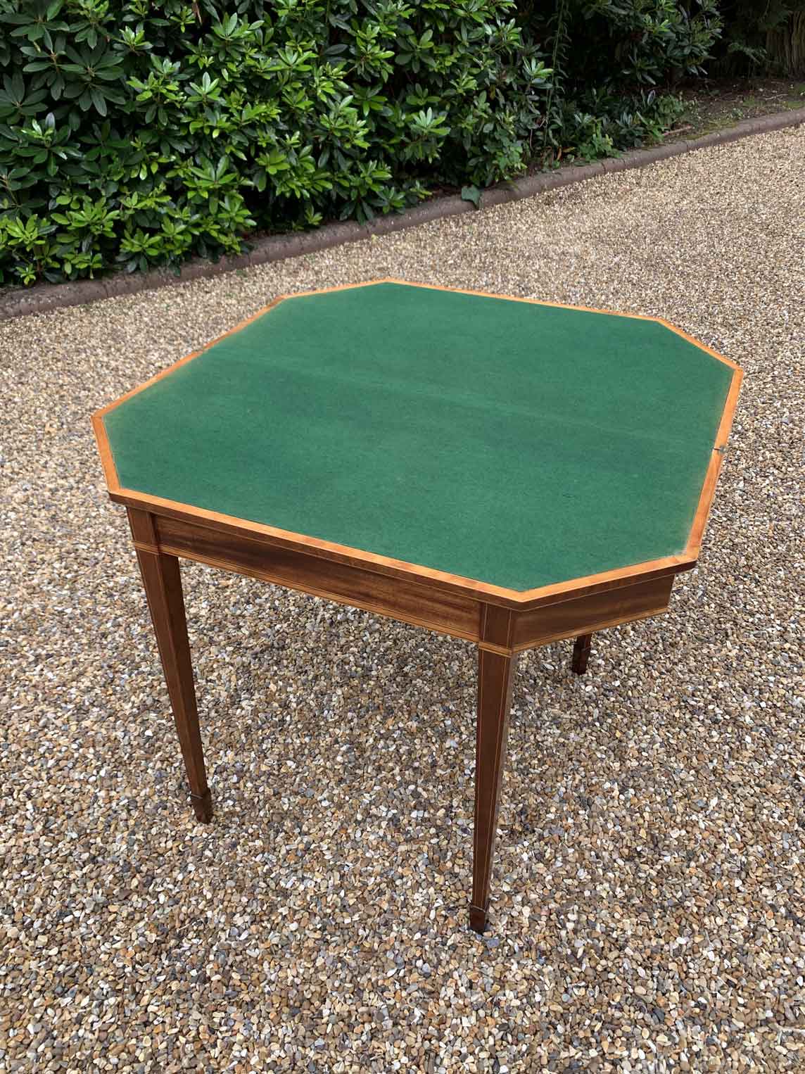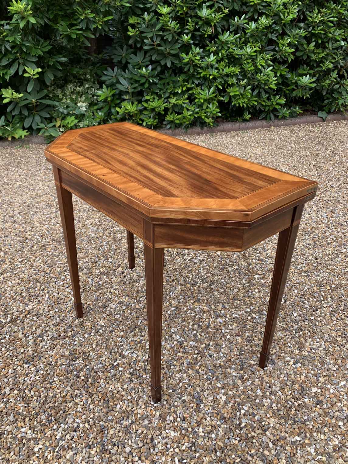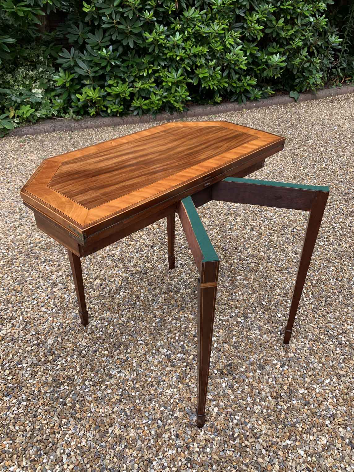 George III Mahogany & Satinwood fold-over card table with cross banding throughout, on square tapering legs with green baize inside.