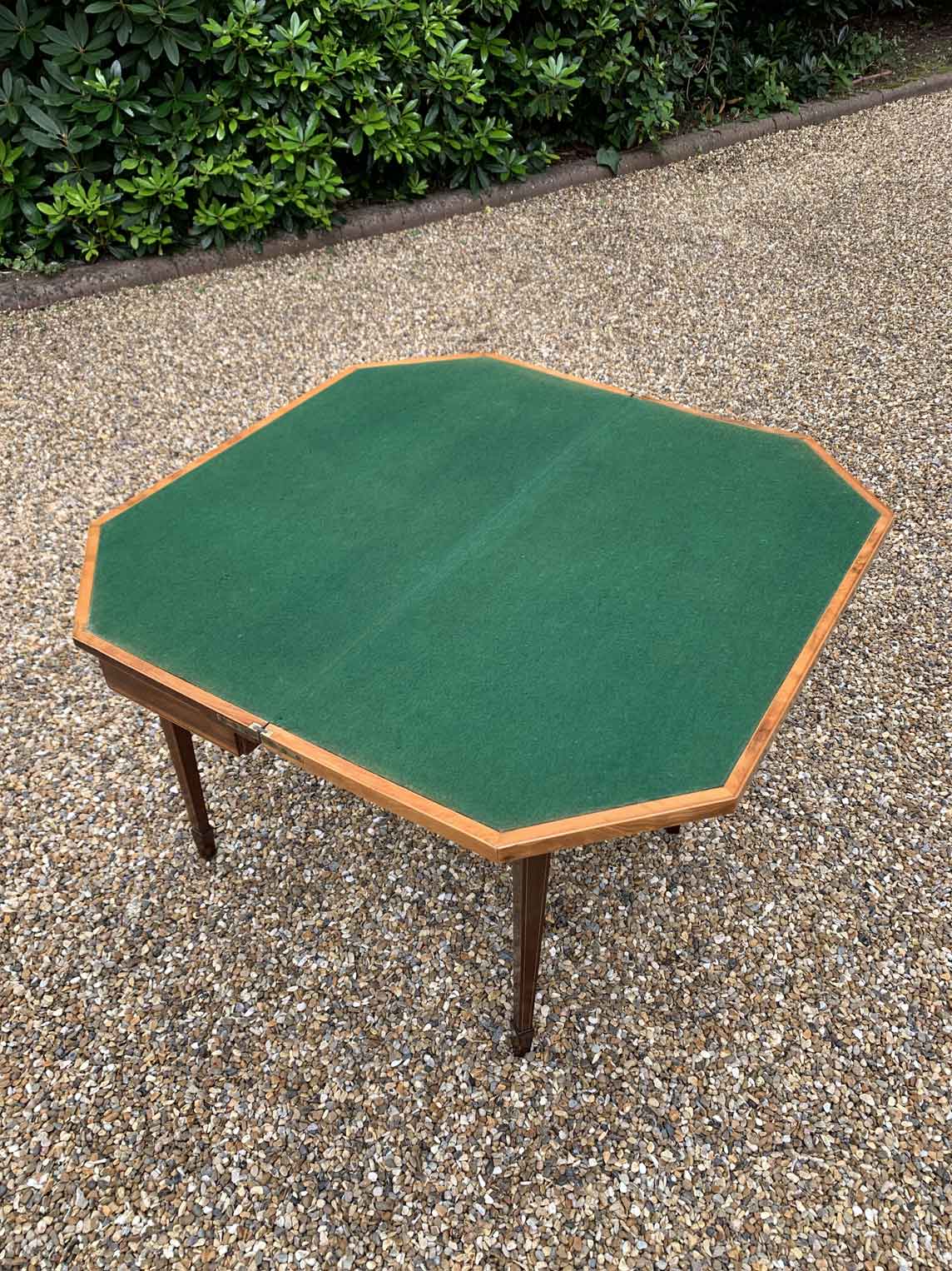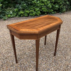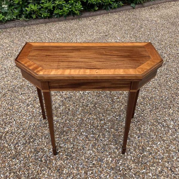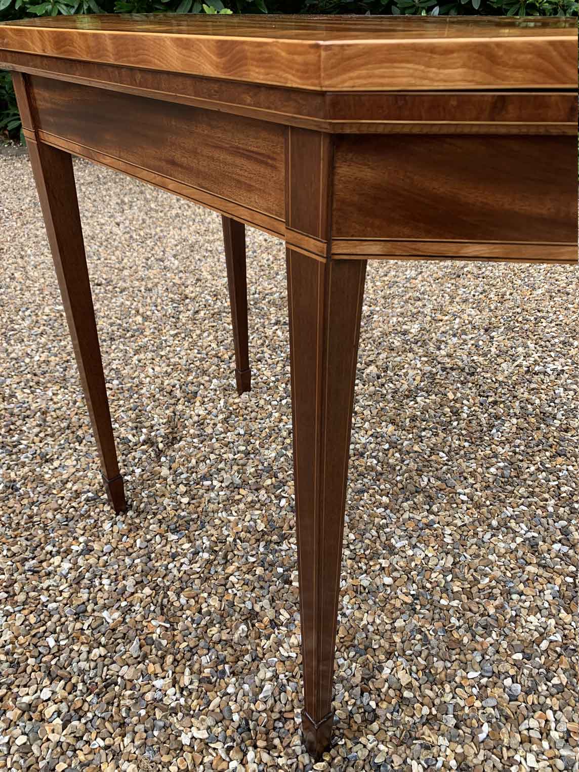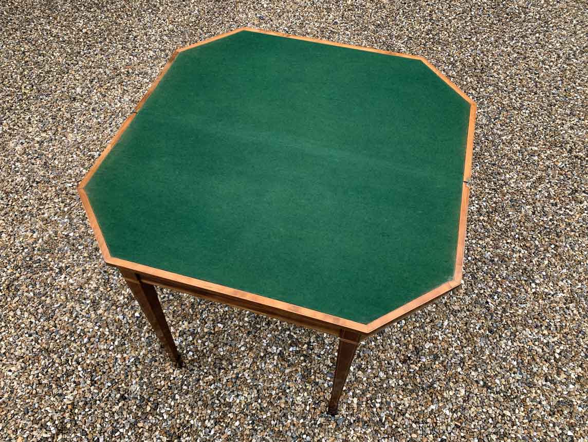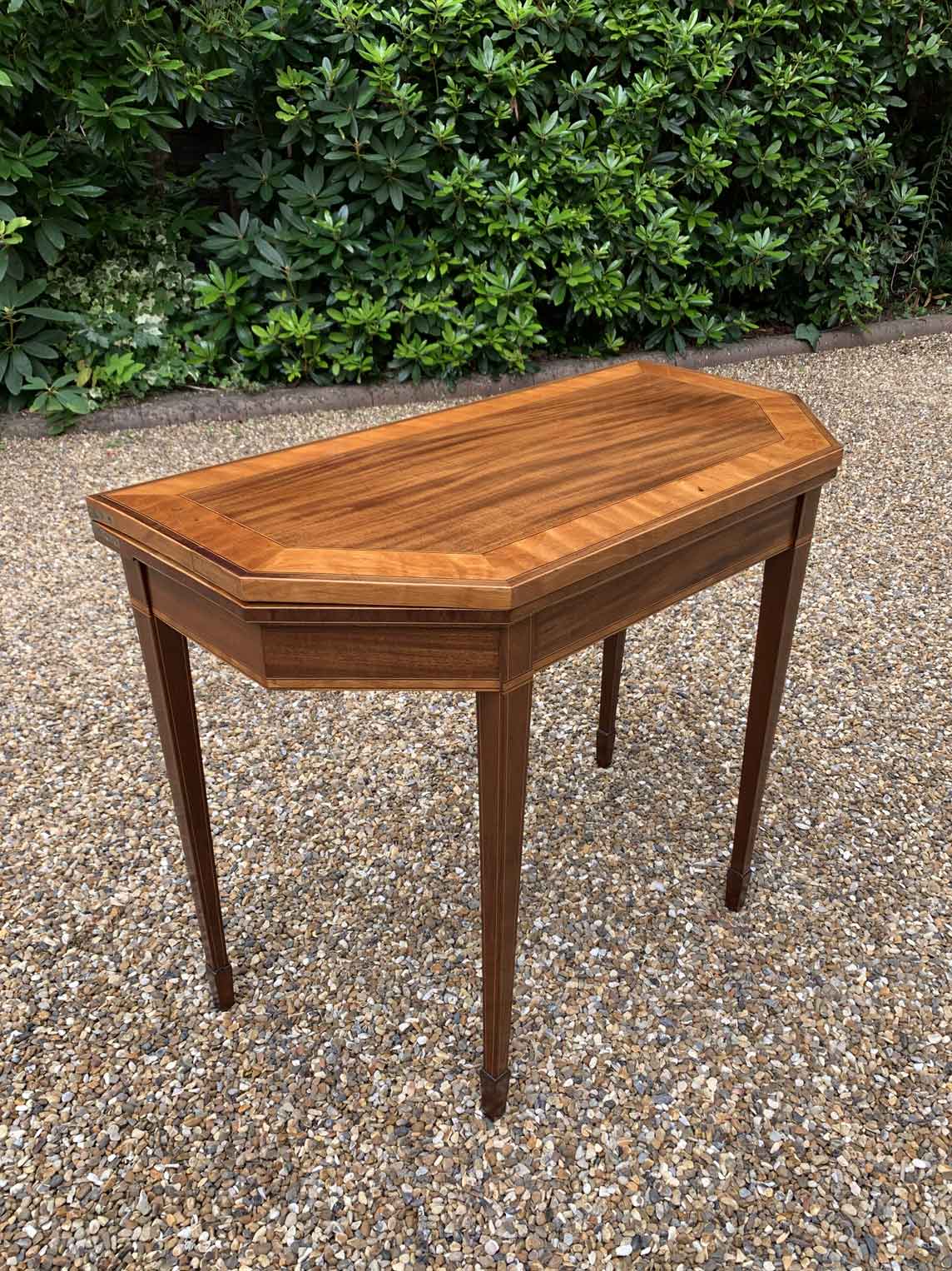 George III Mahogany & Satinwood fold-over card table with cross banding throughout, on square tapering legs with green baize inside.