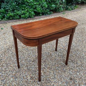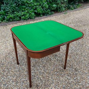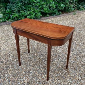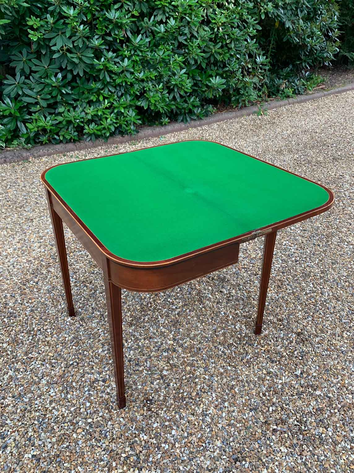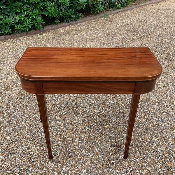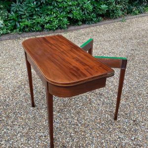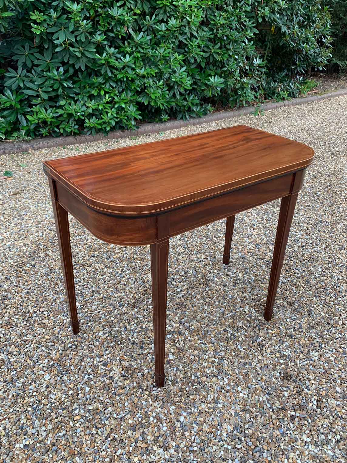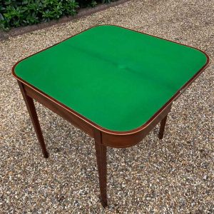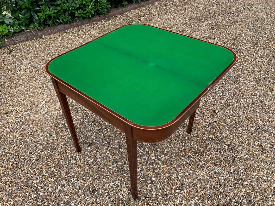Georgian Mahogany Inlaid D-Shaped Card Table with inlay and banding, on square tapering legs and spade feet with a green baize inside.