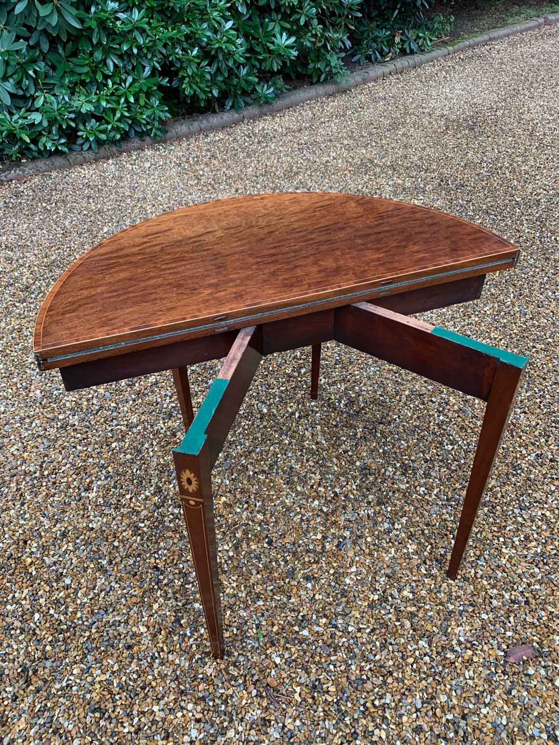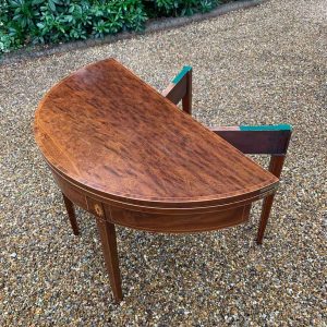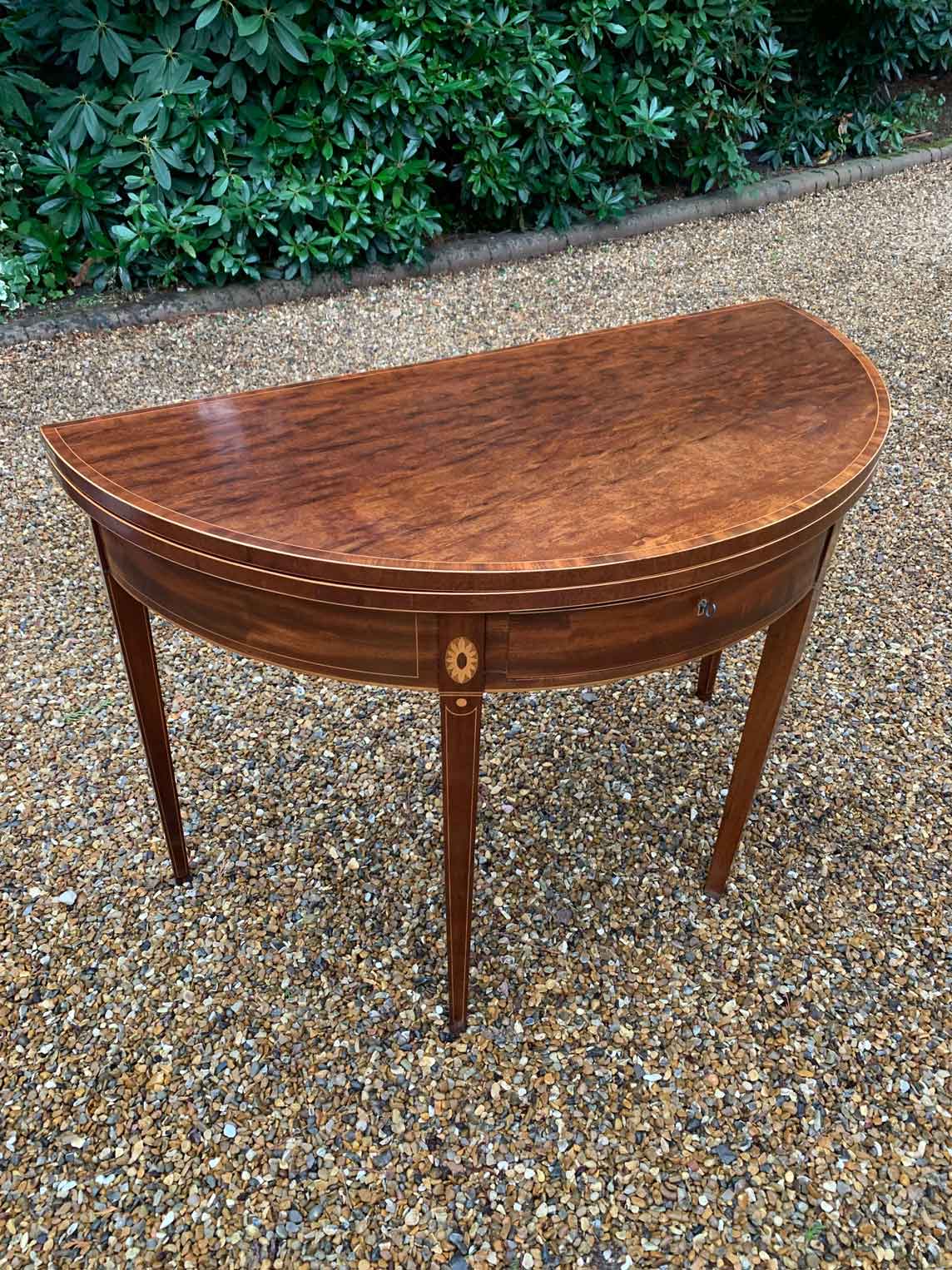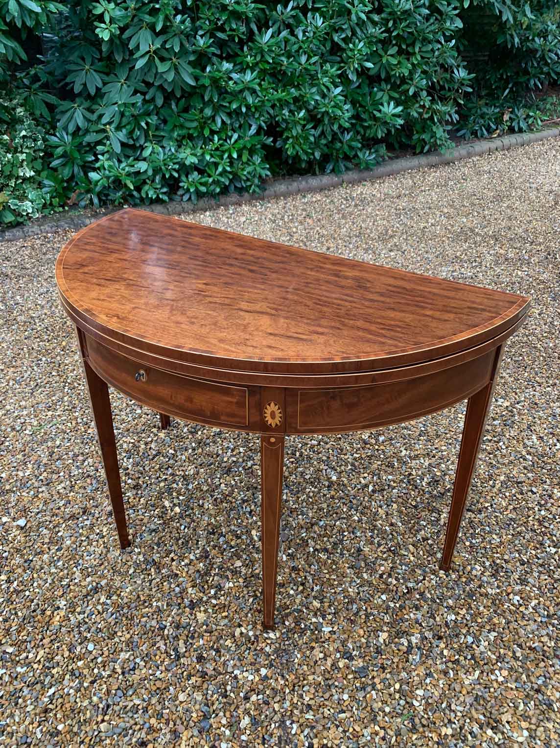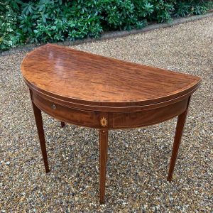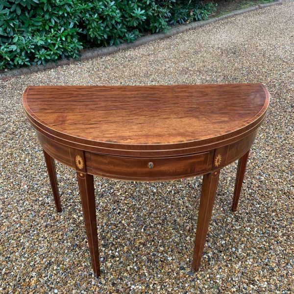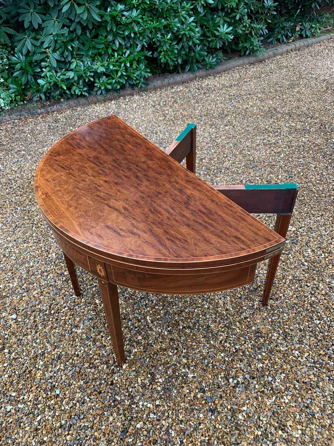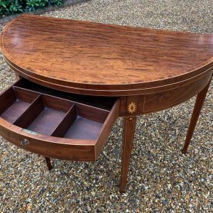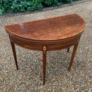 George III Mahogany (Plum Pudding) Demi Lune Card Table with cross banding and inlay throughout. The two rear legs swing open to reveal a baize, also comes with a middle centred drawer and fitted interior and key, raised on mahogany square tapering legs.