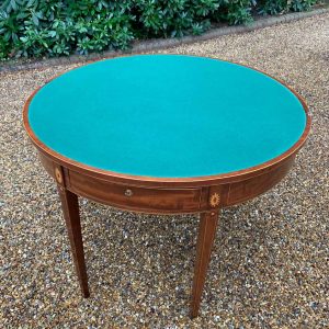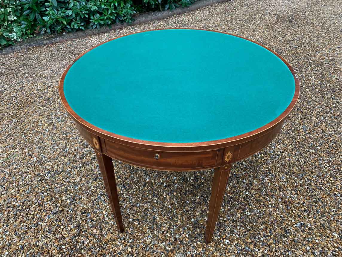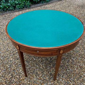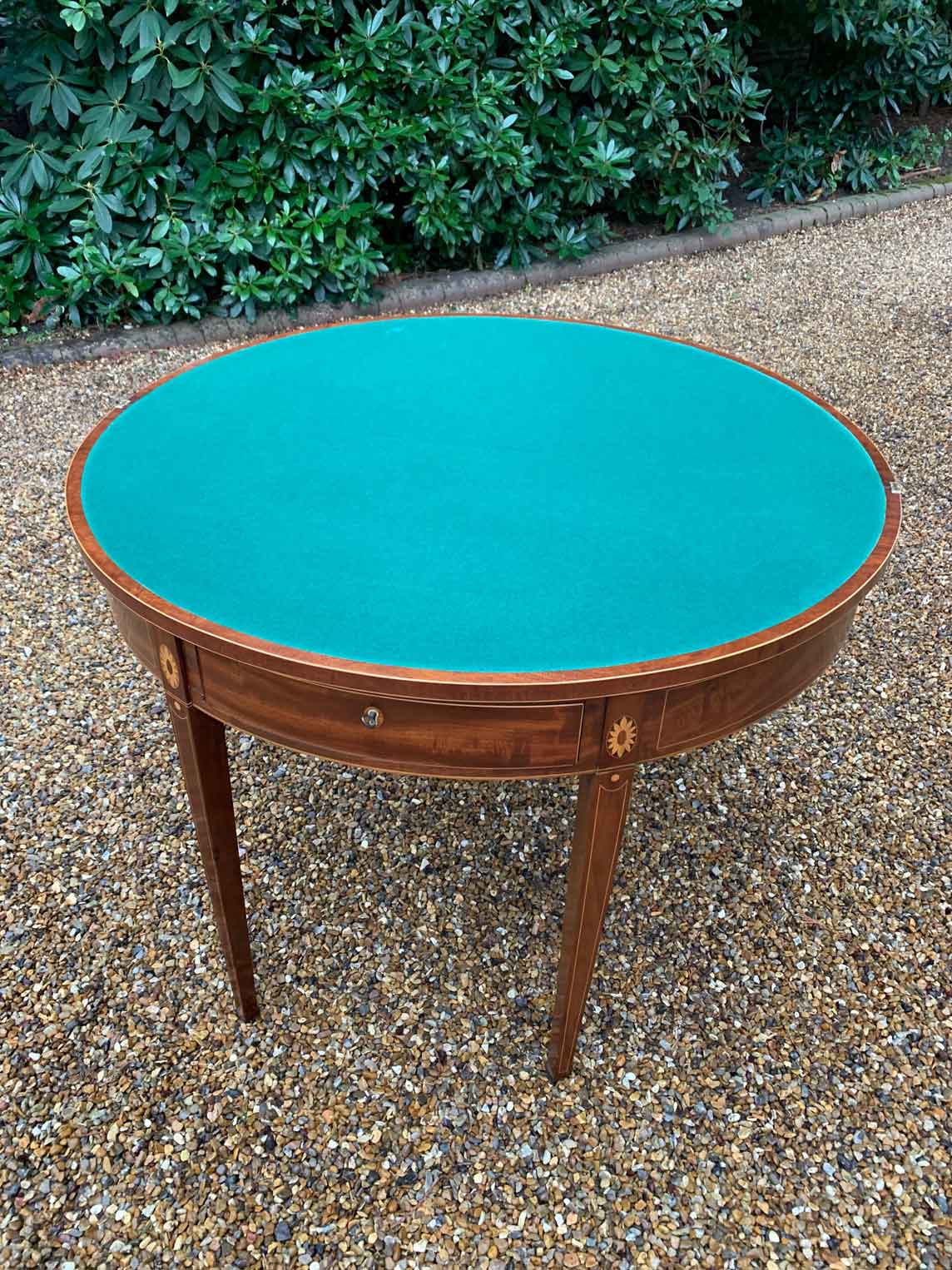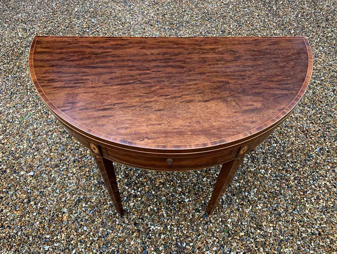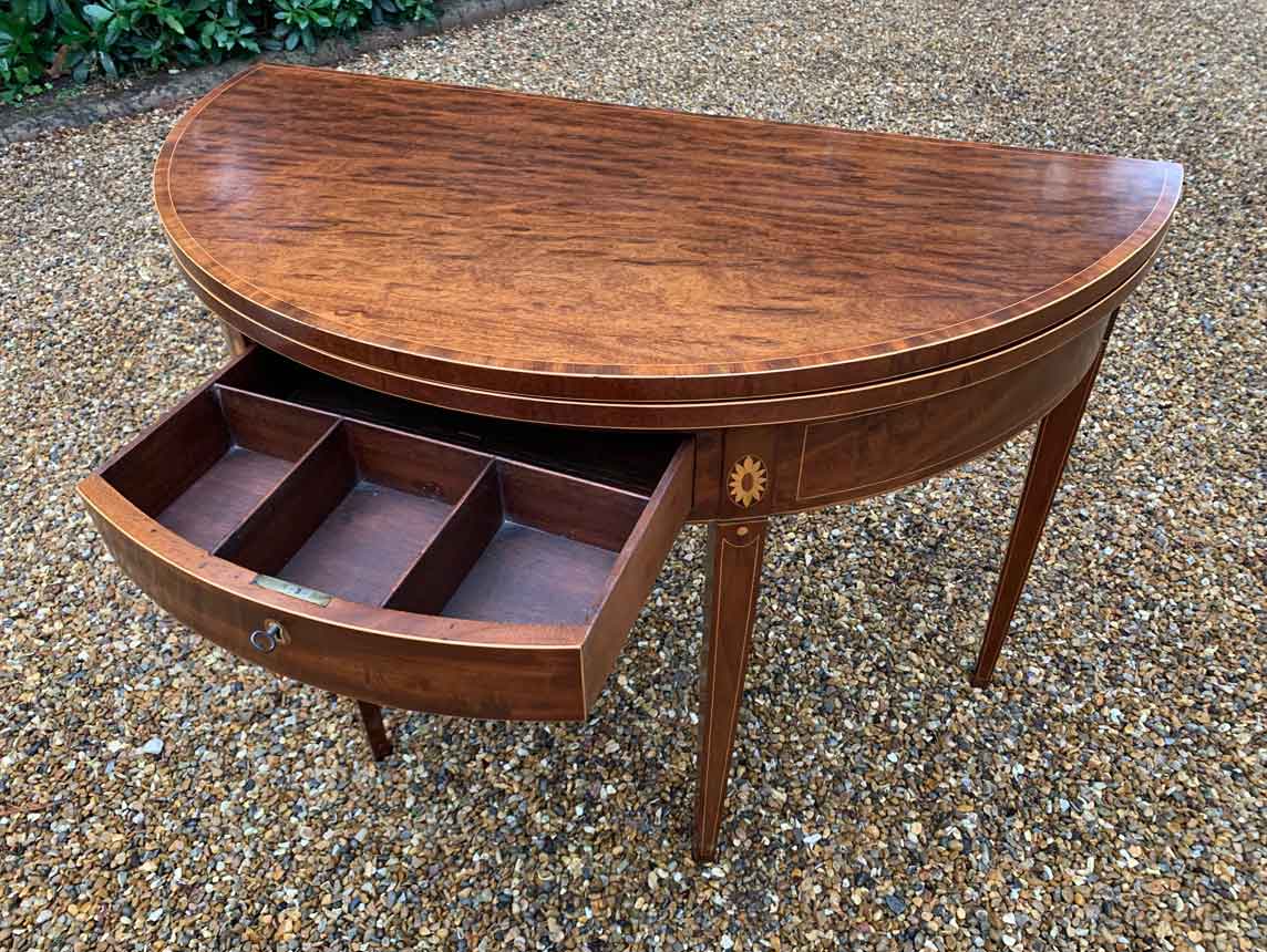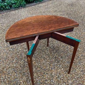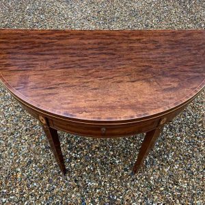 George III Mahogany (Plum Pudding) Demi Lune Card Table with cross banding and inlay throughout. The two rear legs swing open to reveal a baize, also comes with a middle centred drawer and fitted interior and key, raised on mahogany square tapering legs.