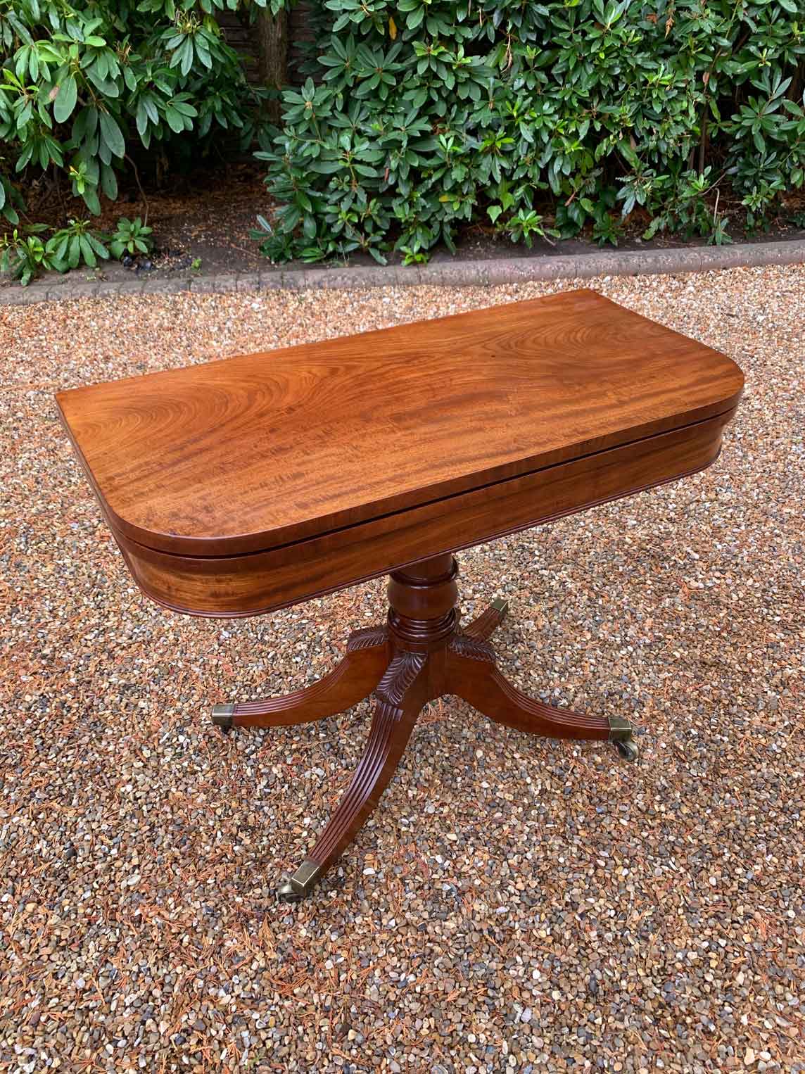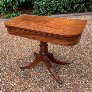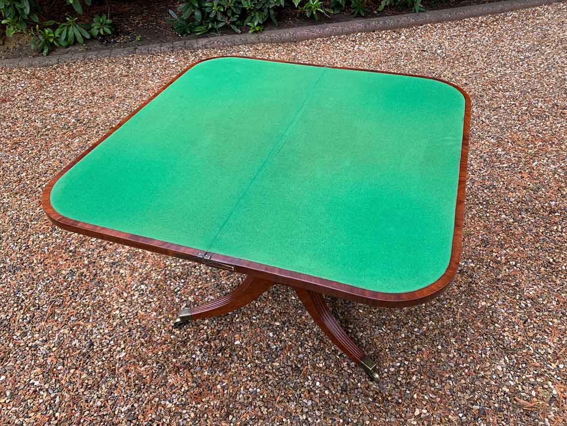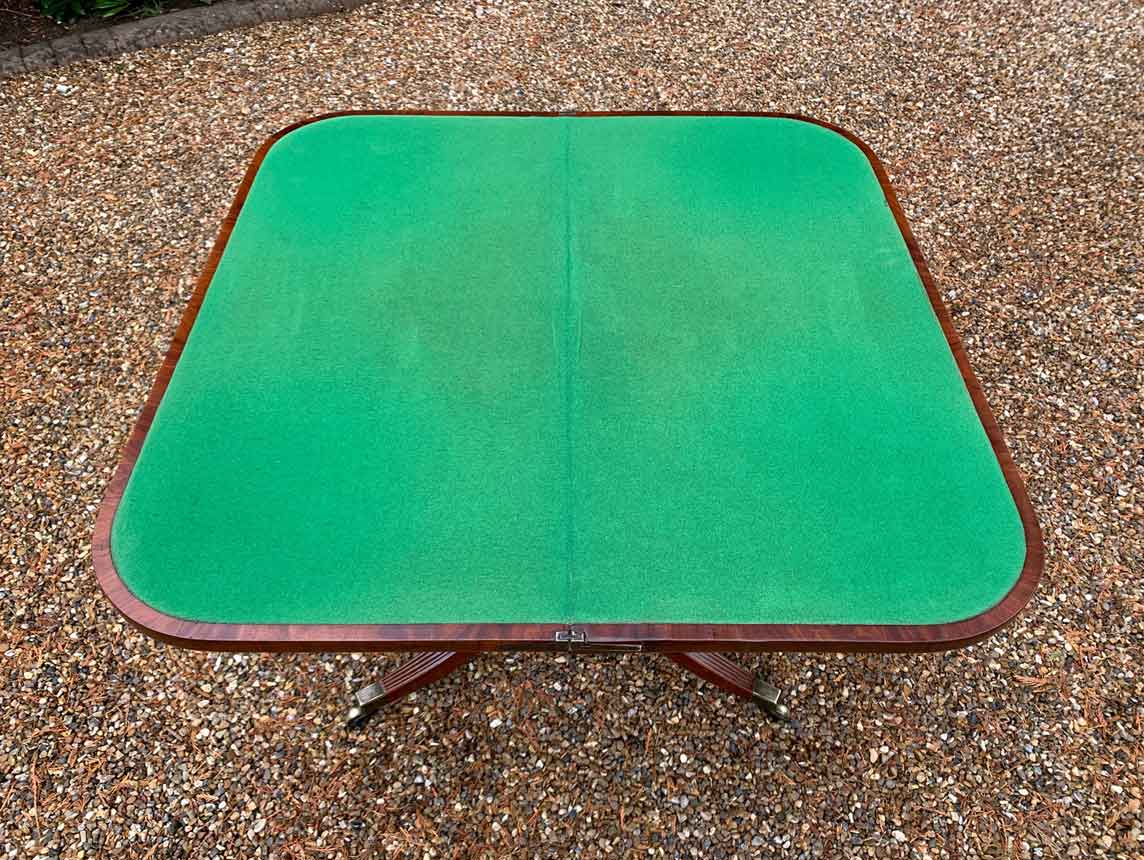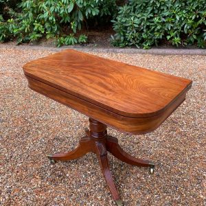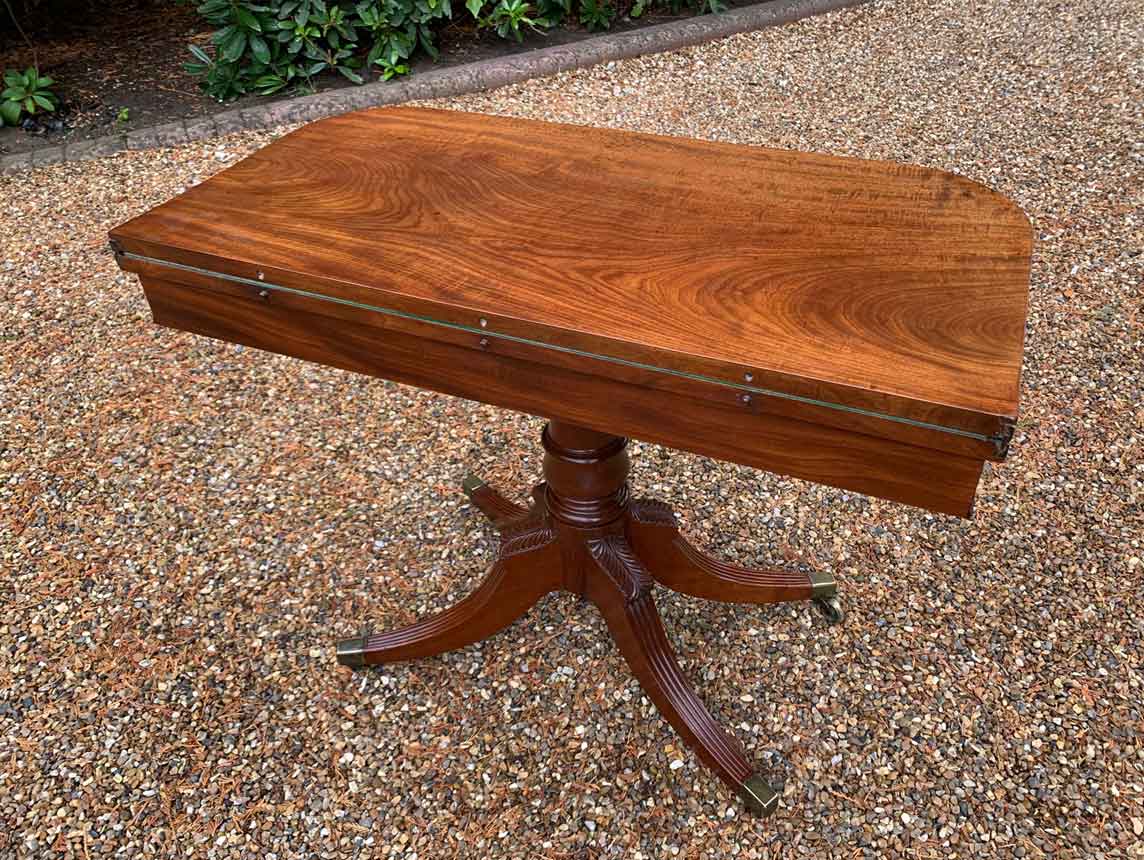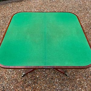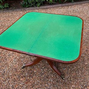 A very high quality 19th Century Regency Mahogany Card Table with green baize interior, Raised on a turned stem column, on four reeded and leaf carved splayed legs with brass caps and castors. The top swivels open to become a card table.
