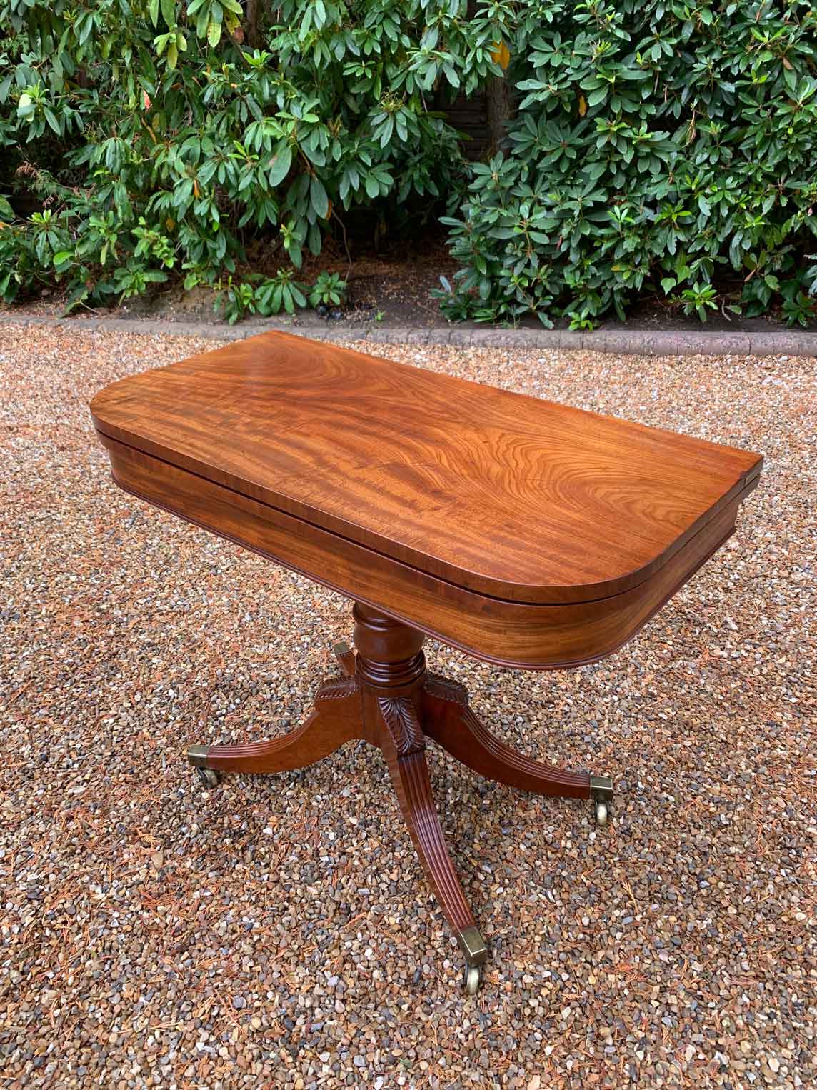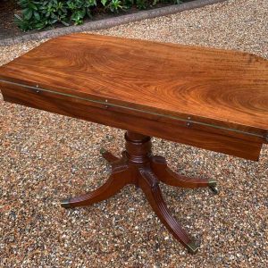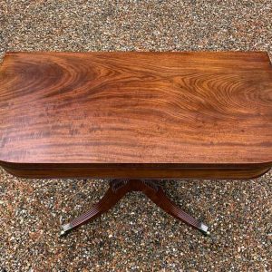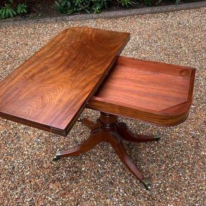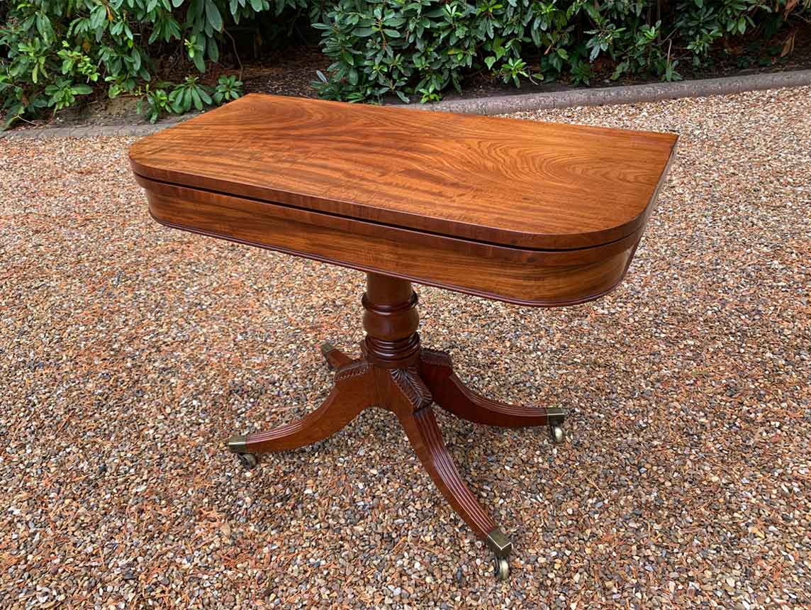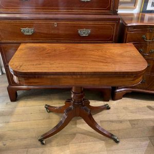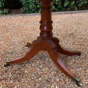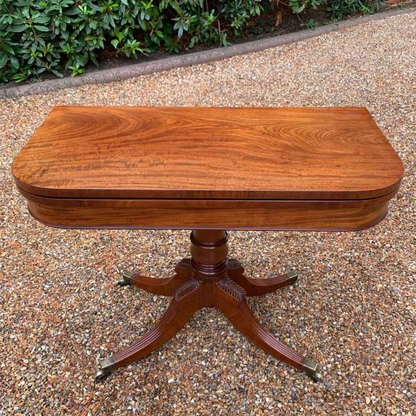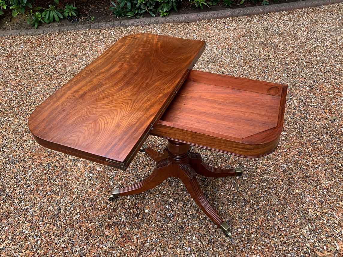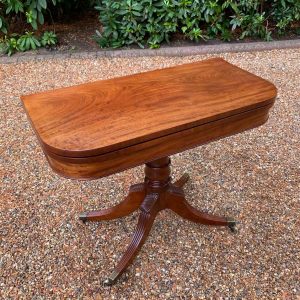 A very high quality 19th Century Regency Mahogany Card Table with green baize interior, Raised on a turned stem column, on four reeded and leaf carved splayed legs with brass caps and castors. The top swivels open to become a card table.