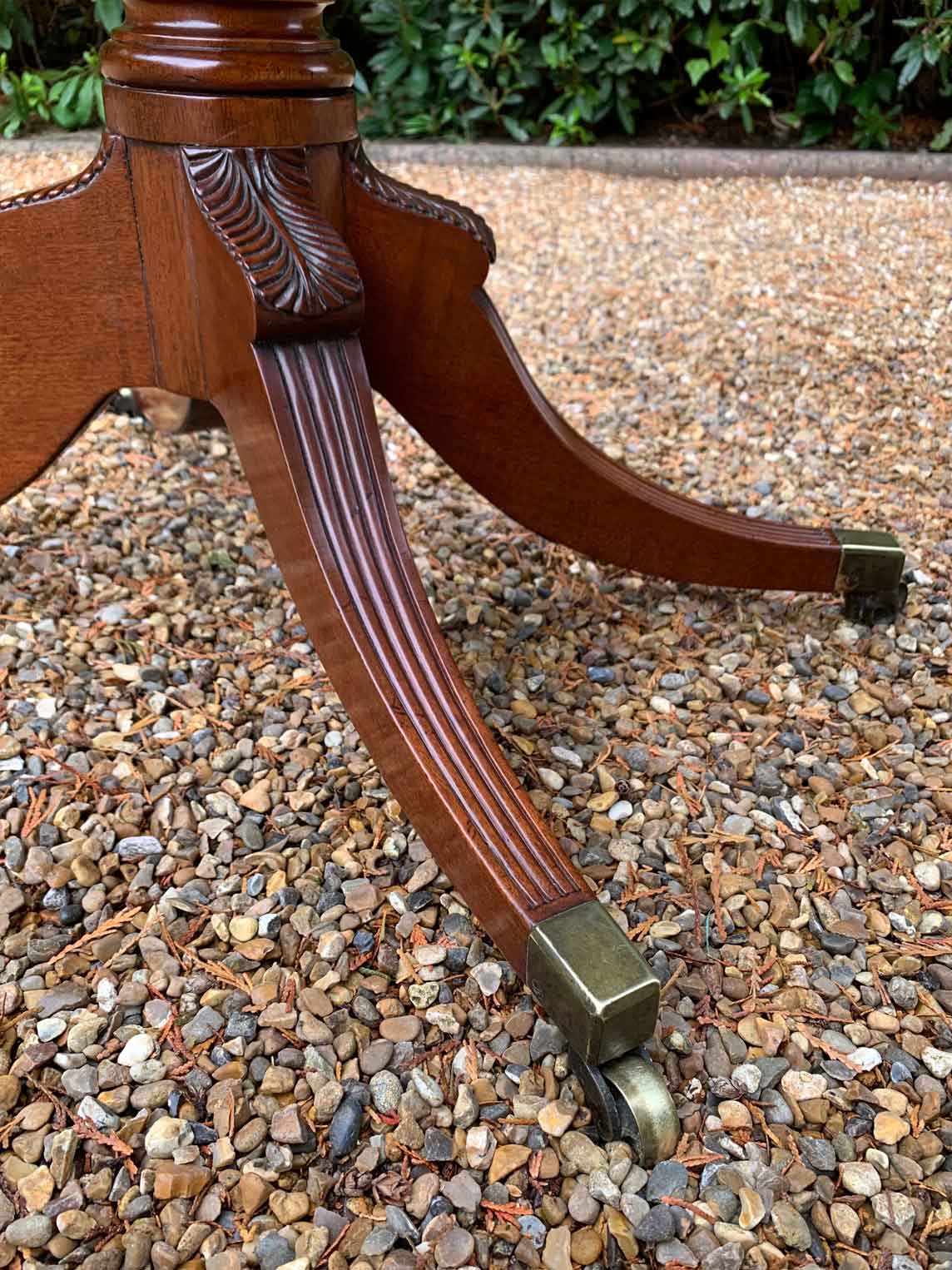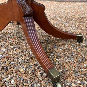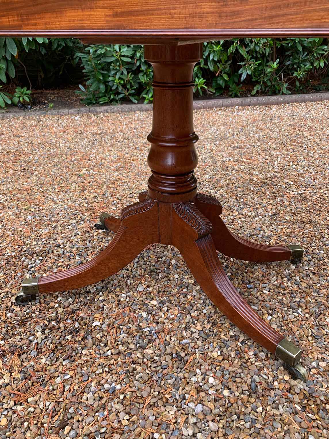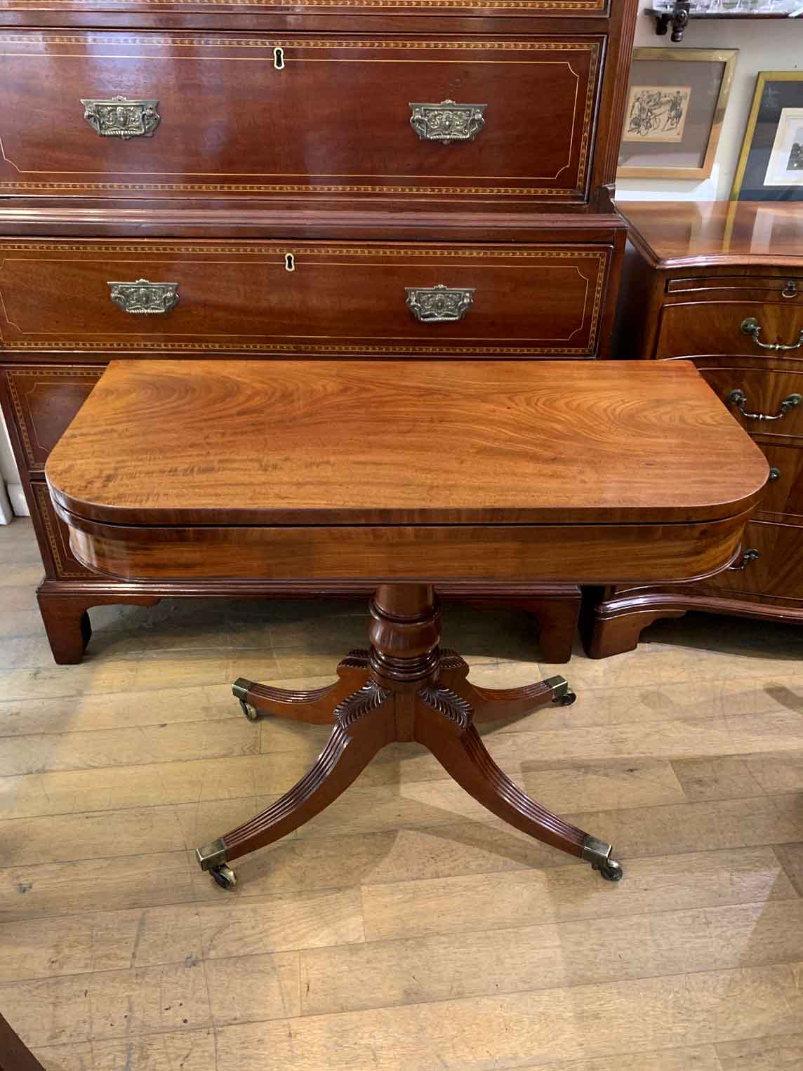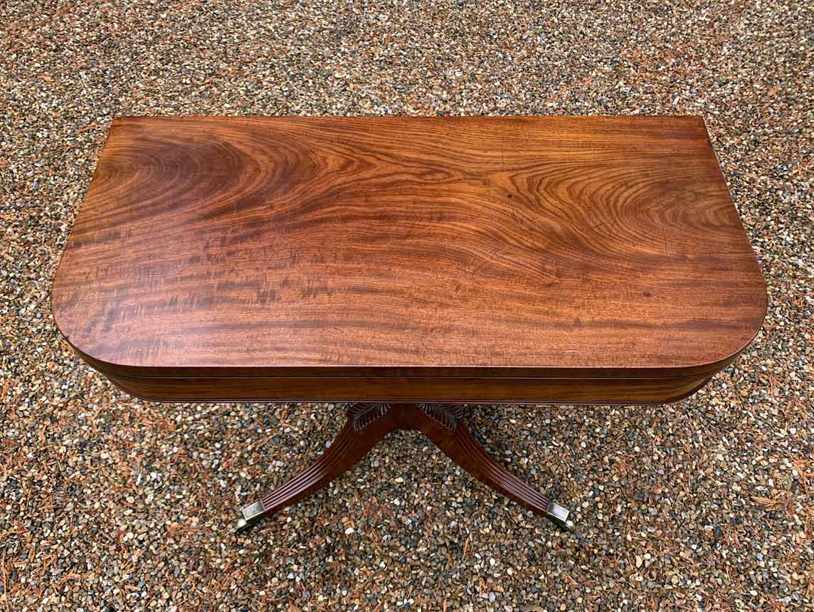 A very high quality 19th Century Regency Mahogany Card Table with green baize interior, Raised on a turned stem column, on four reeded and leaf carved splayed legs with brass caps and castors. The top swivels open to become a card table.