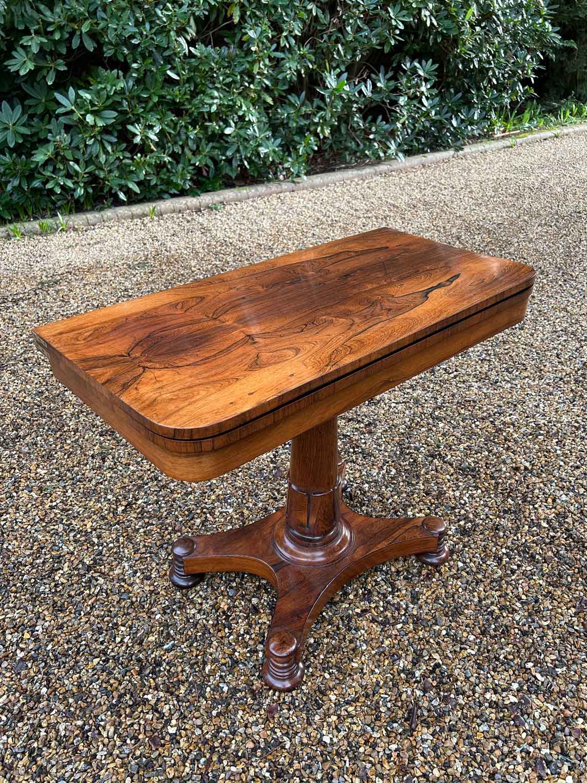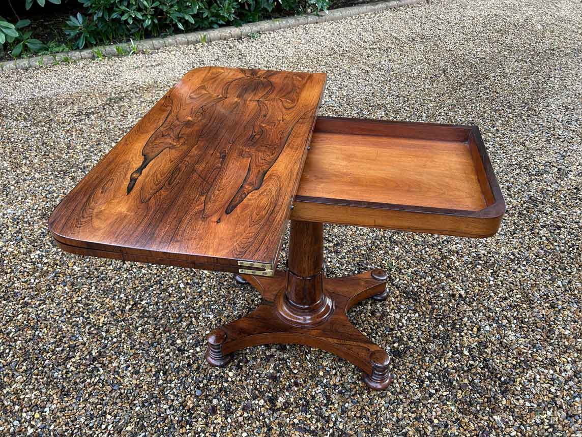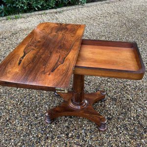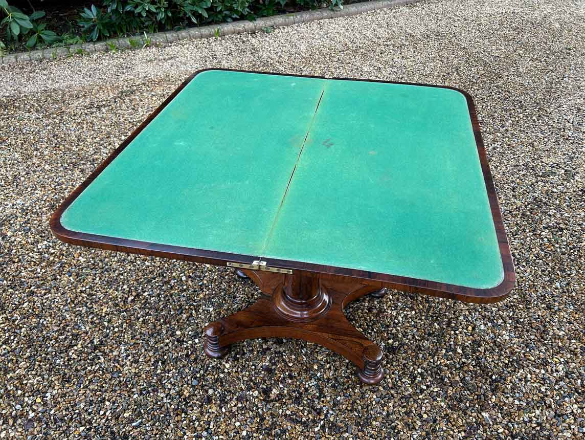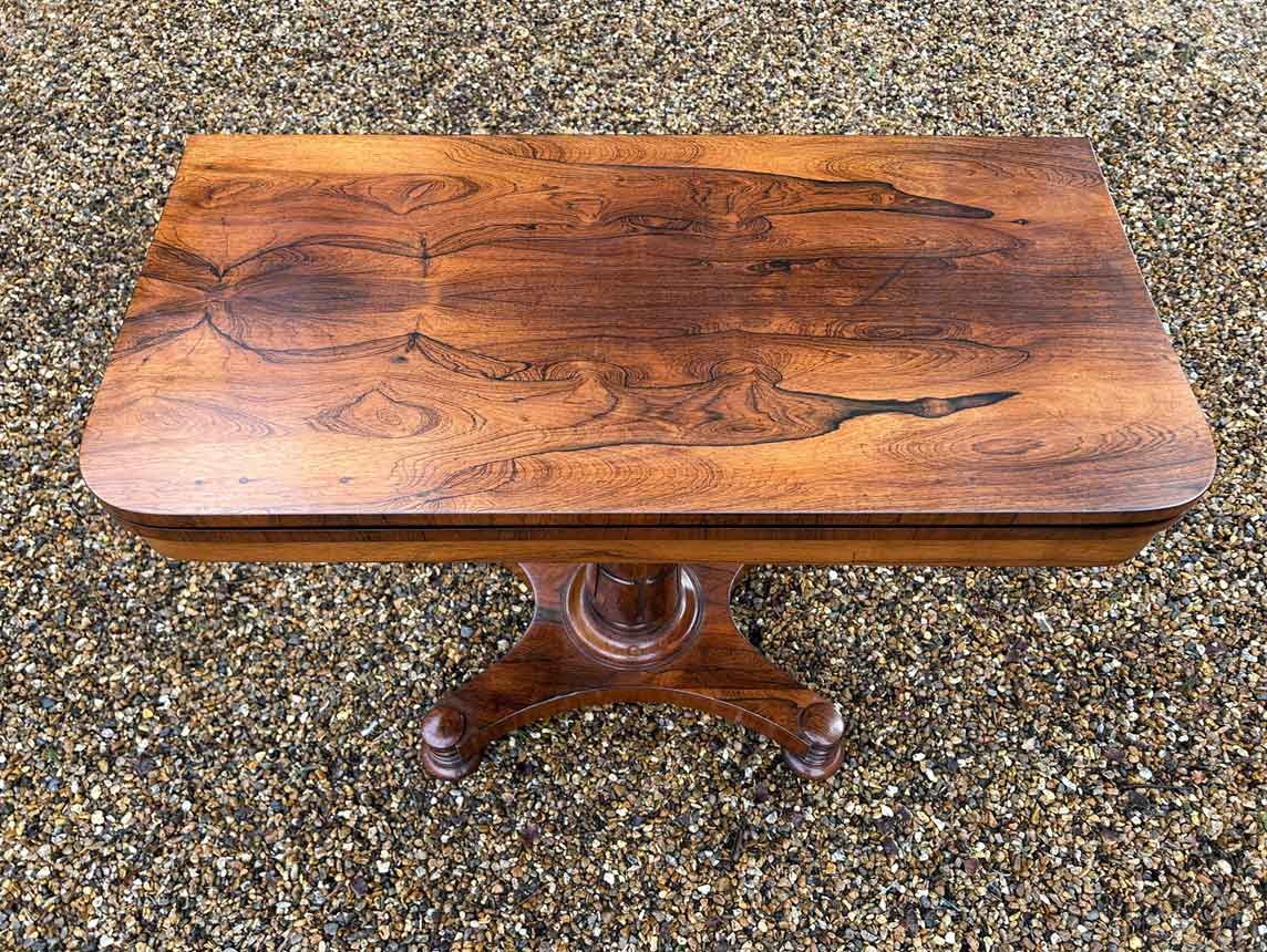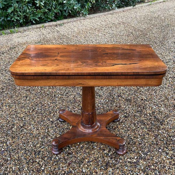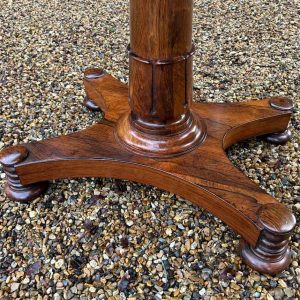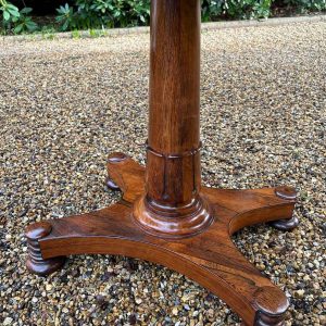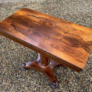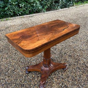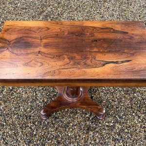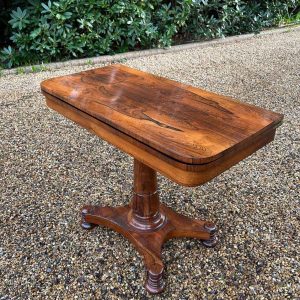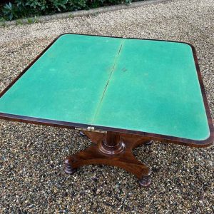 A very high quality William IV Rosewood Card Table with beautifully figured rosewood throughout. The top swivels 90′ degrees to open into a Card Table with a original baize lined interior. The cylindrical turned rosewood column on lotus leaf collar, supported by a quatreform base with turned bun feet and original concealed swivel castors.