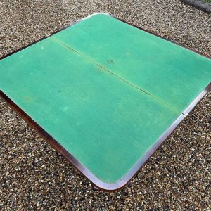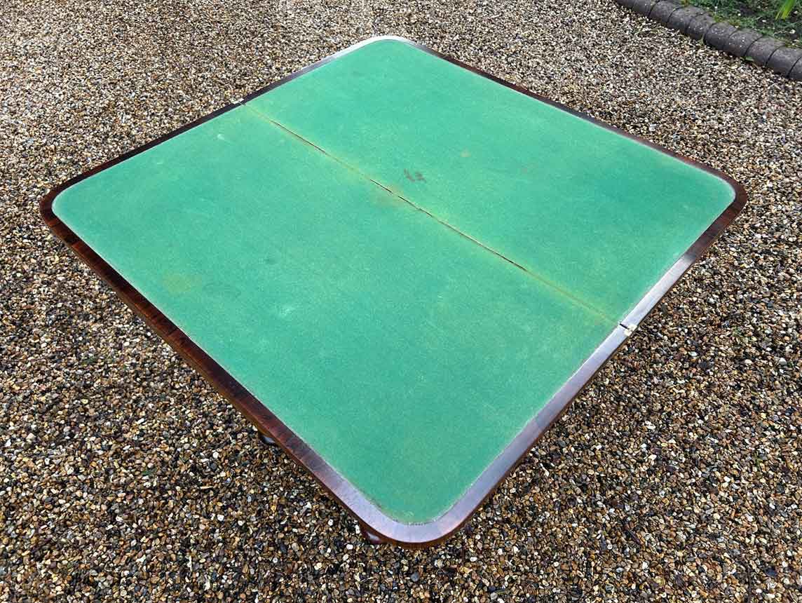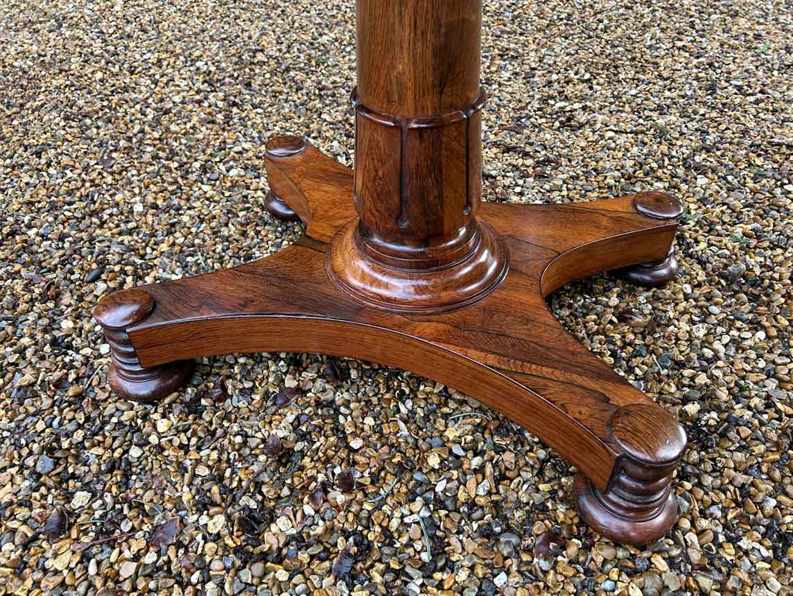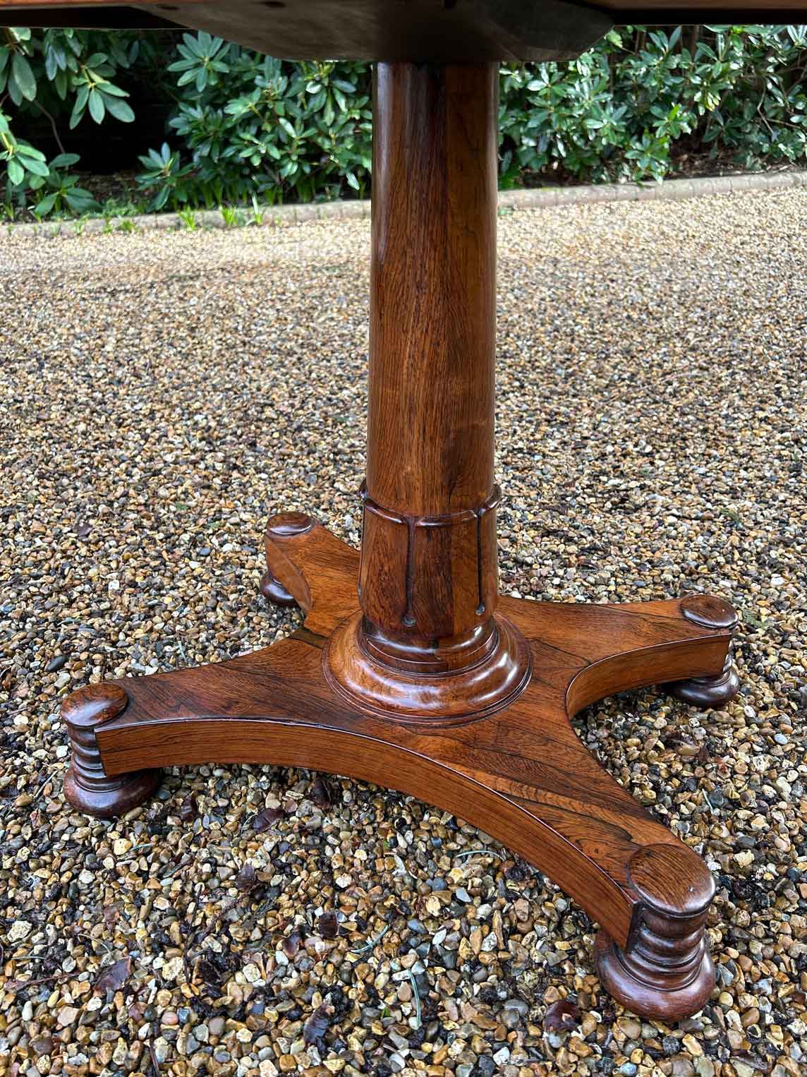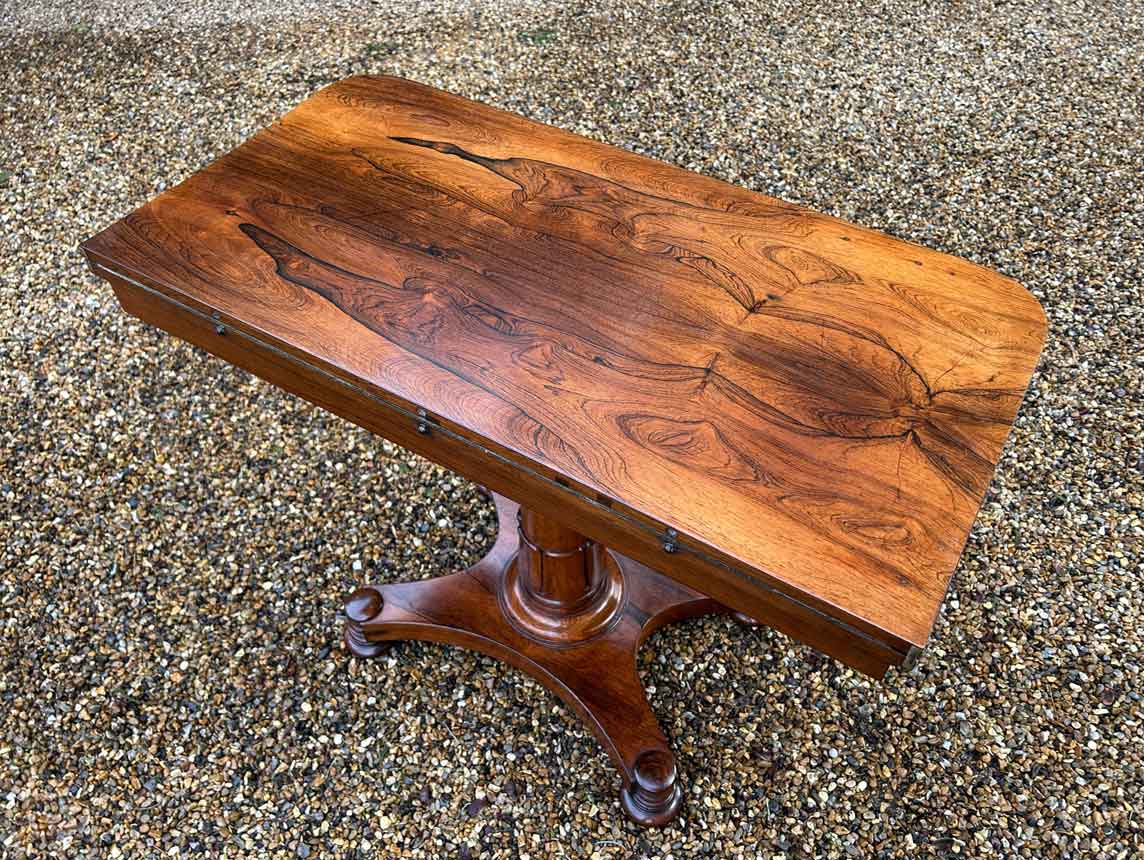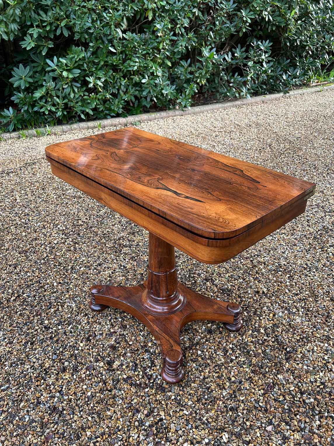 A very high quality William IV Rosewood Card Table with beautifully figured rosewood throughout. The top swivels 90′ degrees to open into a Card Table with a original baize lined interior. The cylindrical turned rosewood column on lotus leaf collar, supported by a quatreform base with turned bun feet and original concealed swivel castors.