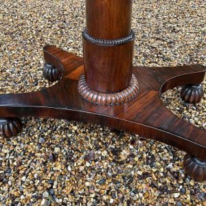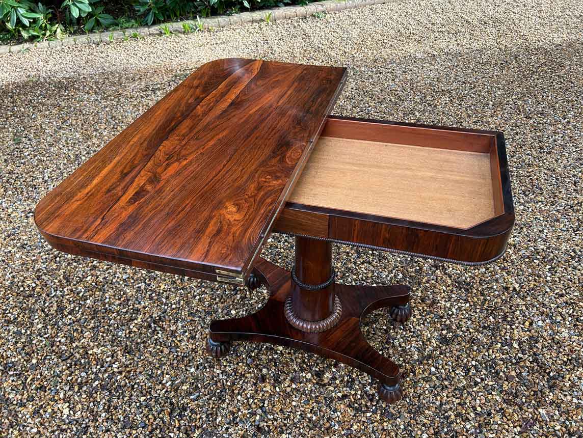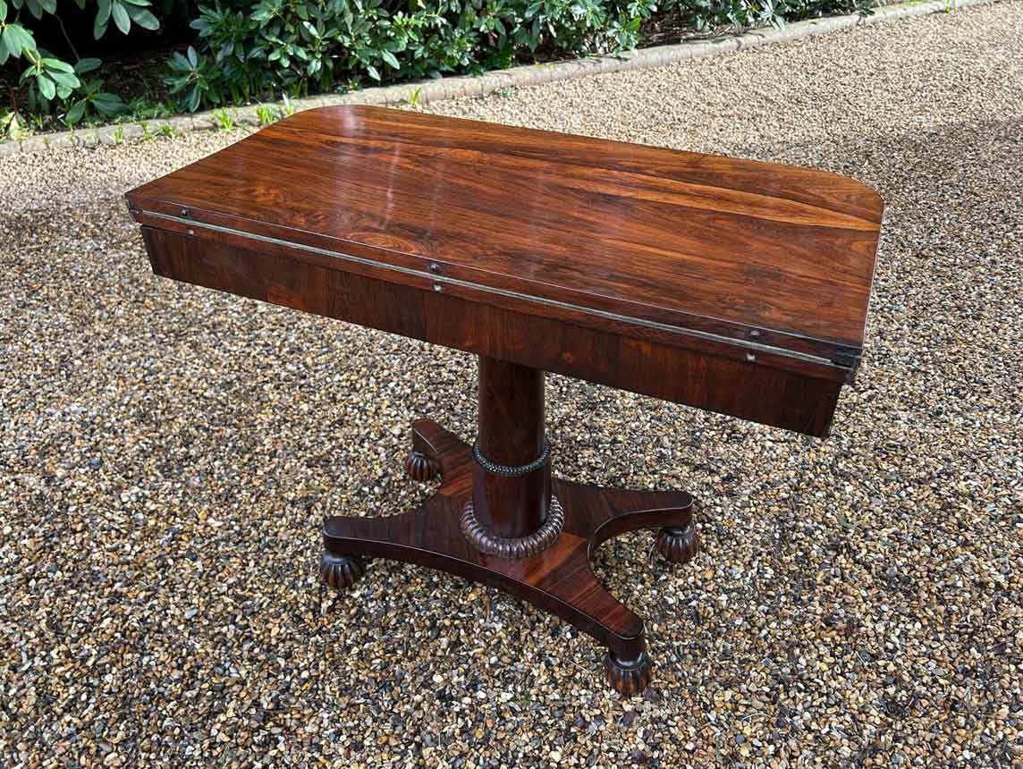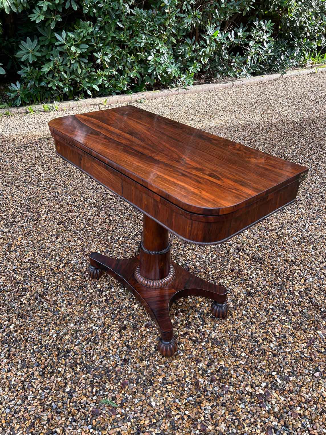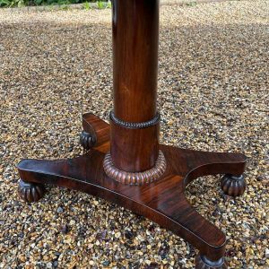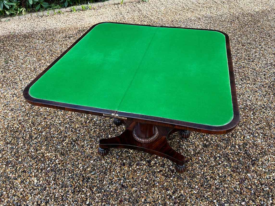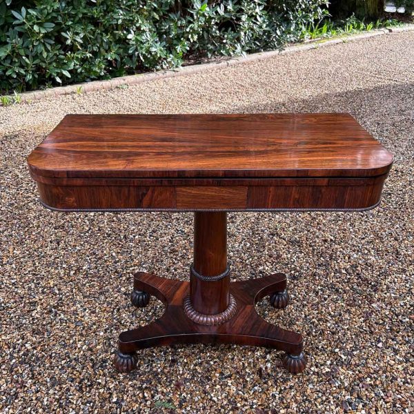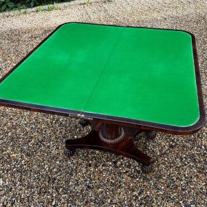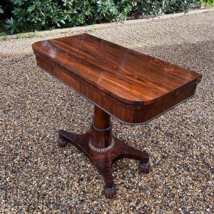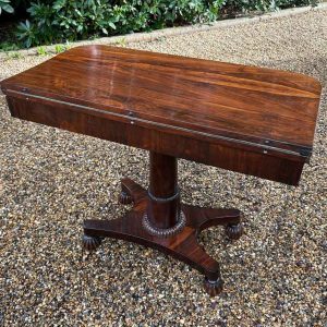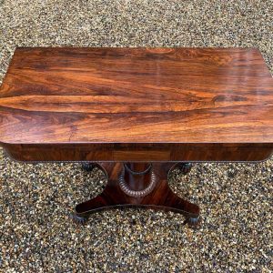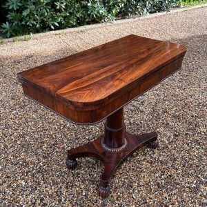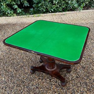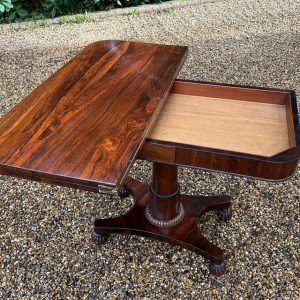 A very high quality William IV Rosewood Card Table with beautifully figured rosewood throughout. The top swivels 90′ degrees to open into a Card Table with a baize lined interior. The cylindrical turned rosewood column on lotus leaf collar, supported by a quatreform base with reeded bun feet and original concealed castors.