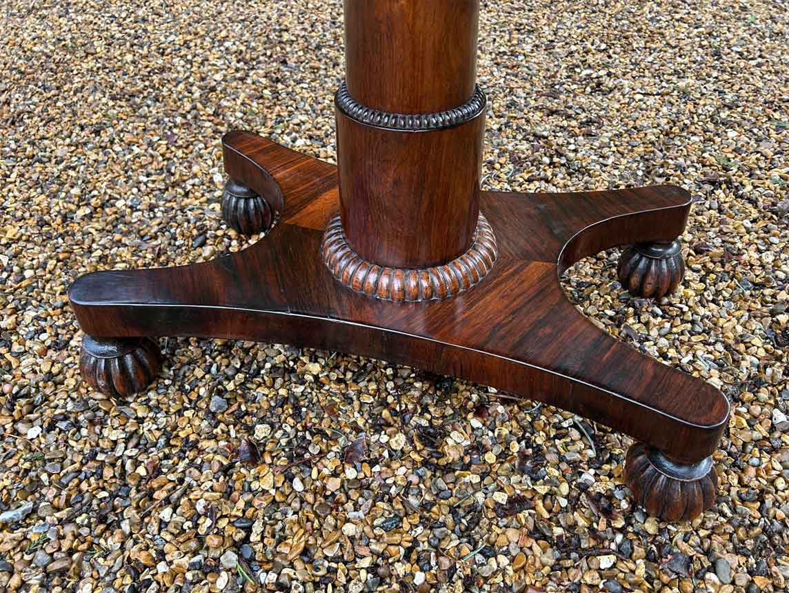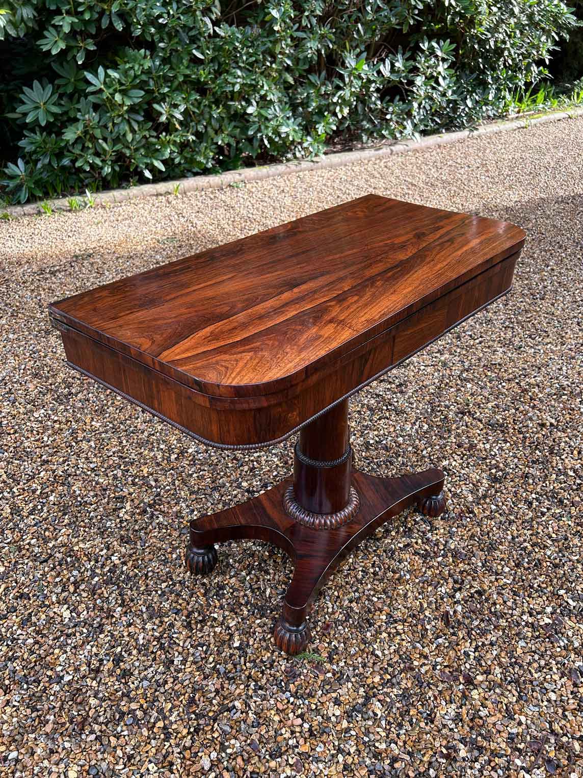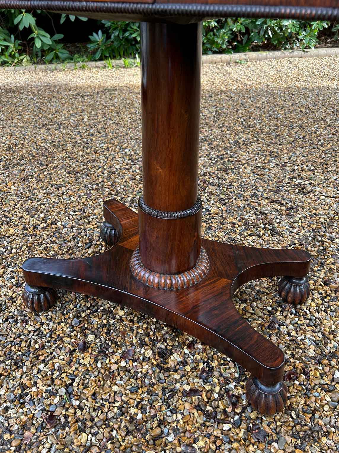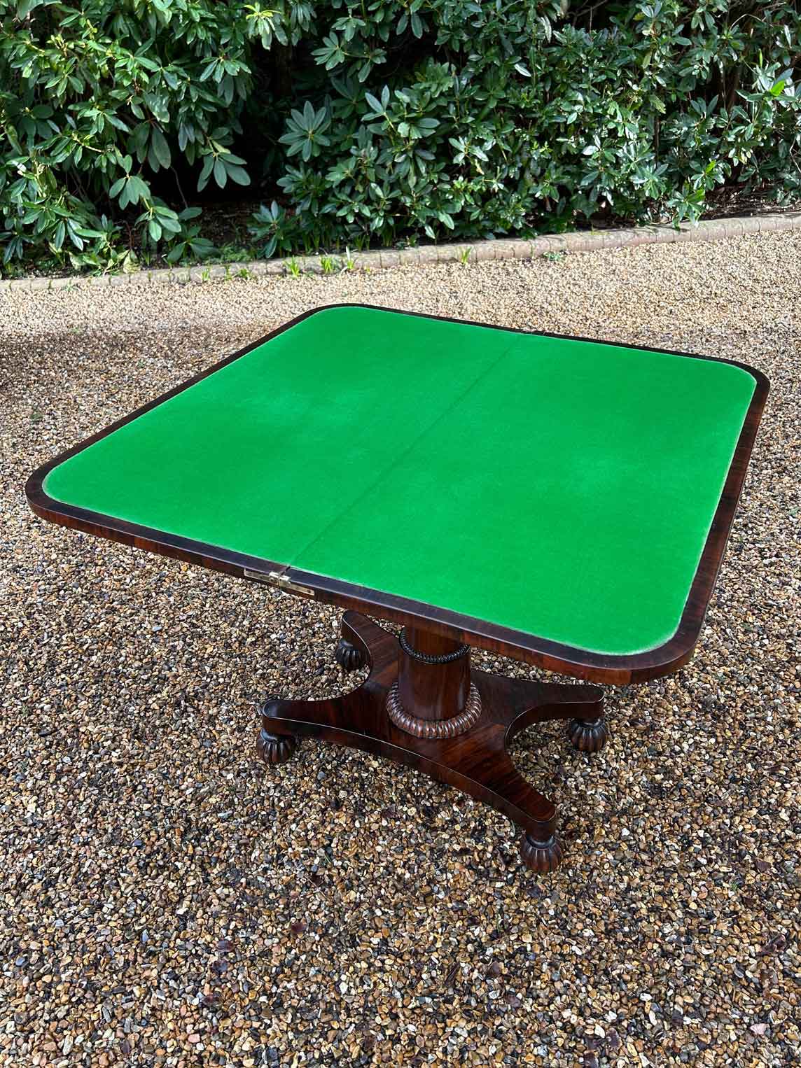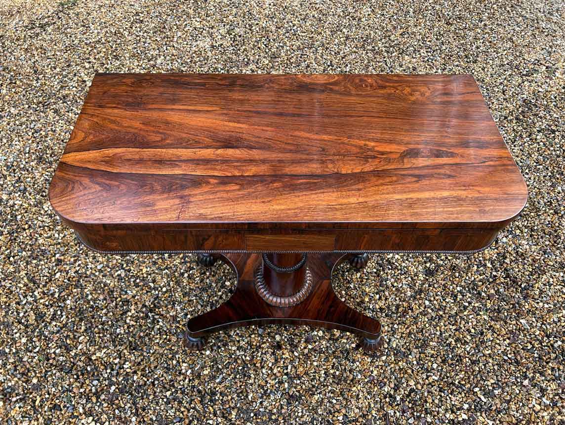 A very high quality William IV Rosewood Card Table with beautifully figured rosewood throughout. The top swivels 90′ degrees to open into a Card Table with a baize lined interior. The cylindrical turned rosewood column on lotus leaf collar, supported by a quatreform base with reeded bun feet and original concealed castors.