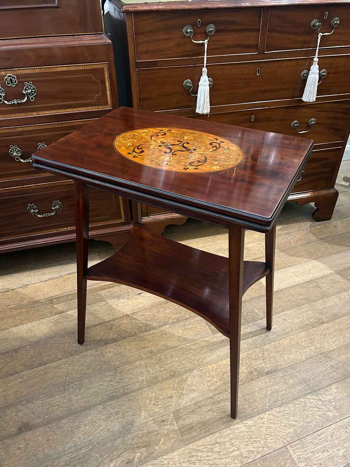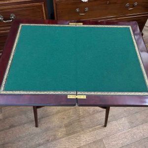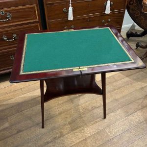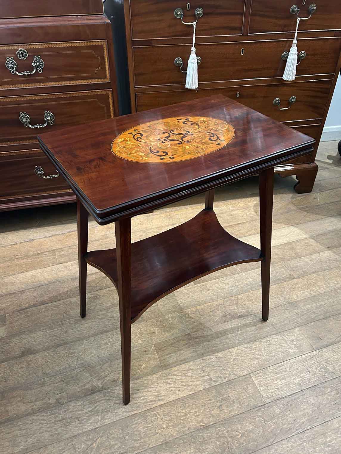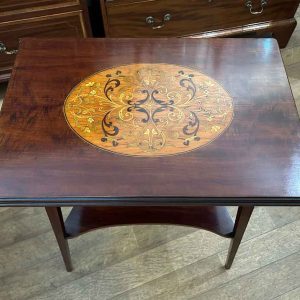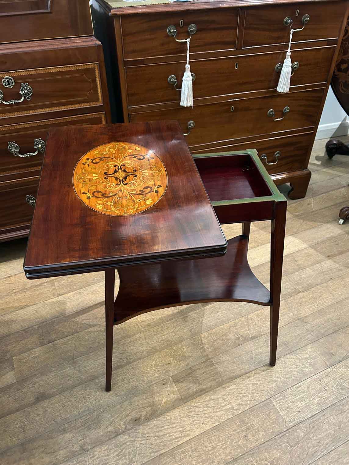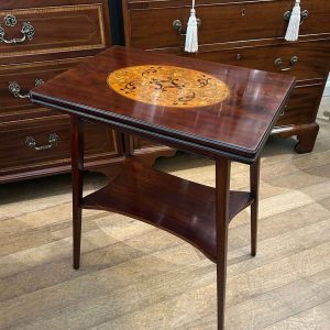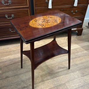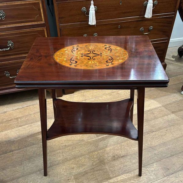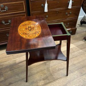 A very high quality 19th Century Mahogany Card Table with beautifully inlaid marqutary top. The top swivels 90′ degrees to open into a Card Table with a green baize lined interior. Supported by a square tapering legs with a lower shelf.