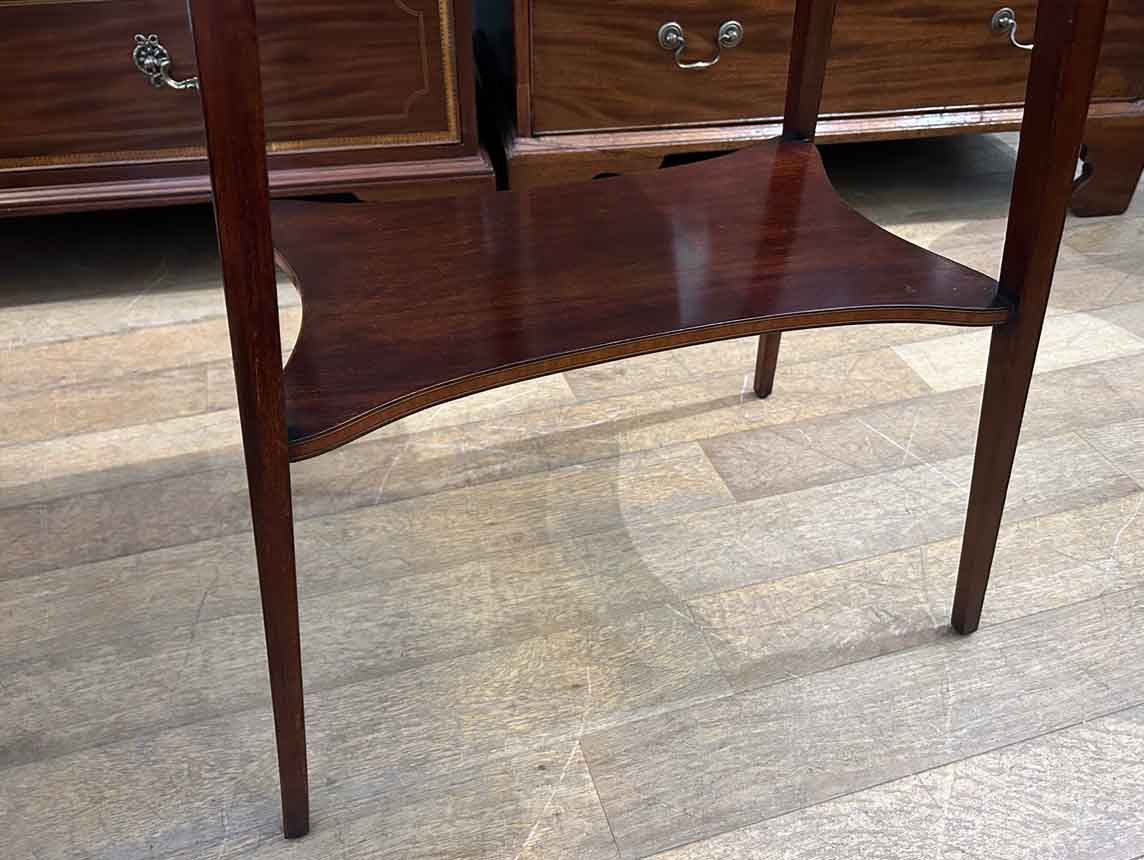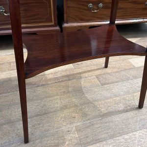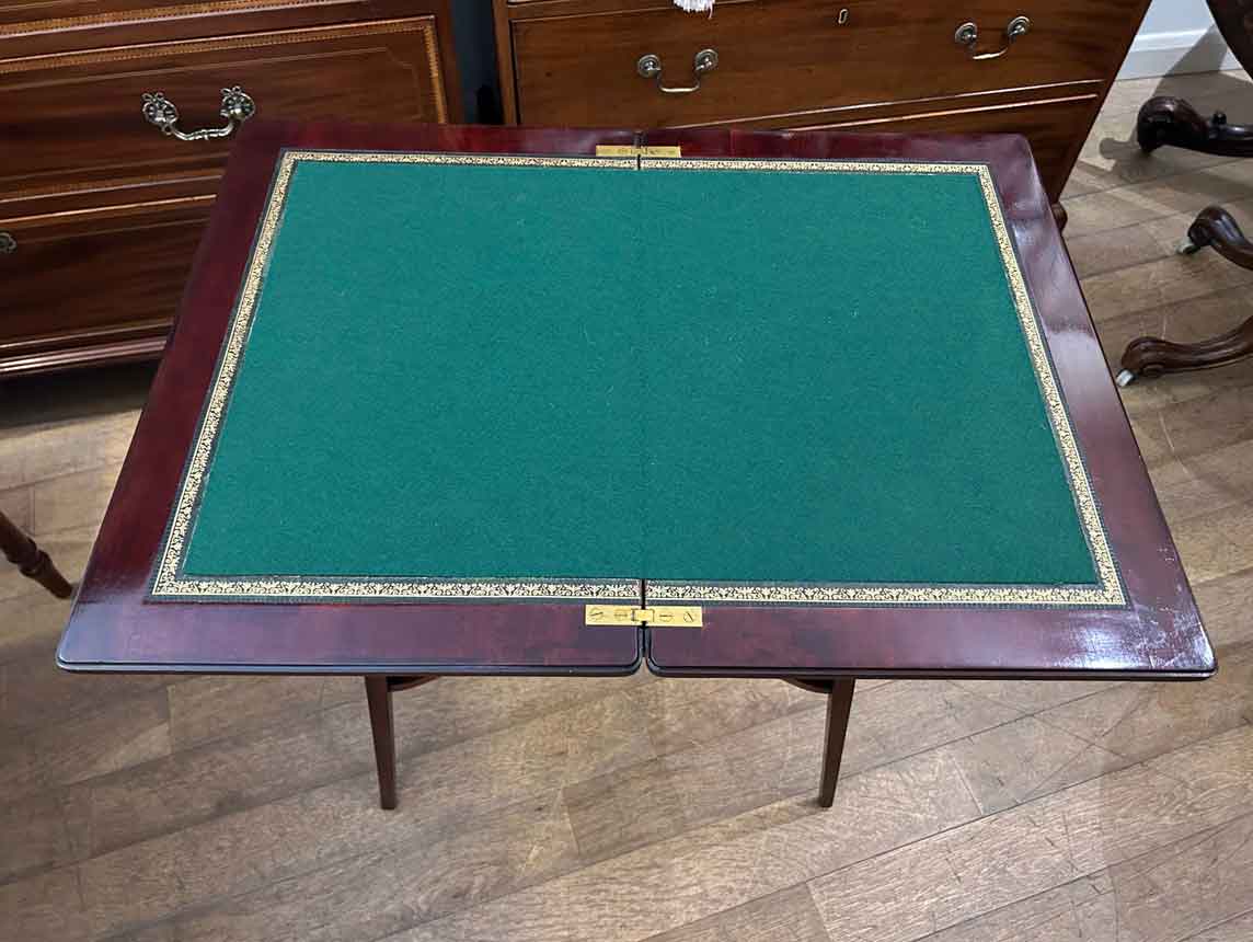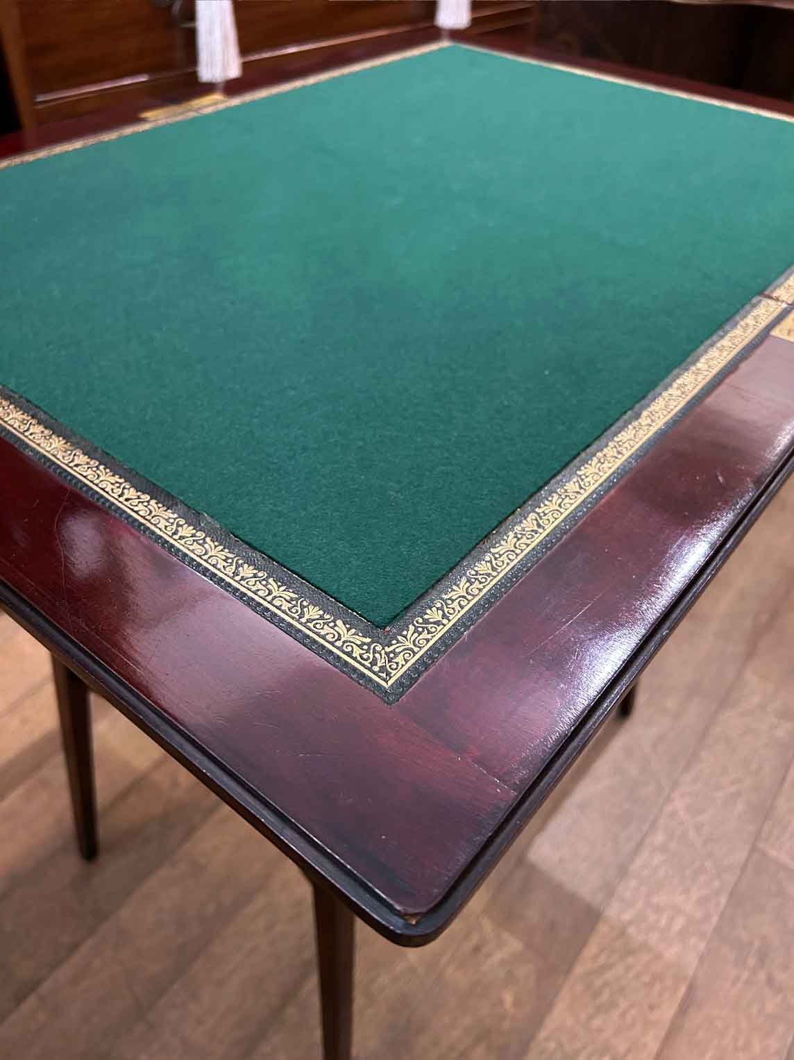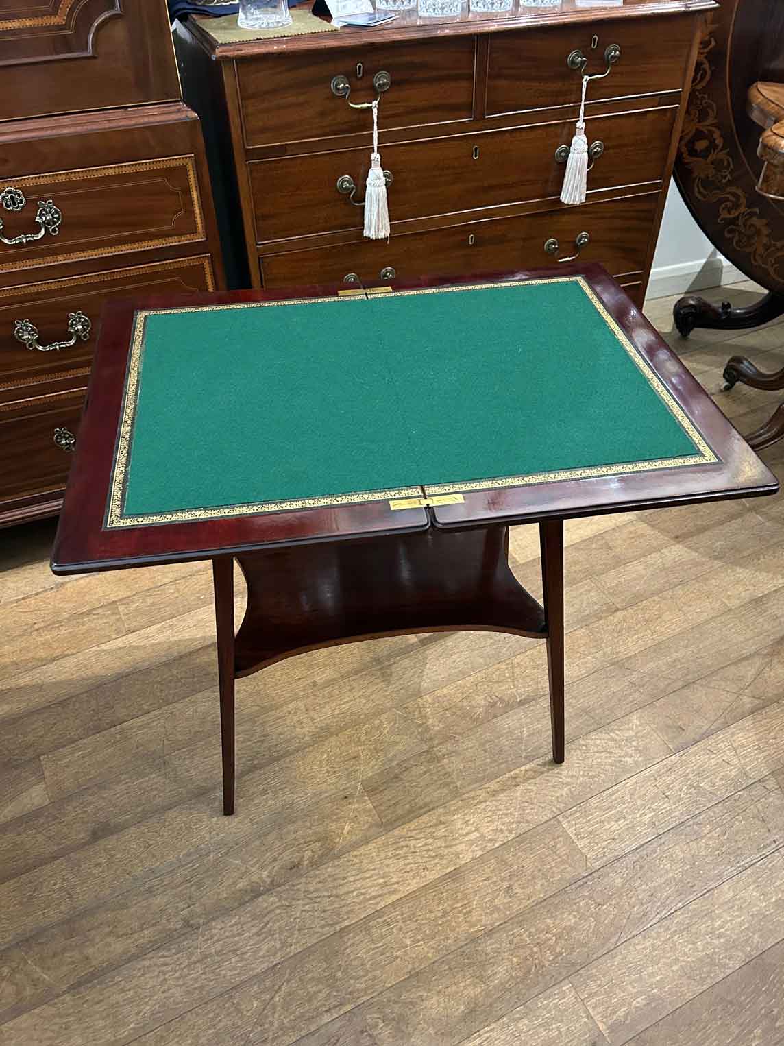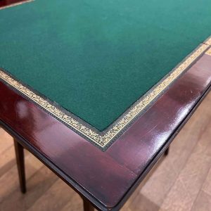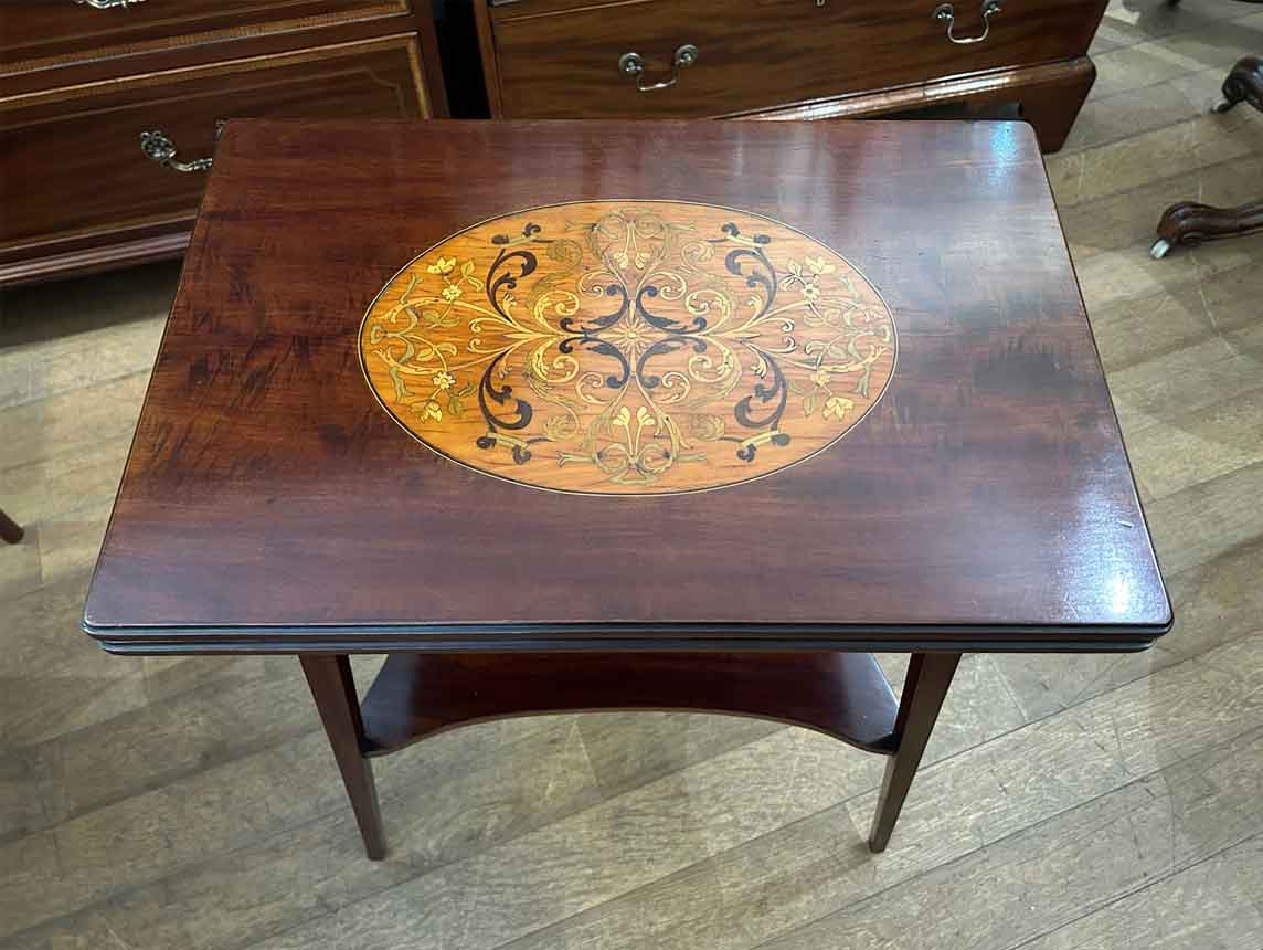 A very high quality 19th Century Mahogany Card Table with beautifully inlaid marqutary top. The top swivels 90′ degrees to open into a Card Table with a green baize lined interior. Supported by a square tapering legs with a lower shelf.