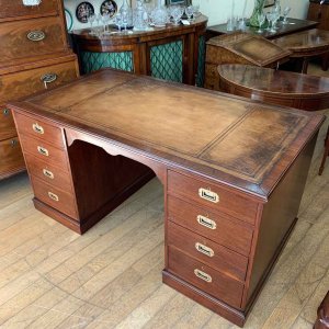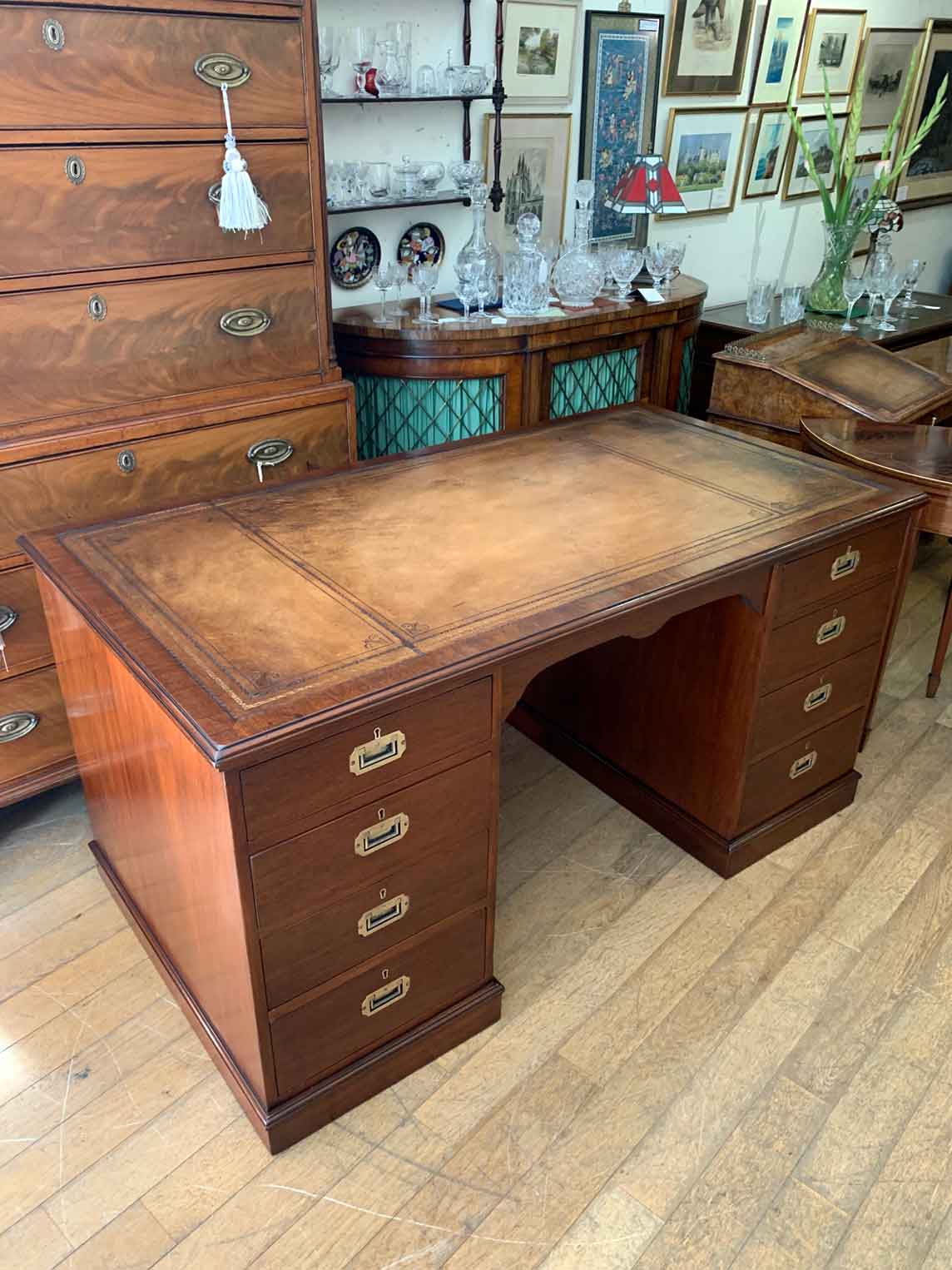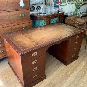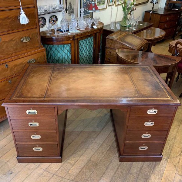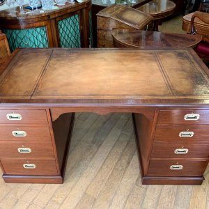 A Late 19th Century Victorian Mahogany Military Pedestal Desk with eight solid Ash lined drawers with brass handles and key. Comes apart in three separate sections.