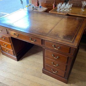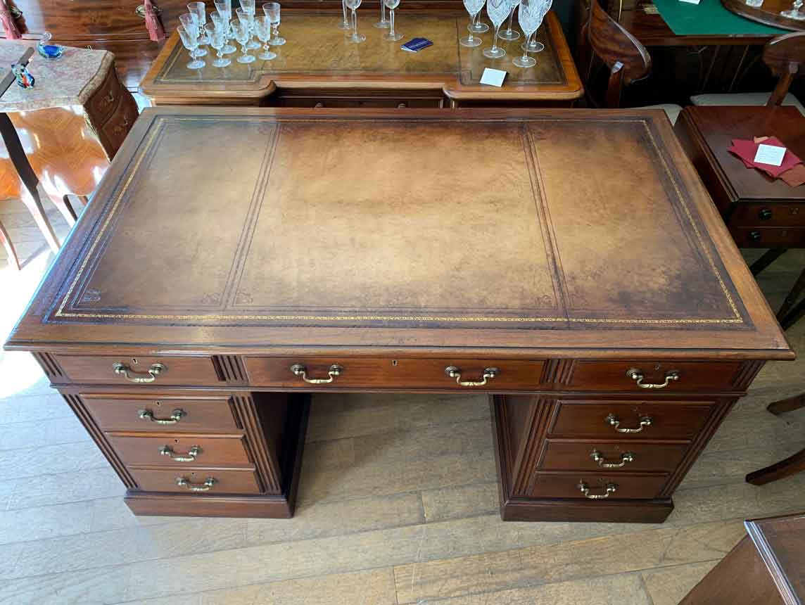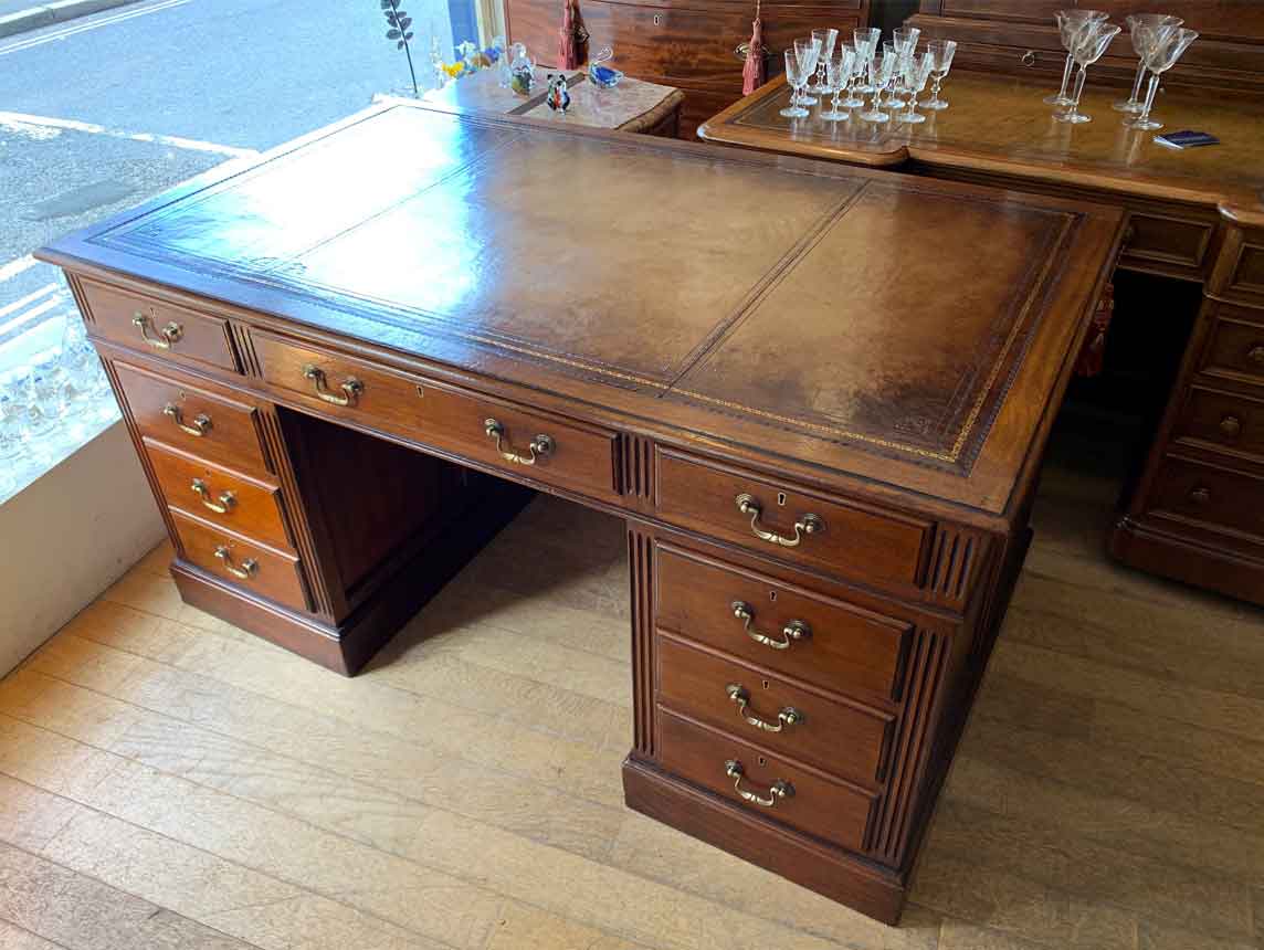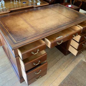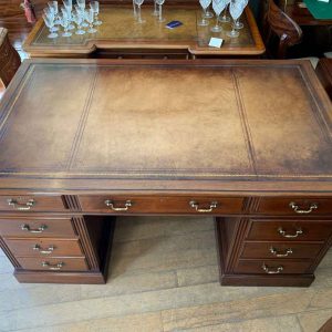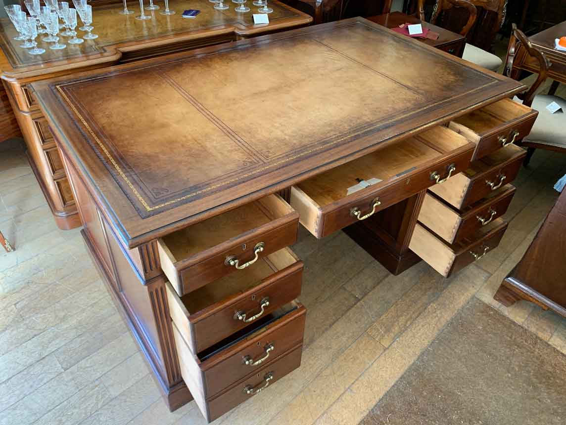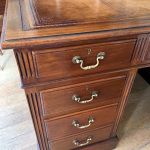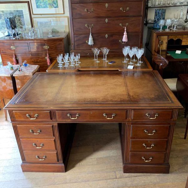 Late Edwardian / 1920’s Panelled Pedestal Desk, the top with a leather writing surface and nine drawers all fitted with brass swan neck handles, locks and working keys. Comes apart in three separate sections.