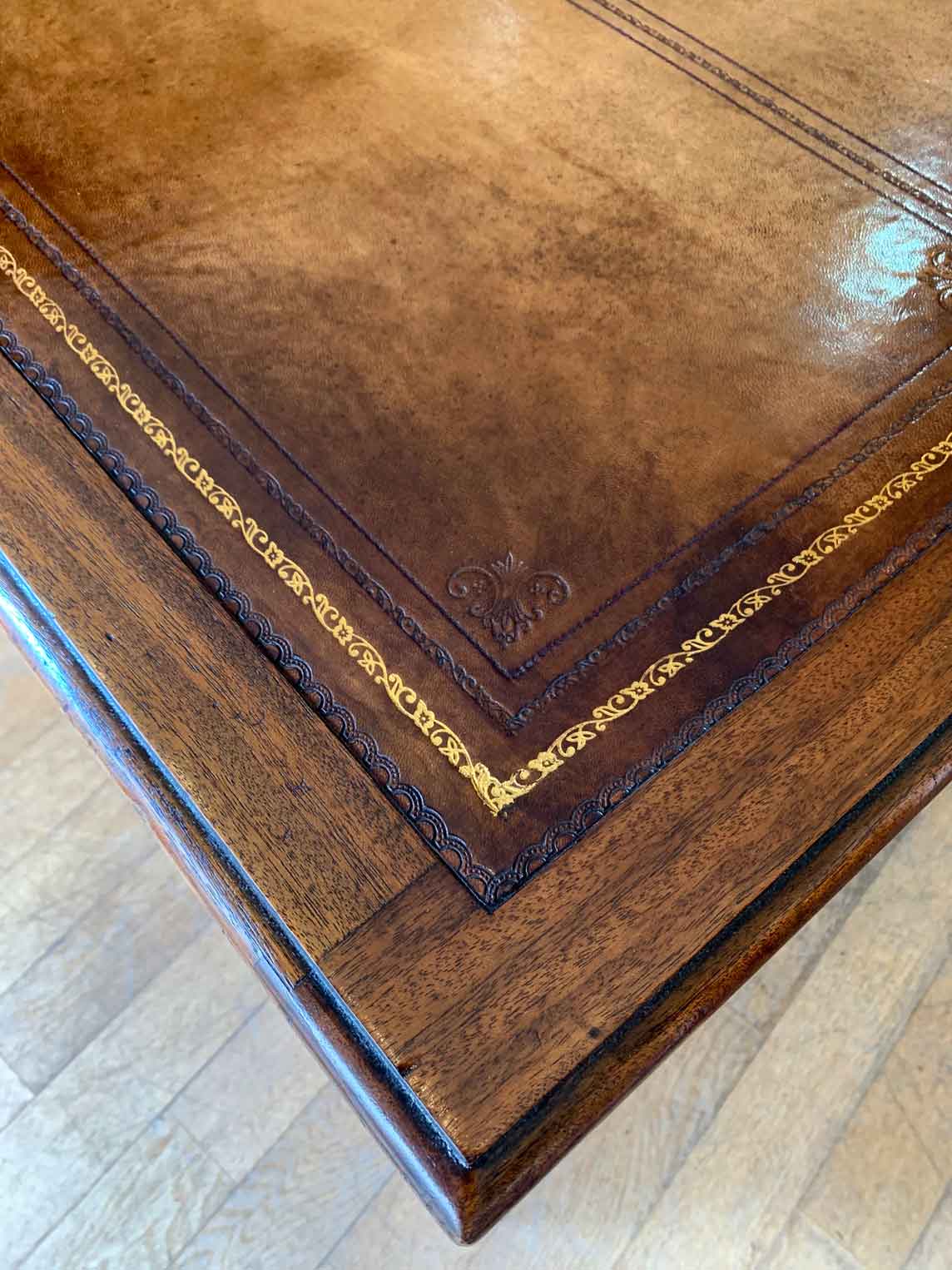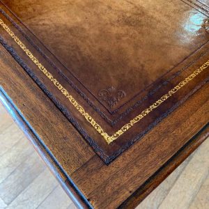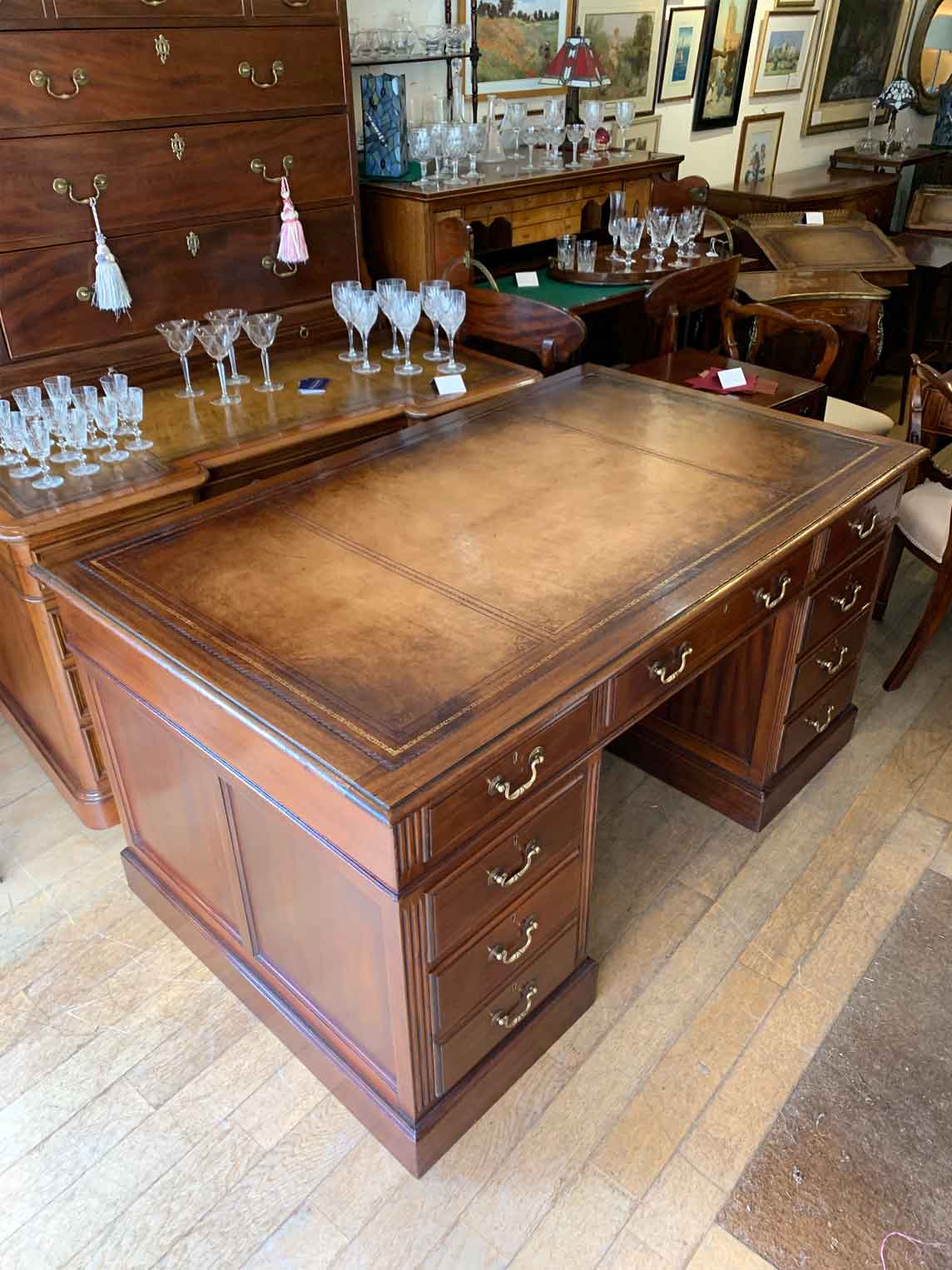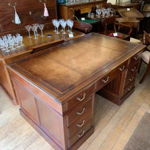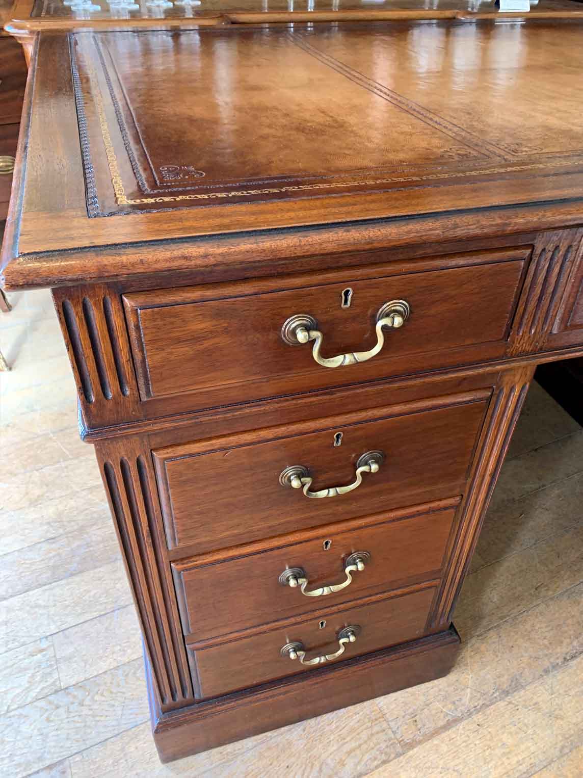 Late Edwardian / 1920’s Panelled Pedestal Desk, the top with a leather writing surface and nine drawers all fitted with brass swan neck handles, locks and working keys. Comes apart in three separate sections.