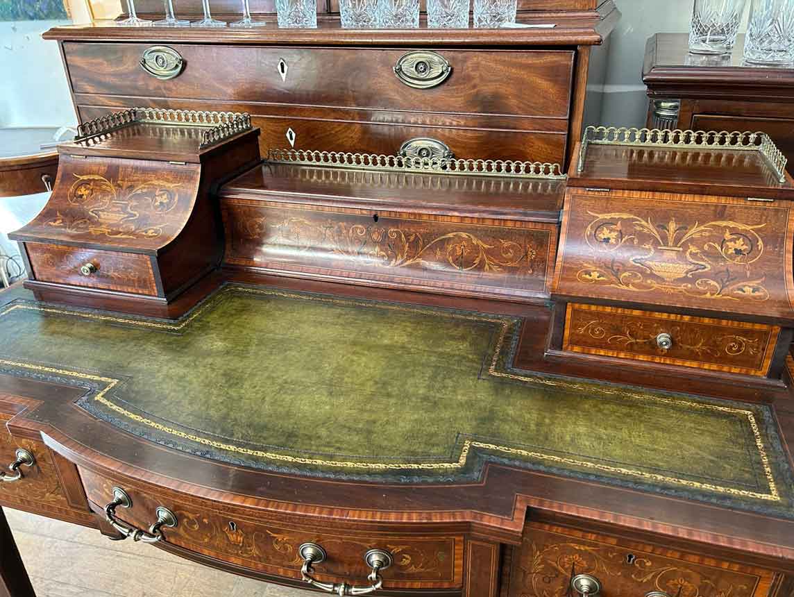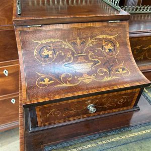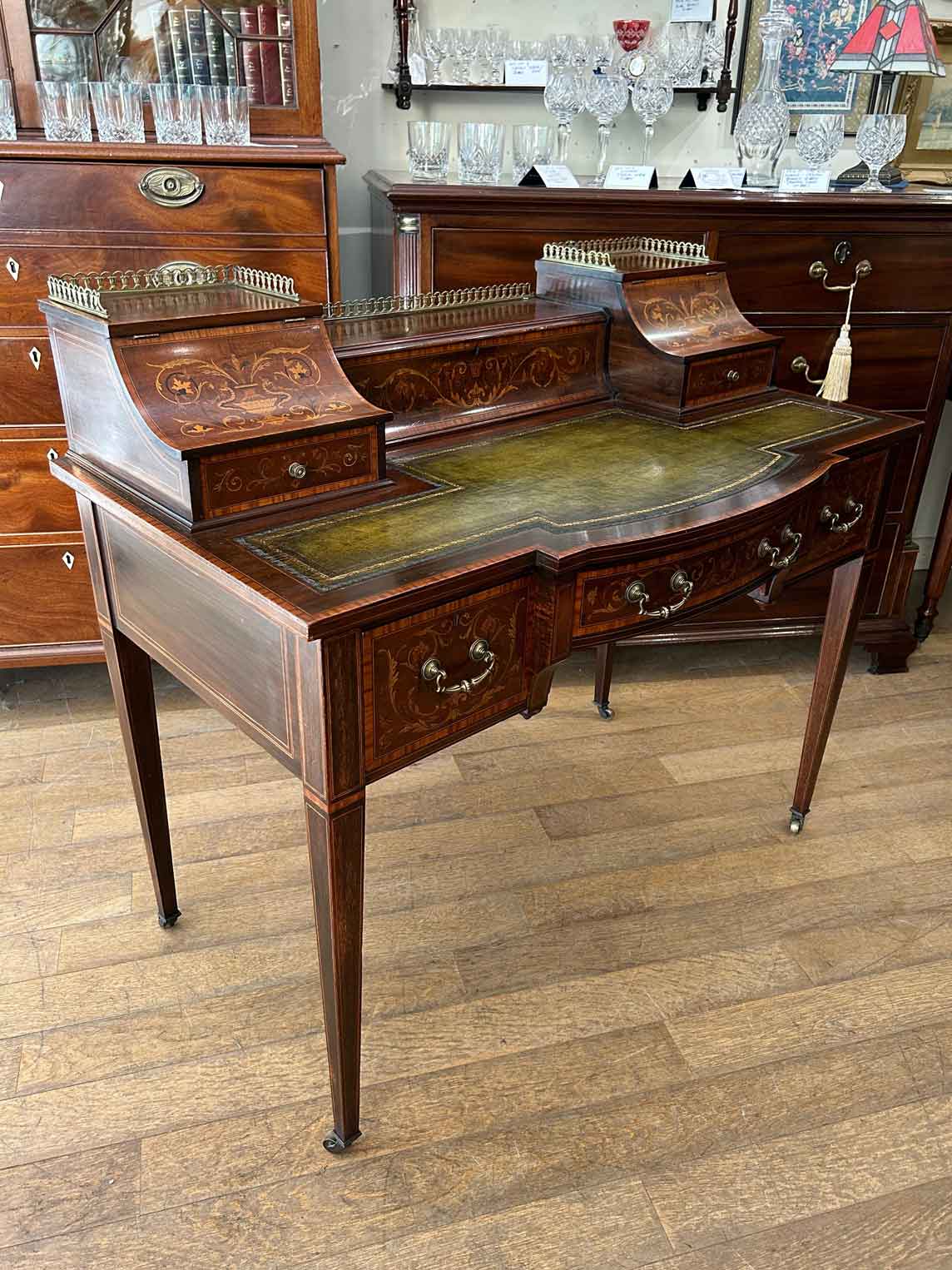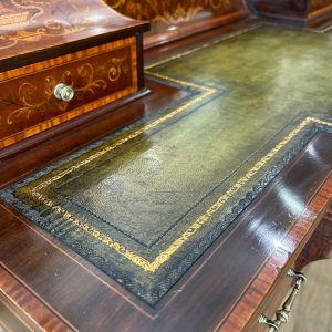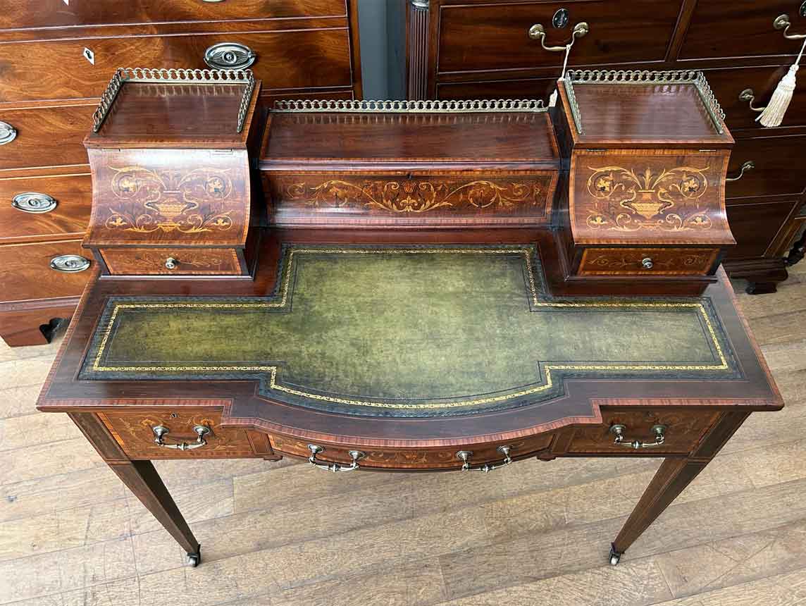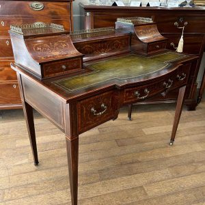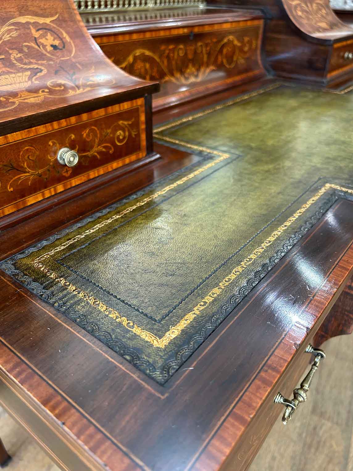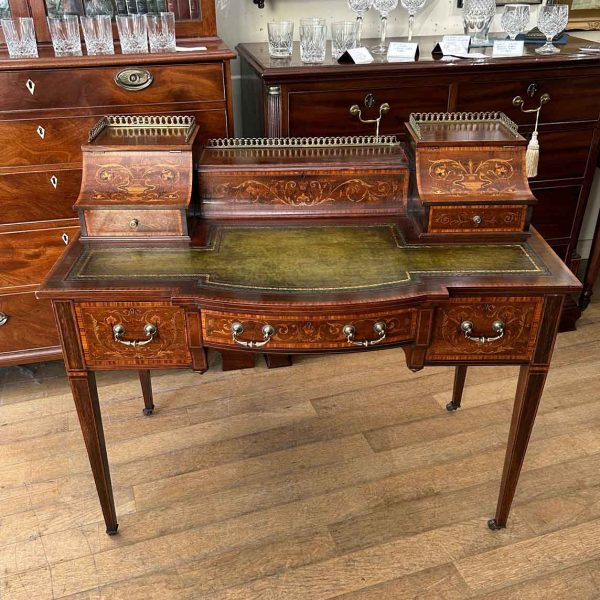 A very high quality 19th Century Carlton House Desk – Made by: Maple & Co. London Cabinet Makers for high quality furniture. The top has a brass gallery with two drawers and three lift up compartments, which include pigeon holes and ink wells. Below the writing surface there are three mahogany lined drawers with brass handles. The whole desk is heavily inlaid throughout with marquetry, stands on square tapered legs with boxwood line inlay and terminates with brass castors.