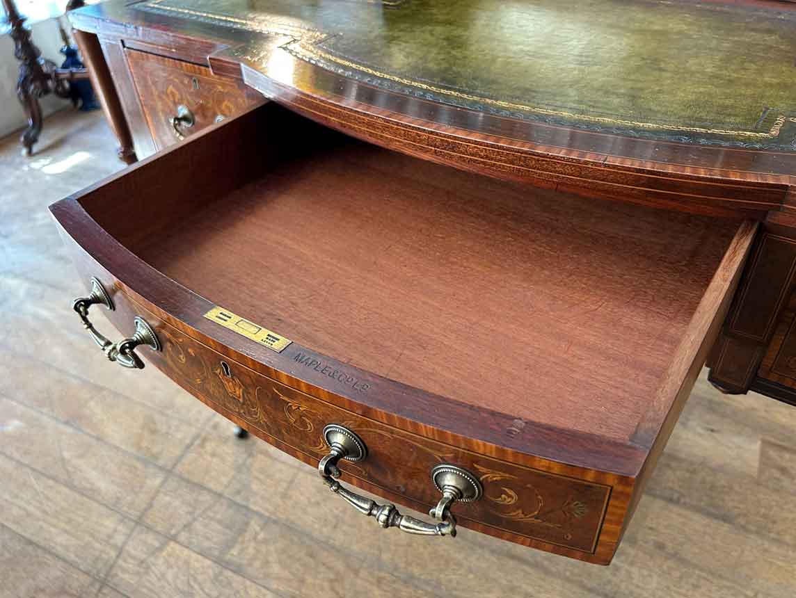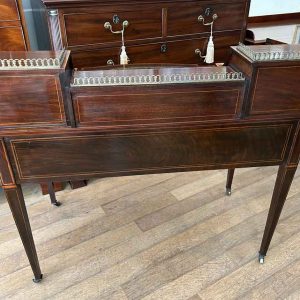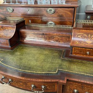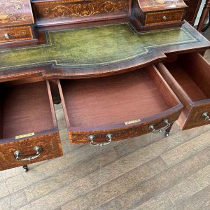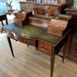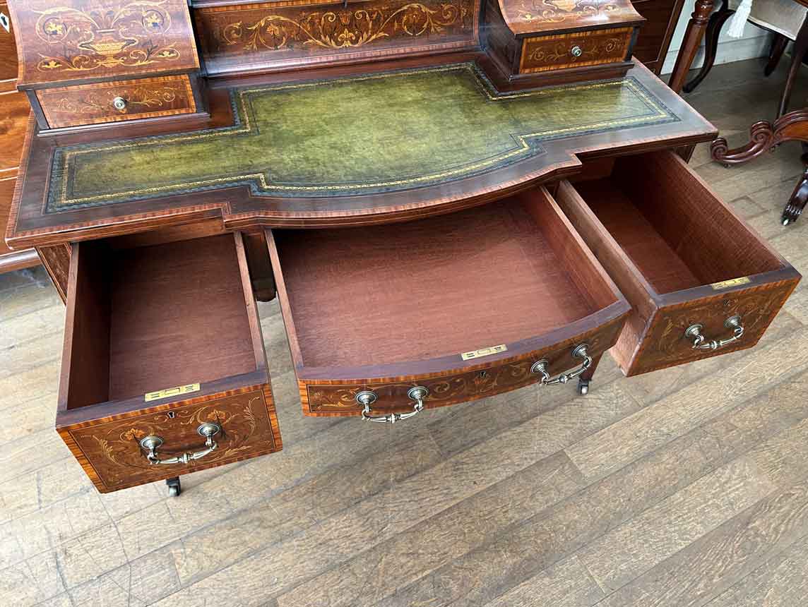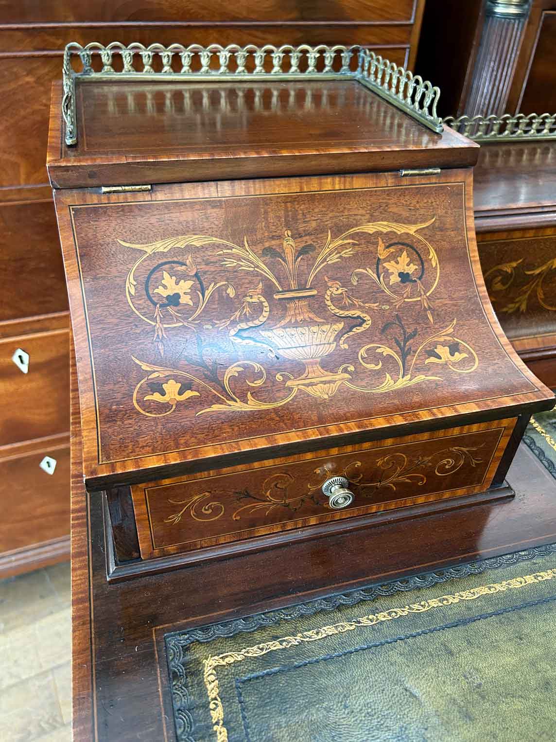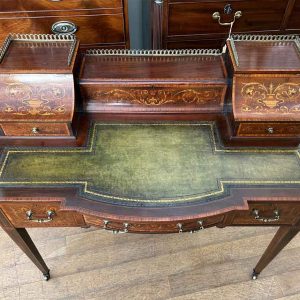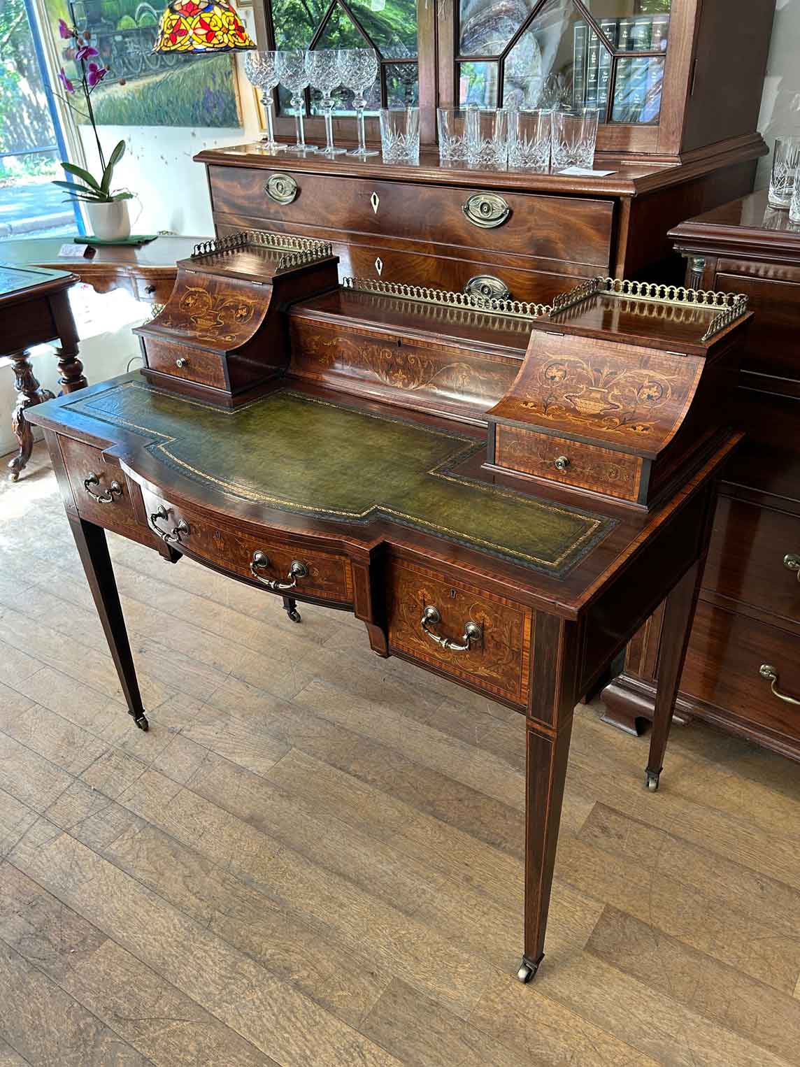 A very high quality 19th Century Carlton House Desk – Made by: Maple & Co. London Cabinet Makers for high quality furniture. The top has a brass gallery with two drawers and three lift up compartments, which include pigeon holes and ink wells. Below the writing surface there are three mahogany lined drawers with brass handles. The whole desk is heavily inlaid throughout with marquetry, stands on square tapered legs with boxwood line inlay and terminates with brass castors.