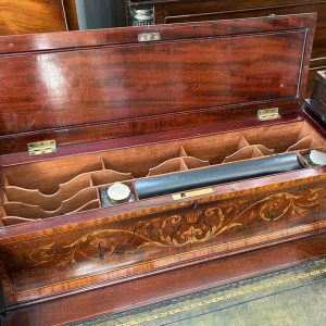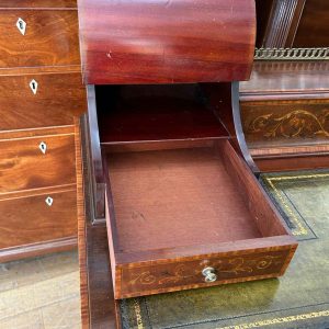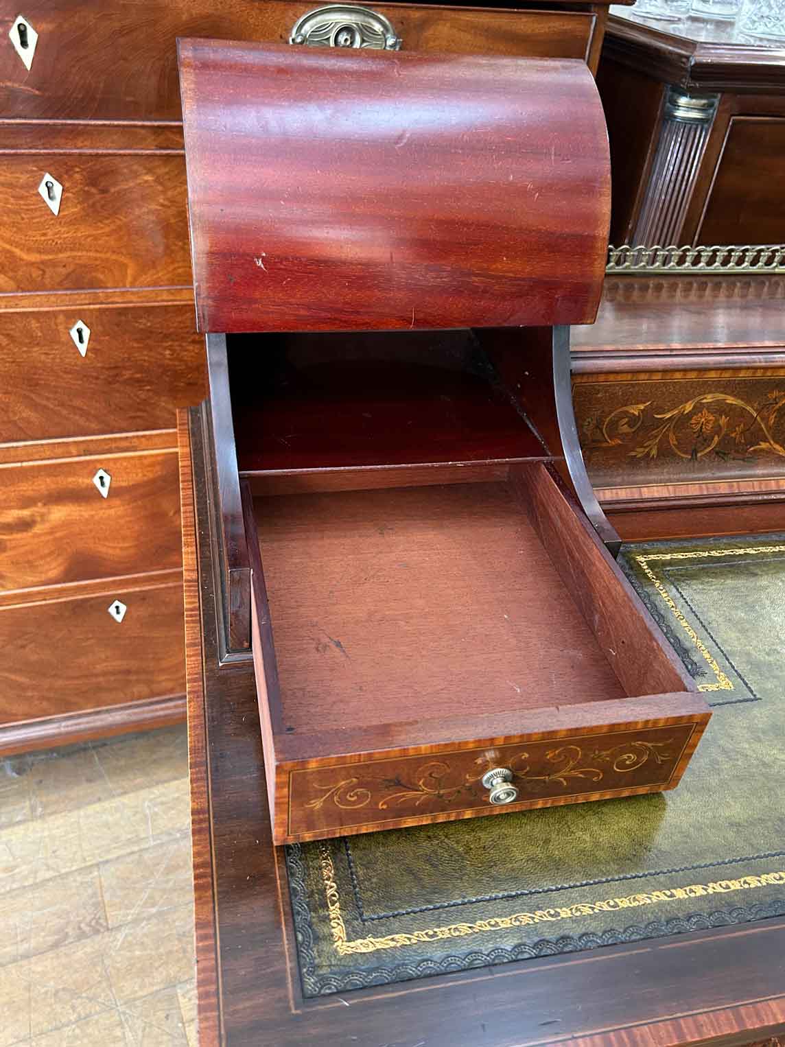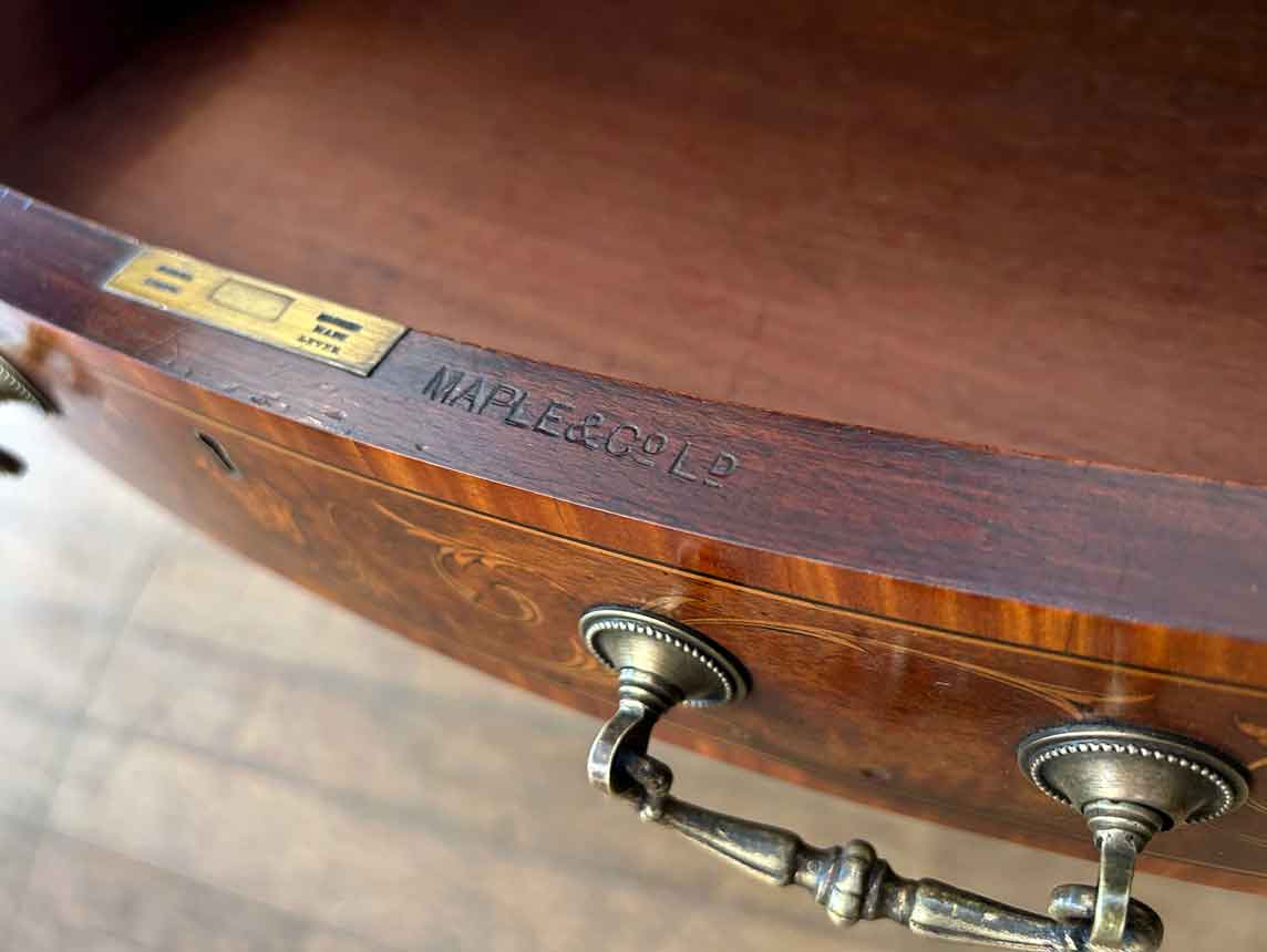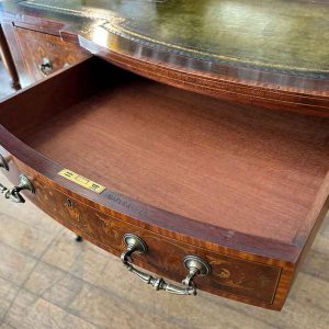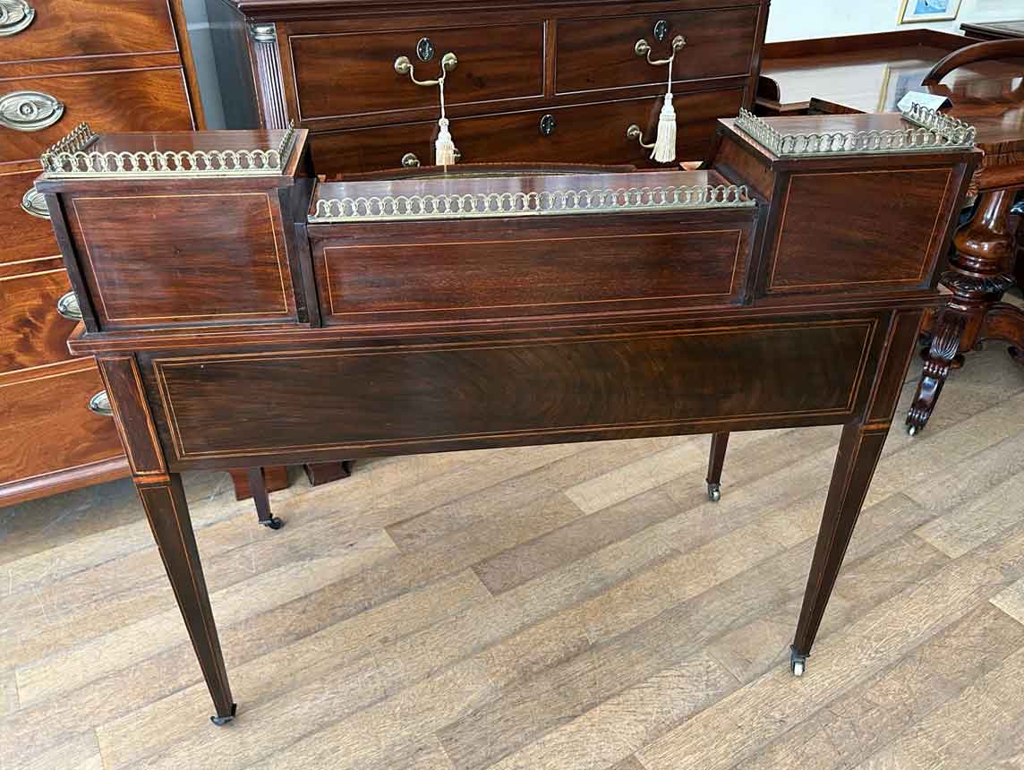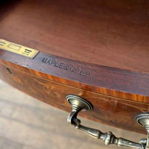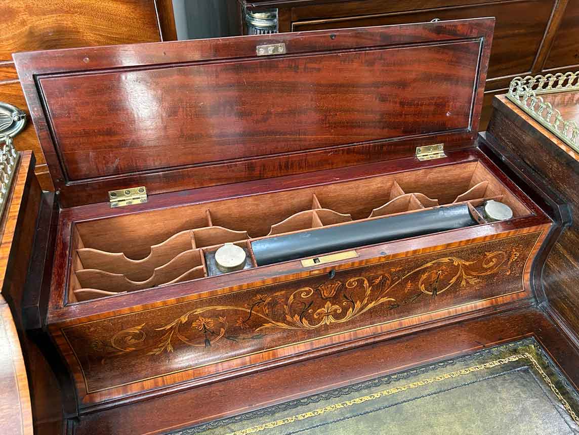 A very high quality 19th Century Carlton House Desk – Made by: Maple & Co. London Cabinet Makers for high quality furniture. The top has a brass gallery with two drawers and three lift up compartments, which include pigeon holes and ink wells. Below the writing surface there are three mahogany lined drawers with brass handles. The whole desk is heavily inlaid throughout with marquetry, stands on square tapered legs with boxwood line inlay and terminates with brass castors.