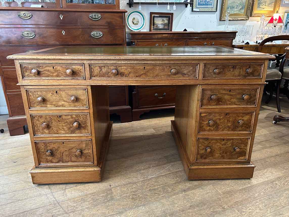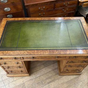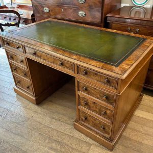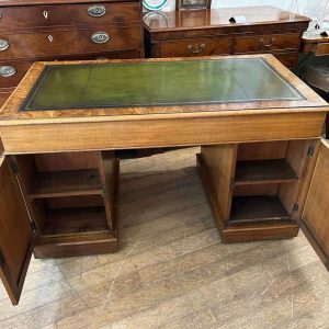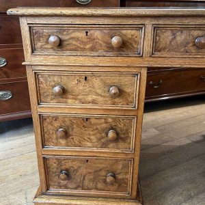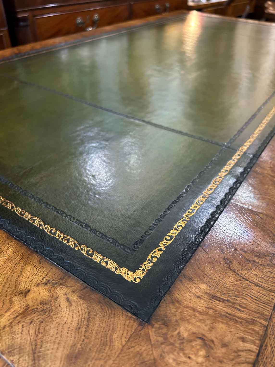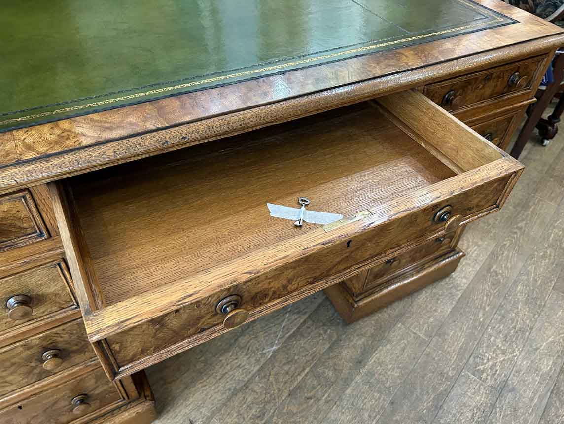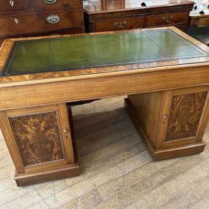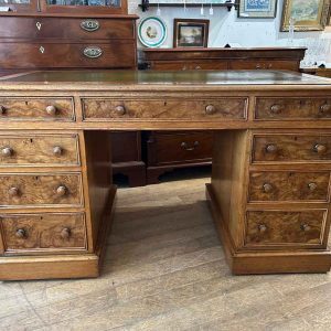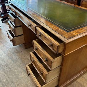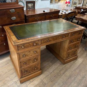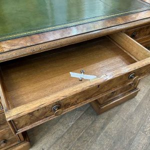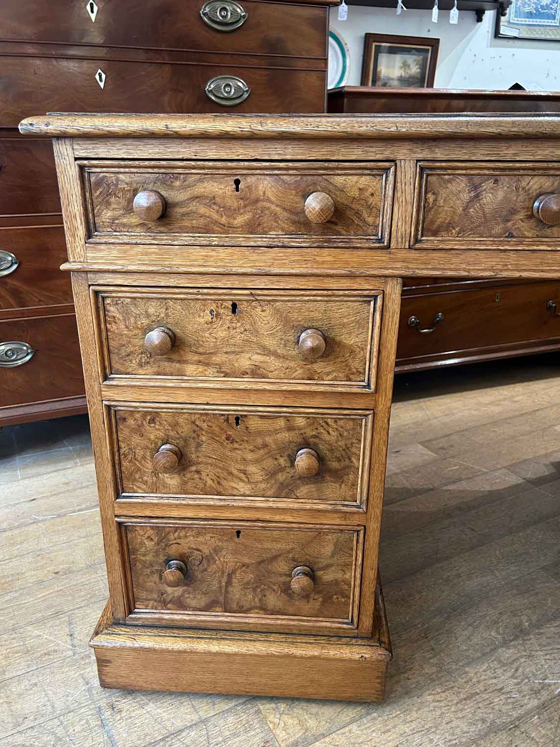 A very high quality Pollard Oak Partners Pedestal Desk with tooled leathered writing surface. Above 9 drawers and 2 cupboards with solid oak lined drawers and original bun handles on plinth base. Comes apart in three separate sections.