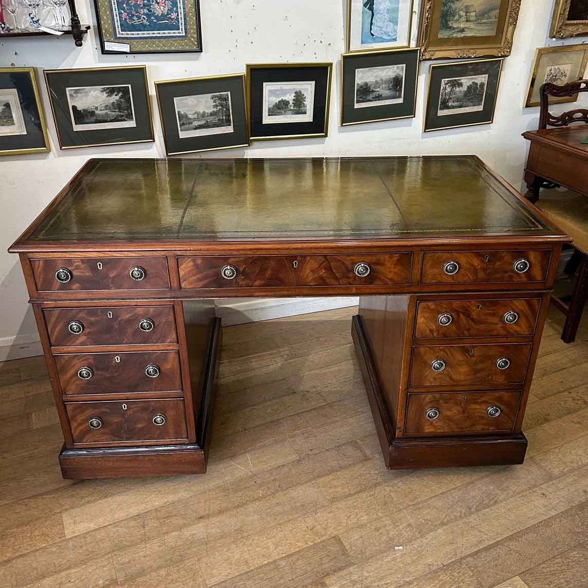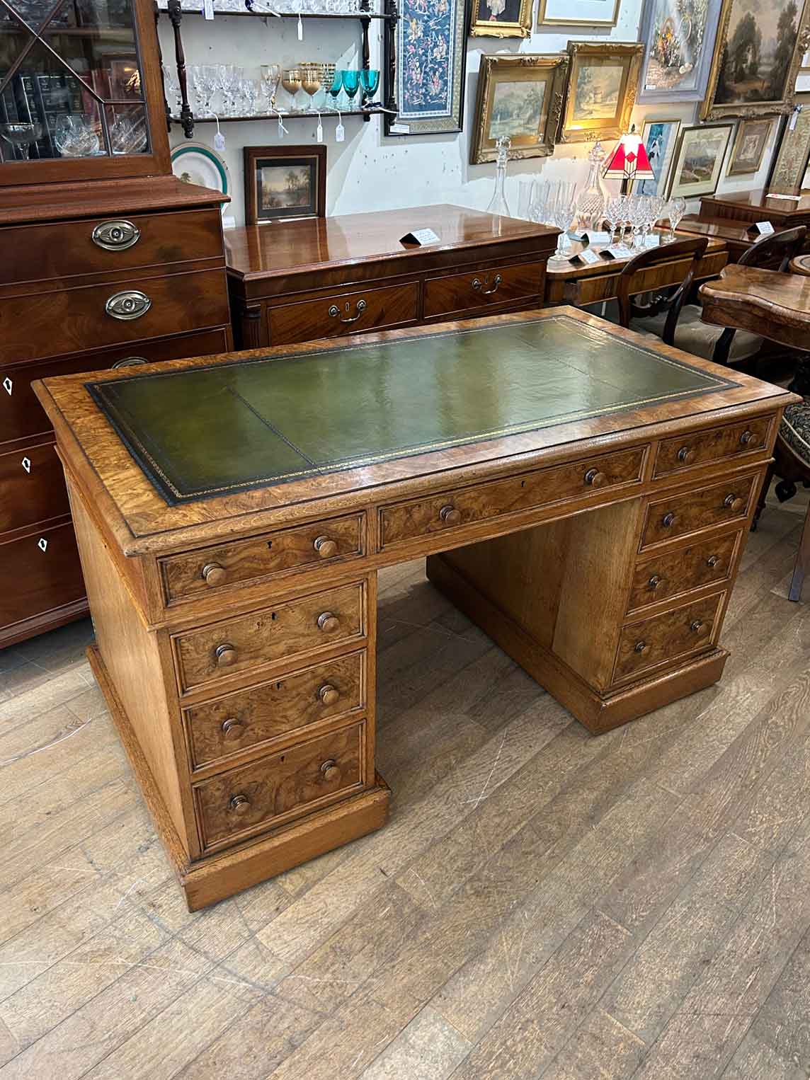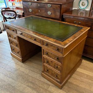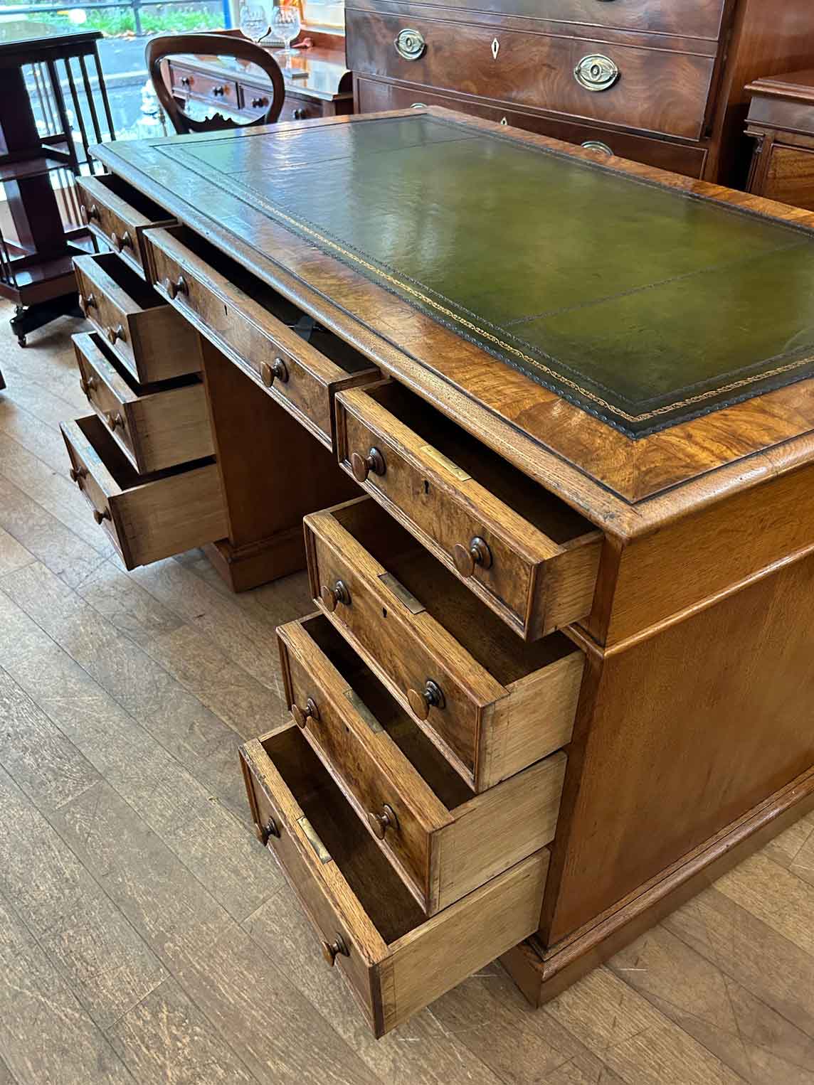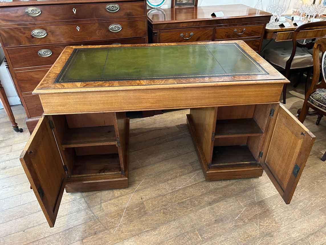 A very high quality Pollard Oak Partners Pedestal Desk with tooled leathered writing surface. Above 9 drawers and 2 cupboards with solid oak lined drawers and original bun handles on plinth base. Comes apart in three separate sections.