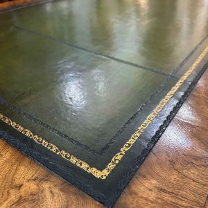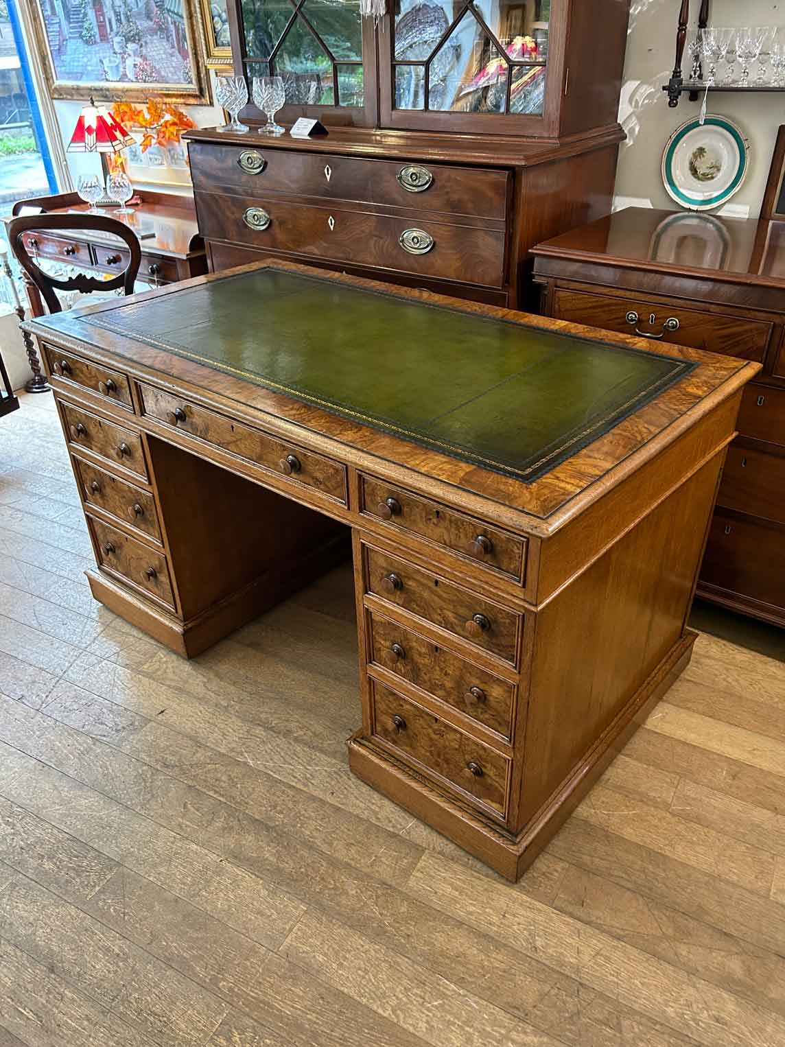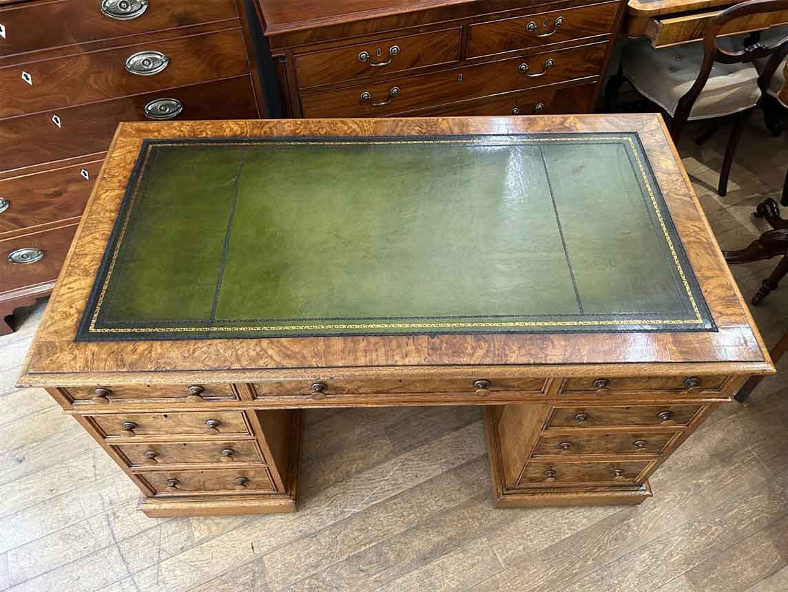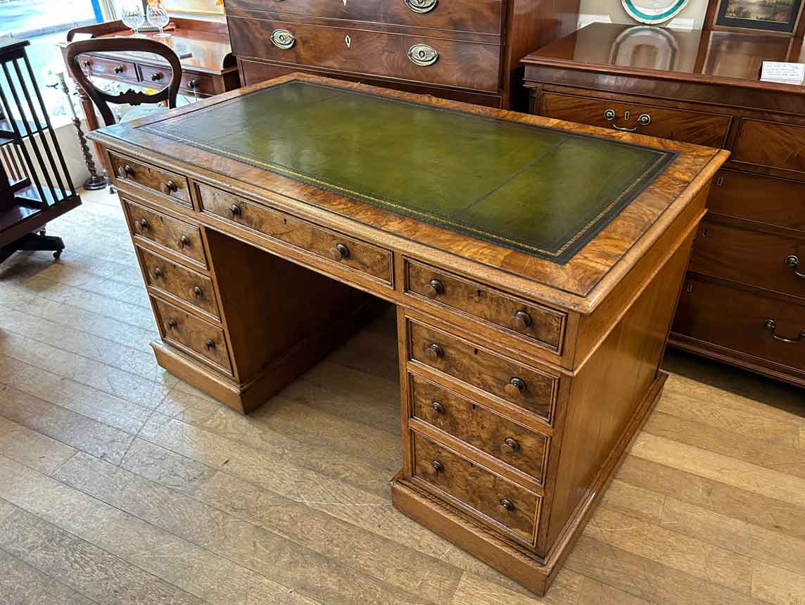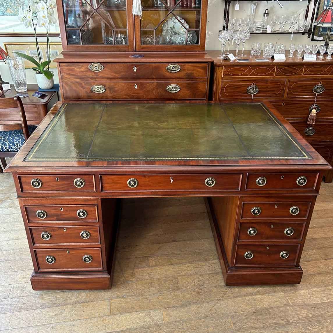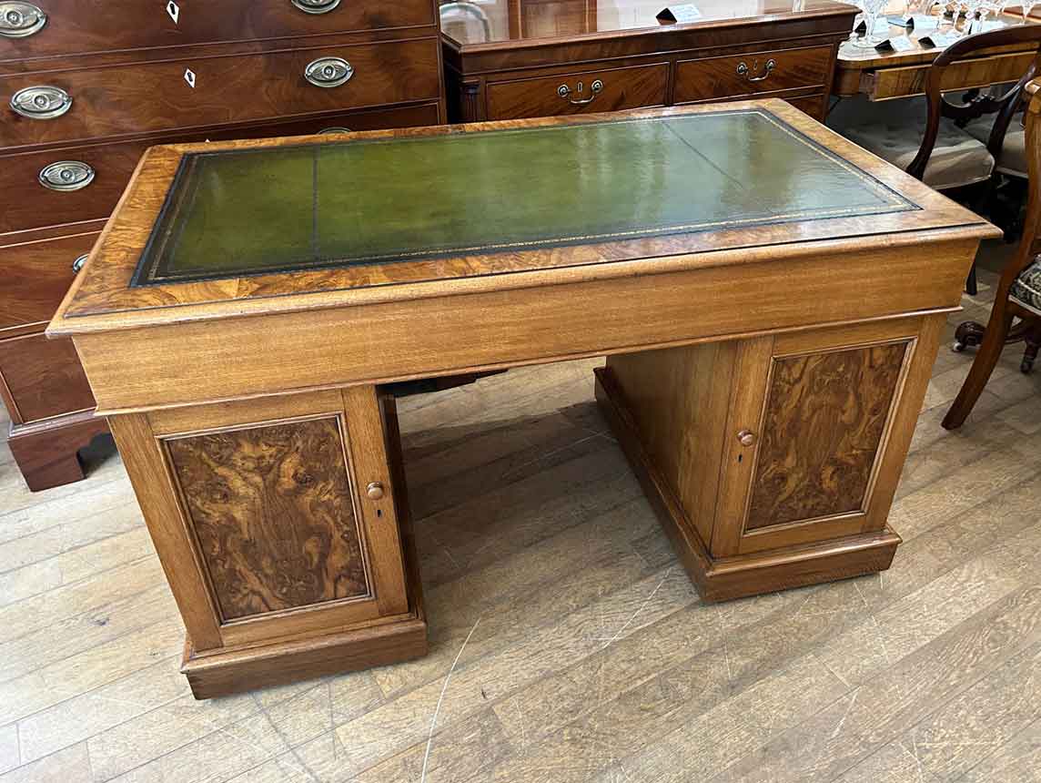 A very high quality Pollard Oak Partners Pedestal Desk with tooled leathered writing surface. Above 9 drawers and 2 cupboards with solid oak lined drawers and original bun handles on plinth base. Comes apart in three separate sections.