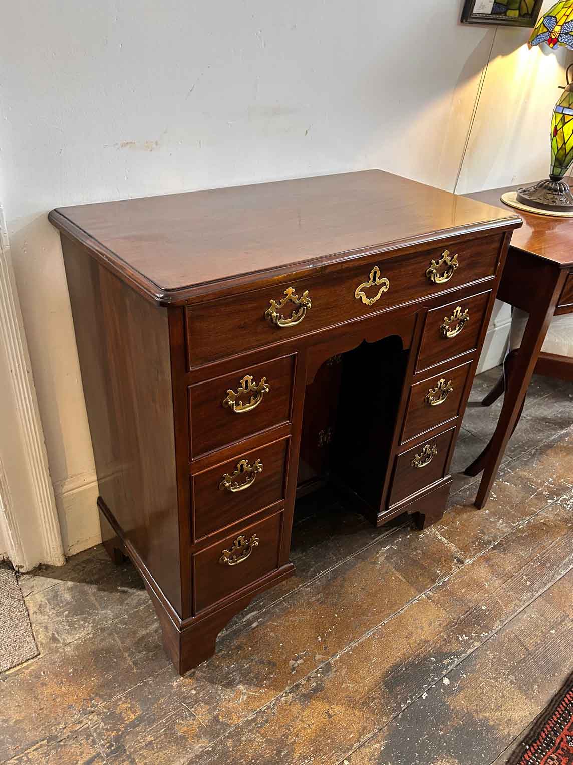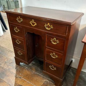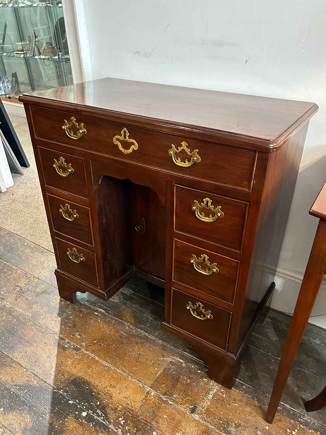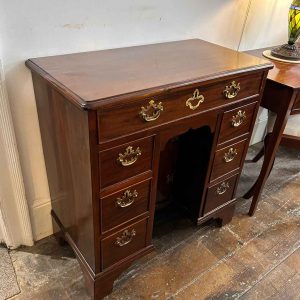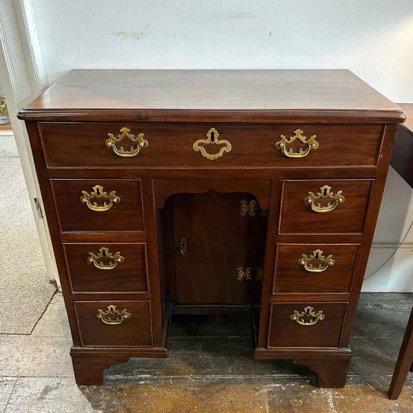 19th Century Georgian Mahogany Knee Hole Desk with seven drawers, cupboard to centre, fitted with brass handles on a bracket feet.