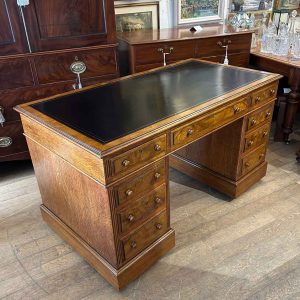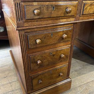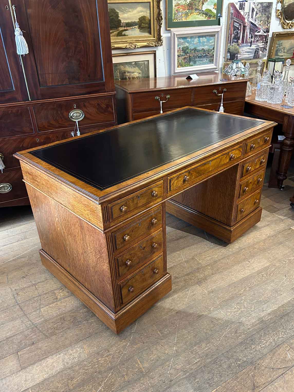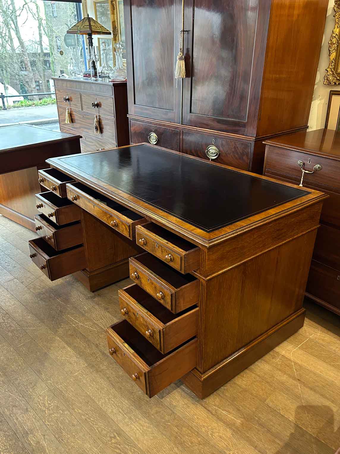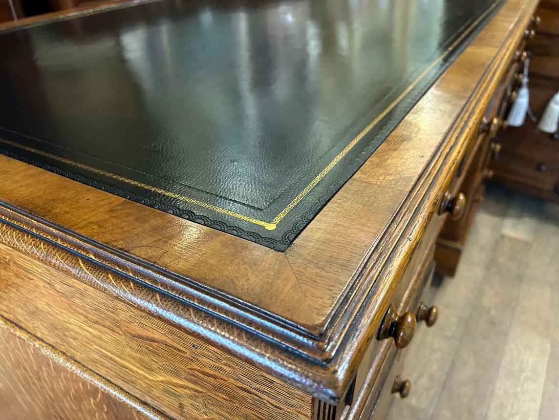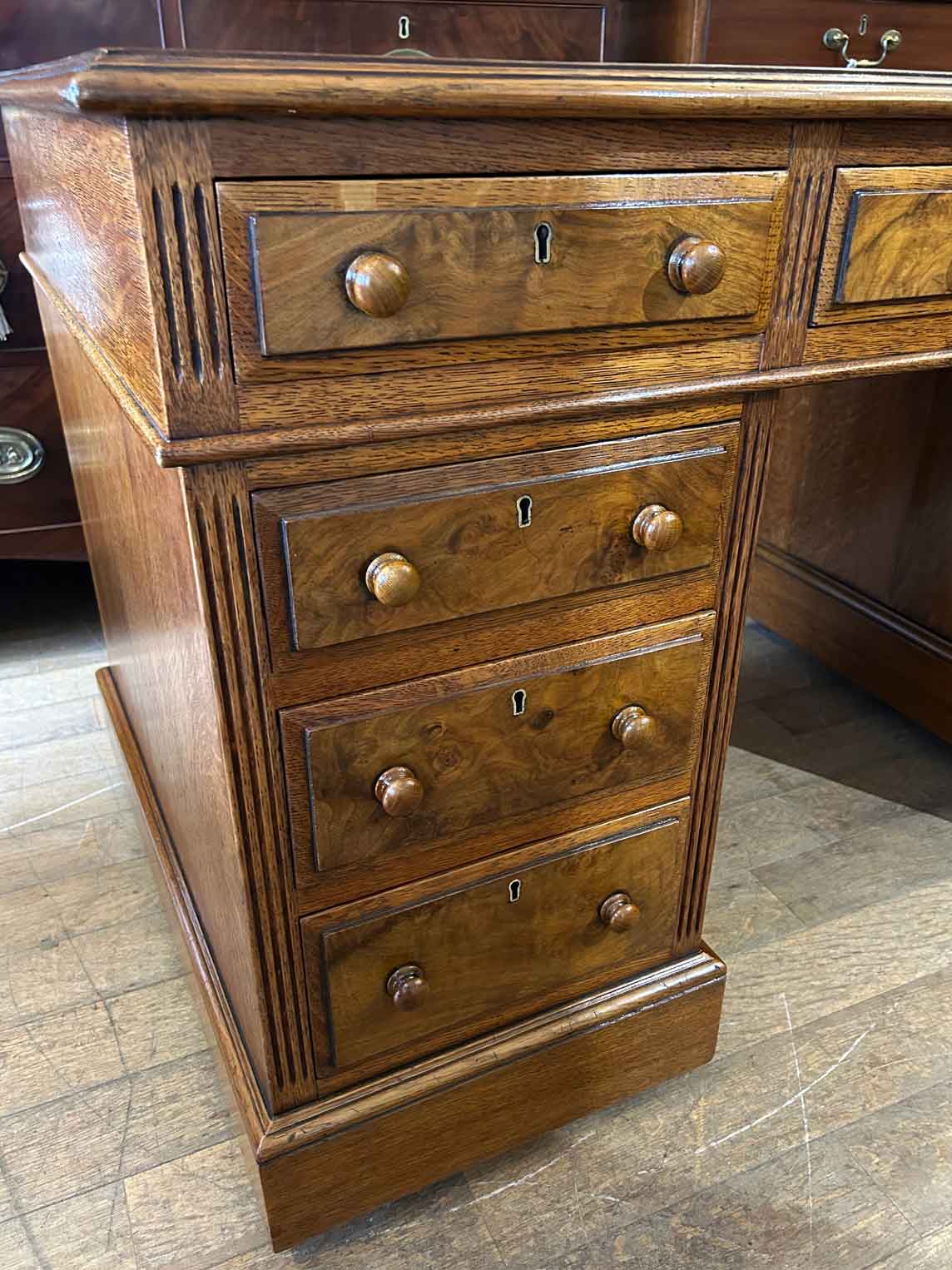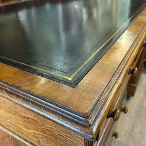 19th Century Victorian Oak & Walnut Pedestal Desk, with newly replaced black hide leather top with gilt tooling, nine drawers all fitted with turned wooden handles and mahogany lined drawers and two keys for the central drawer. Comes apart in three separate sections.