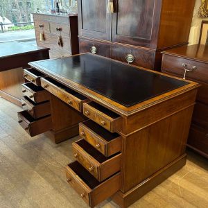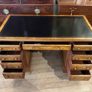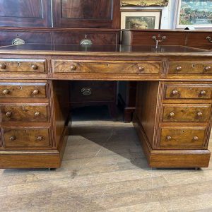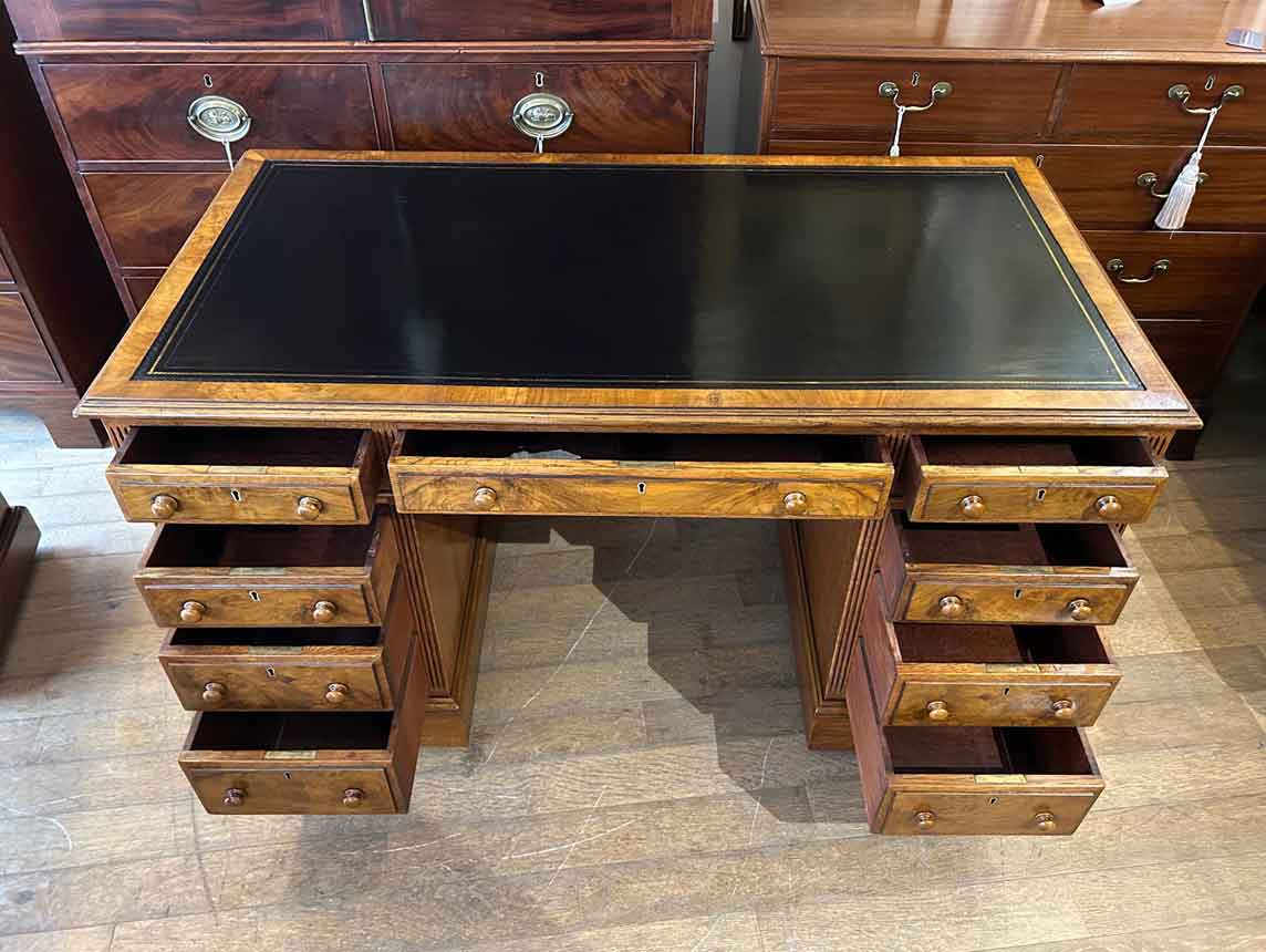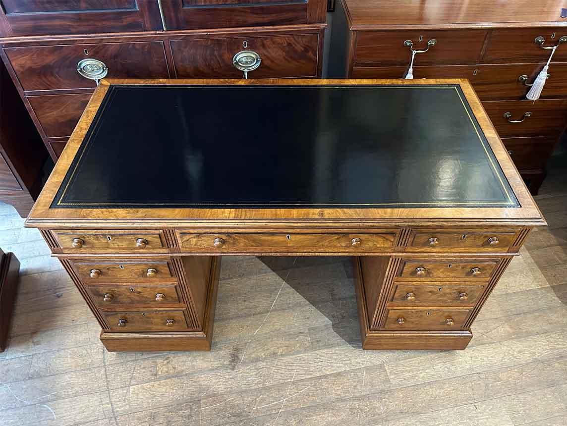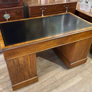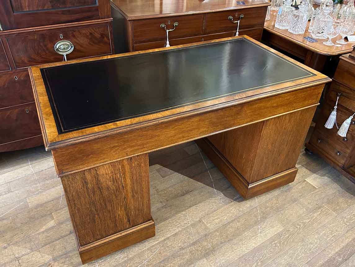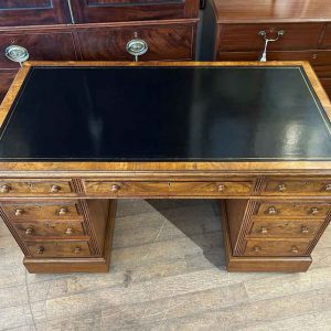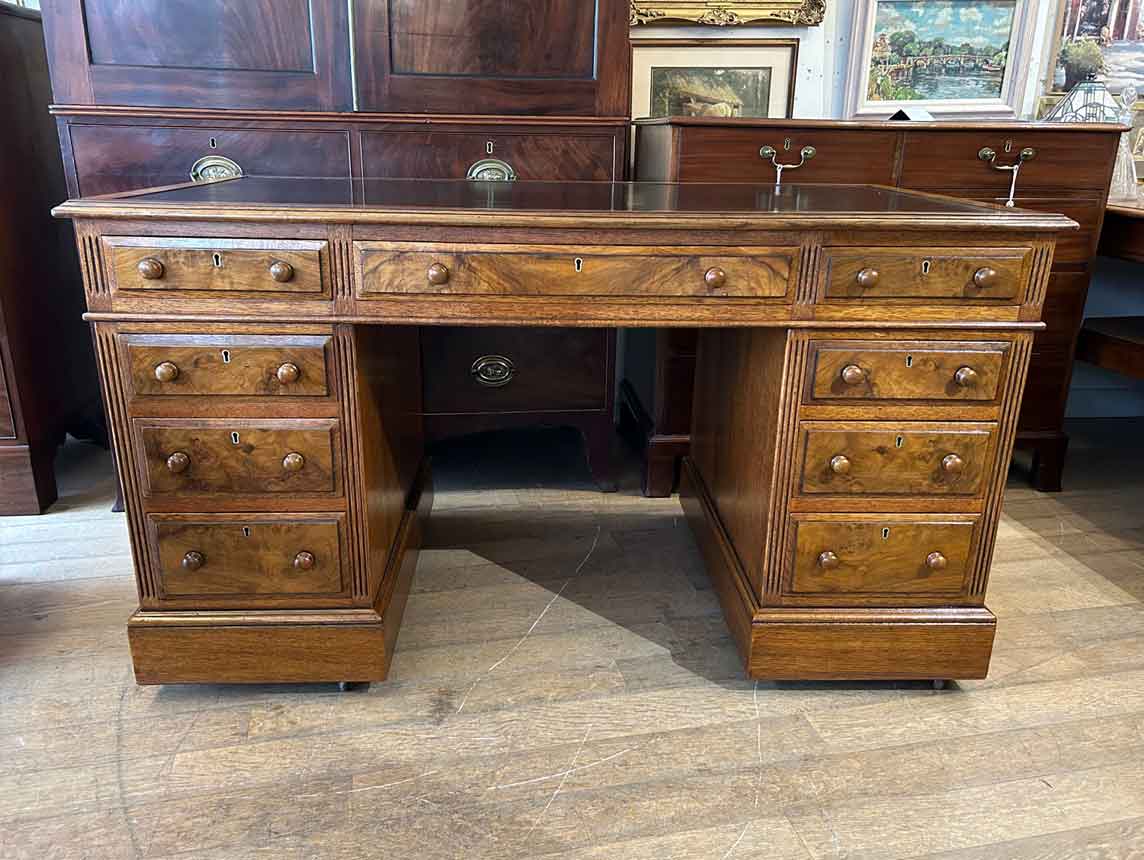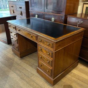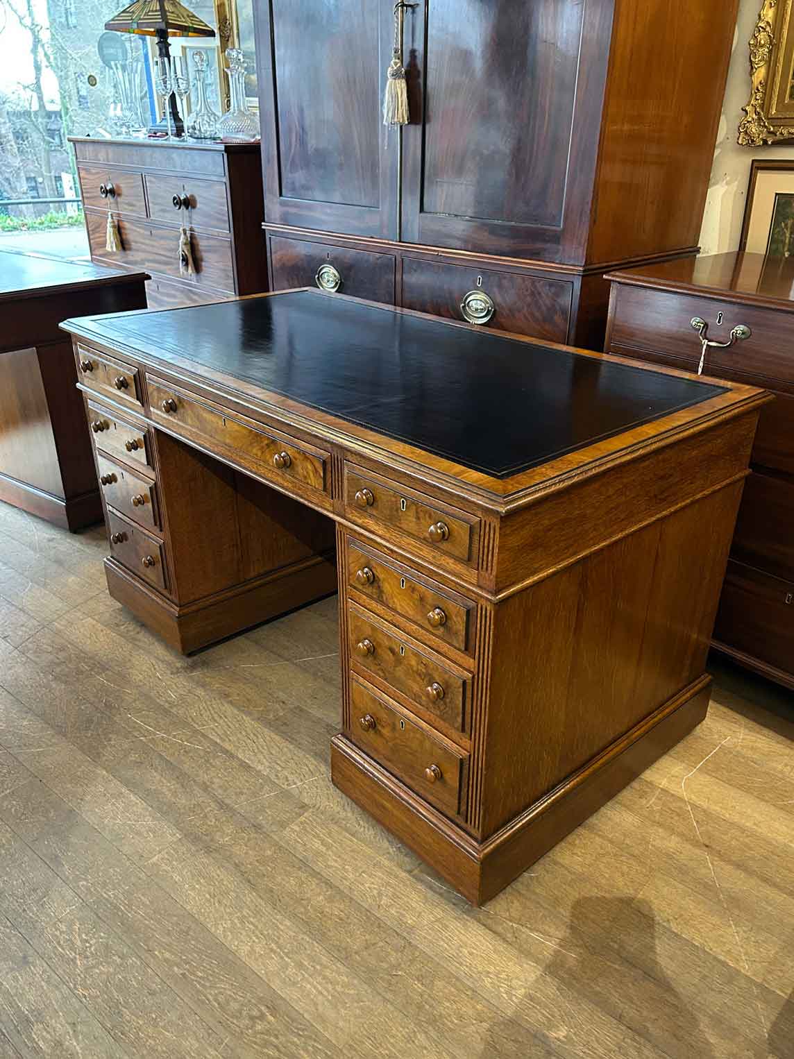 19th Century Victorian Oak & Walnut Pedestal Desk, with newly replaced black hide leather top with gilt tooling, nine drawers all fitted with turned wooden handles and mahogany lined drawers and two keys for the central drawer. Comes apart in three separate sections.