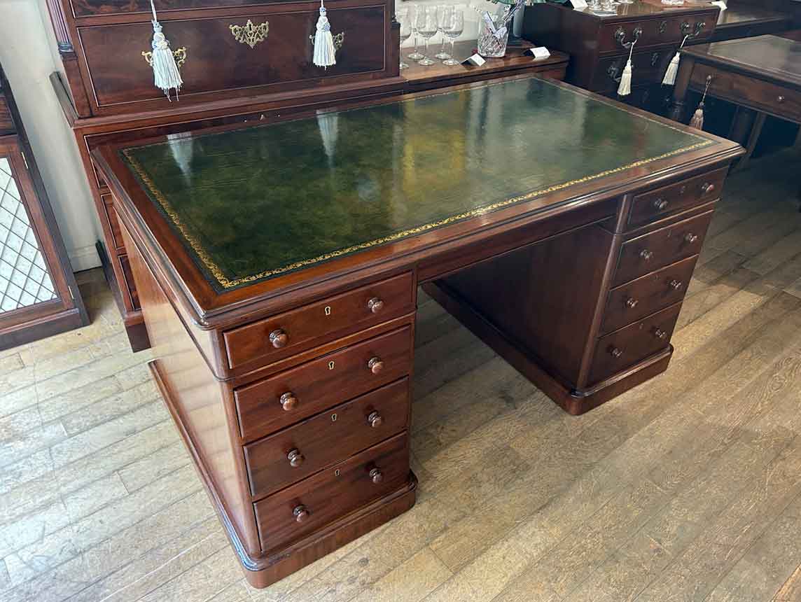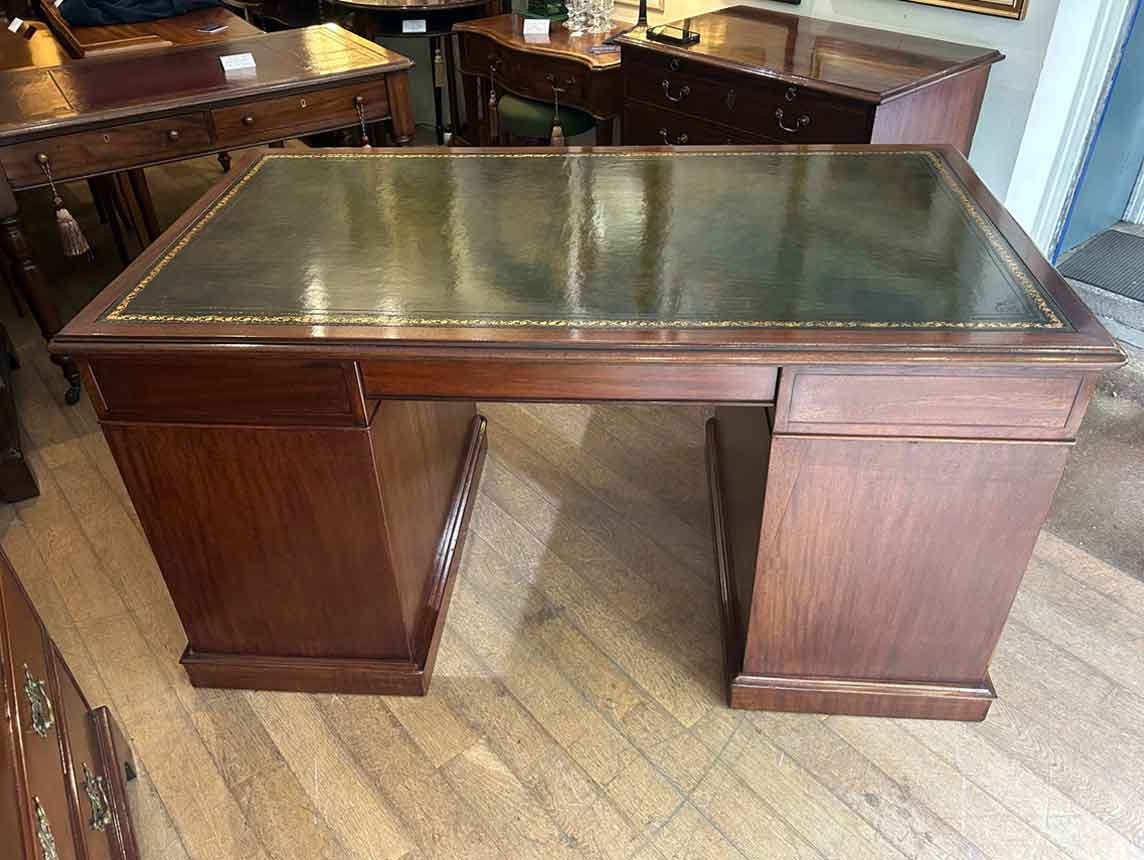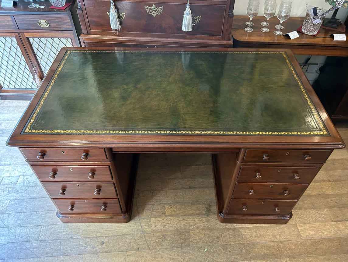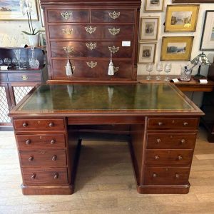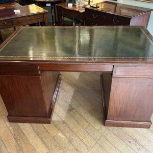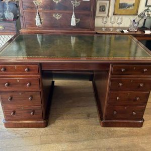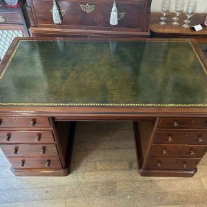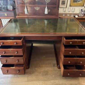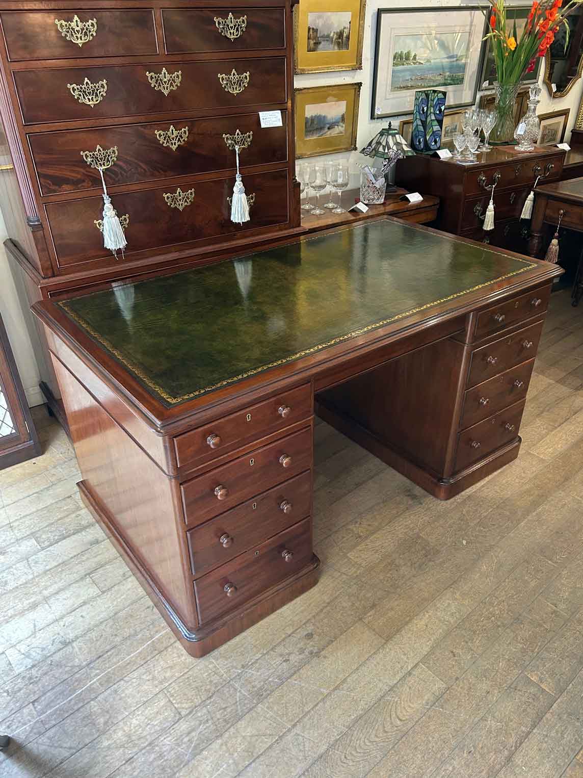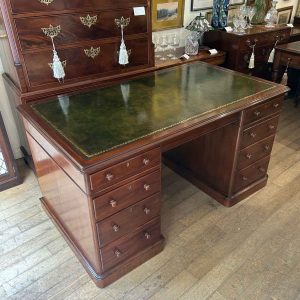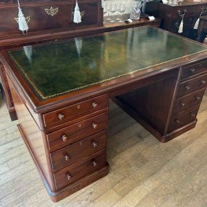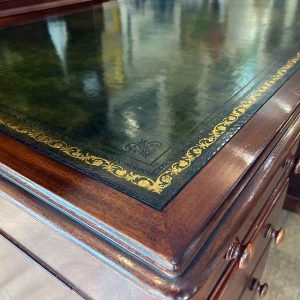 19th Century Mahogany Pedestal Desk, with green hide leather top and gilt tooling, eight drawers all fitted with round turned knob handles with two working keys. Comes apart in three separate sections.