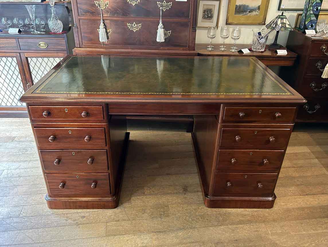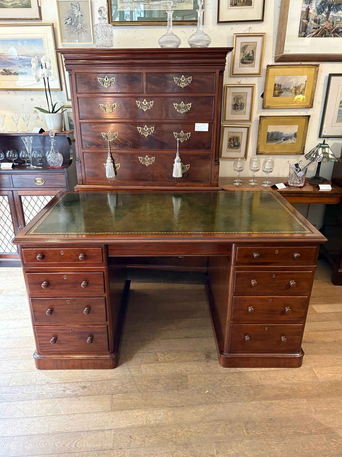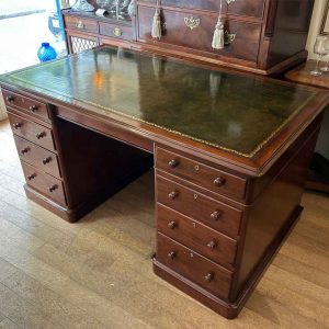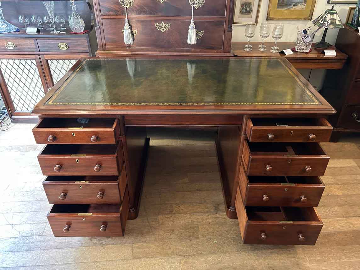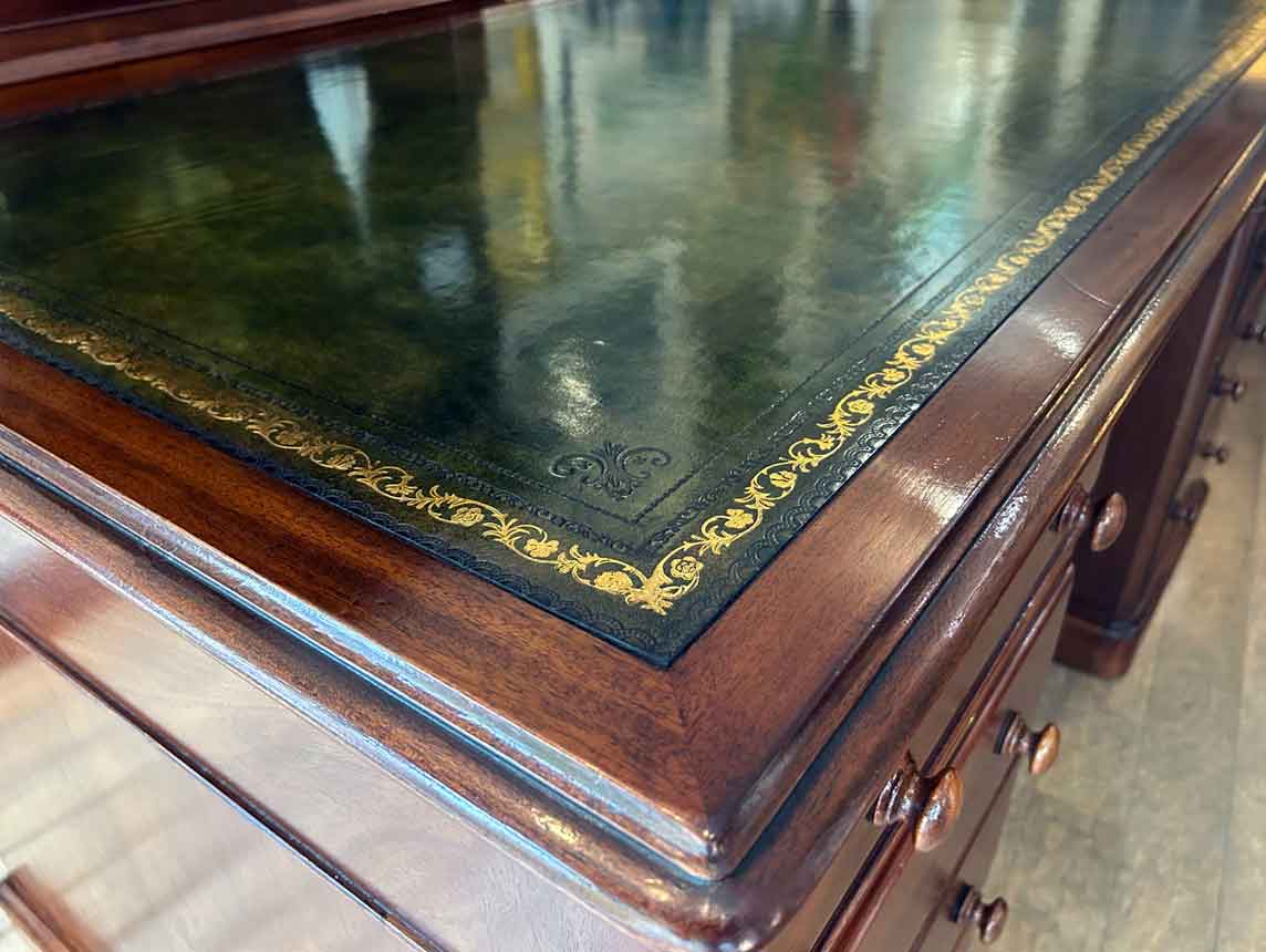 19th Century Mahogany Pedestal Desk, with green hide leather top and gilt tooling, eight drawers all fitted with round turned knob handles with two working keys. Comes apart in three separate sections.
