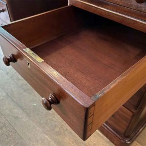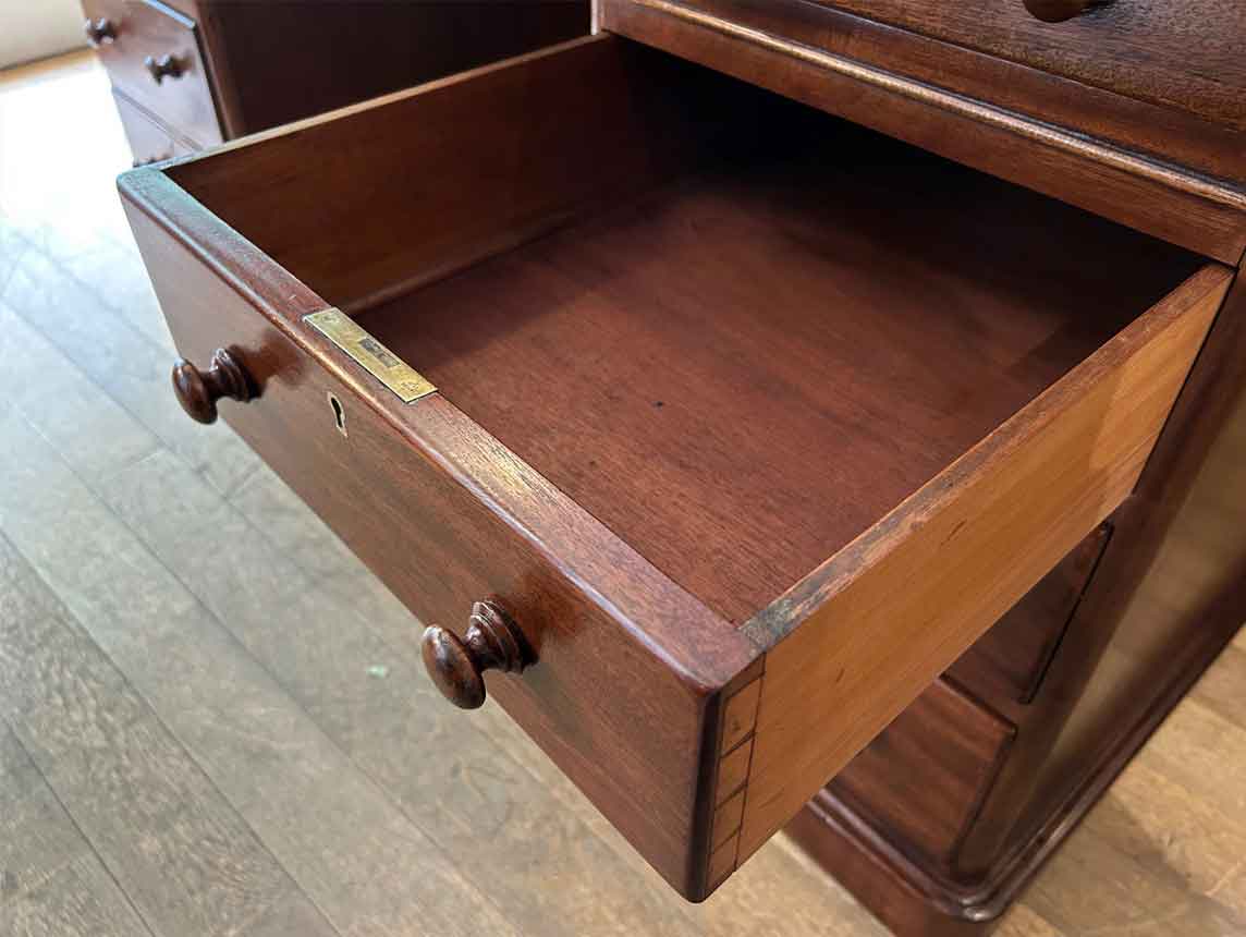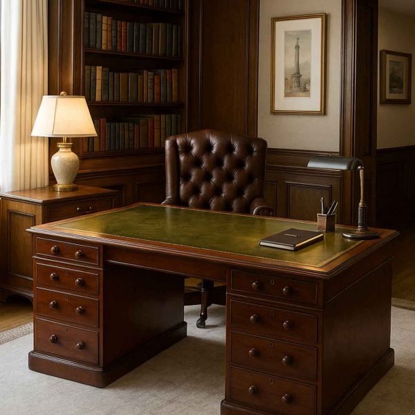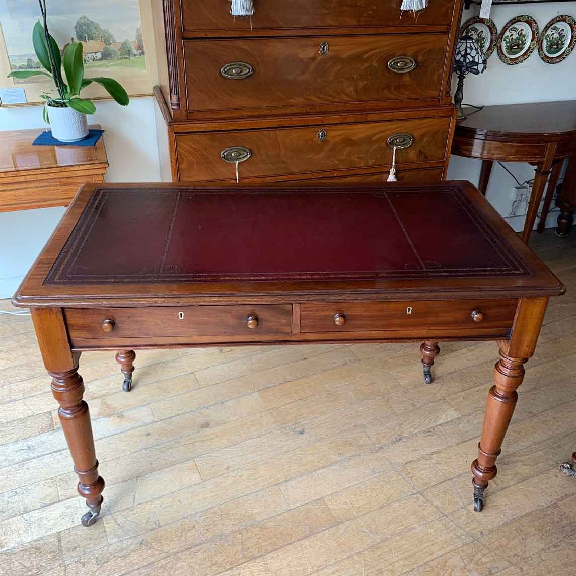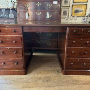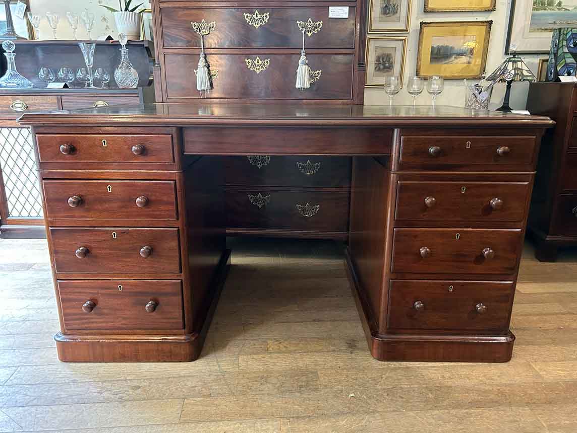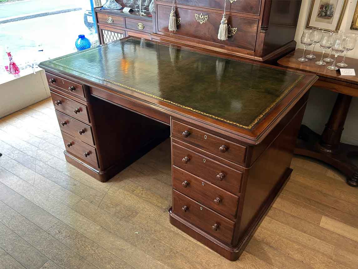 19th Century Mahogany Pedestal Desk, with green hide leather top and gilt tooling, eight drawers all fitted with round turned knob handles with two working keys. Comes apart in three separate sections.