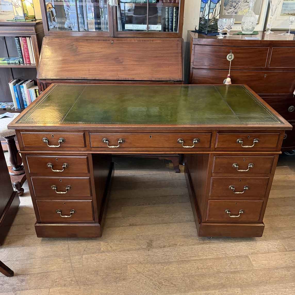 A very high quality 19th Century Victorian Mahogany Pedestal Desk with newly replaced green hide leather top with gilt tooling, nine drawers all fitted with turned wooden knob handles and mahogany lined drawers. Comes apart in three separate sections.