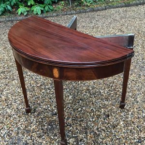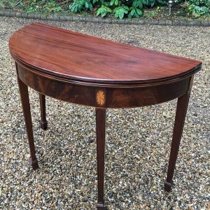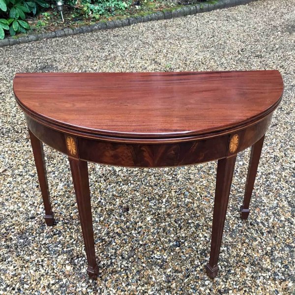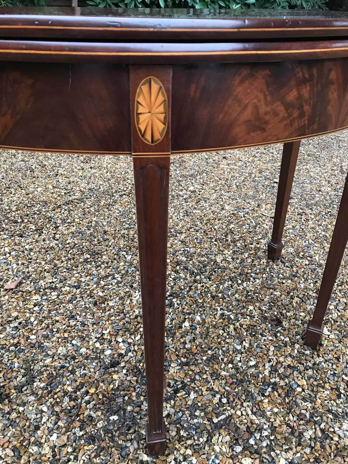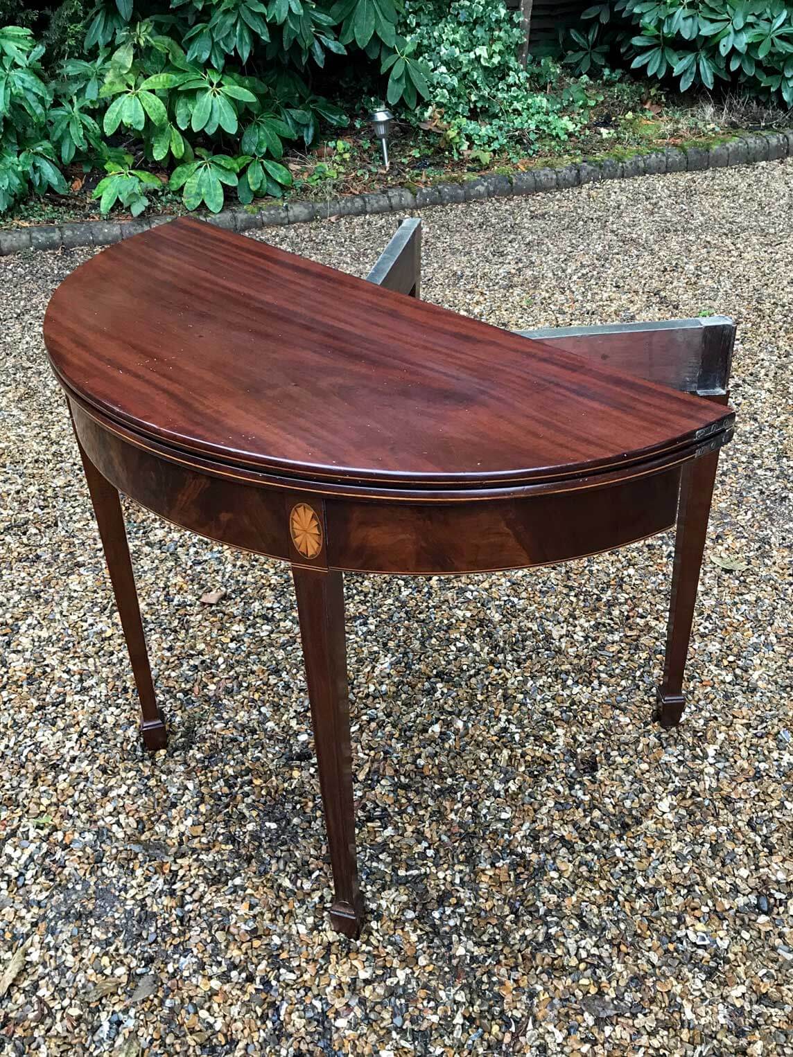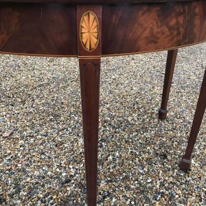 The demi lune solid mahogany top opens, supported by the adjustable rear leg below which is a frieze boxwood strung with satinwood banding. Above each finely tapered leg is a marquetry satinwood oval shell.