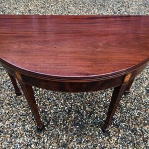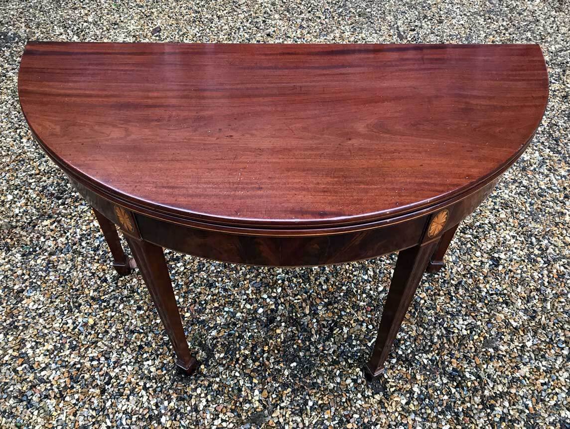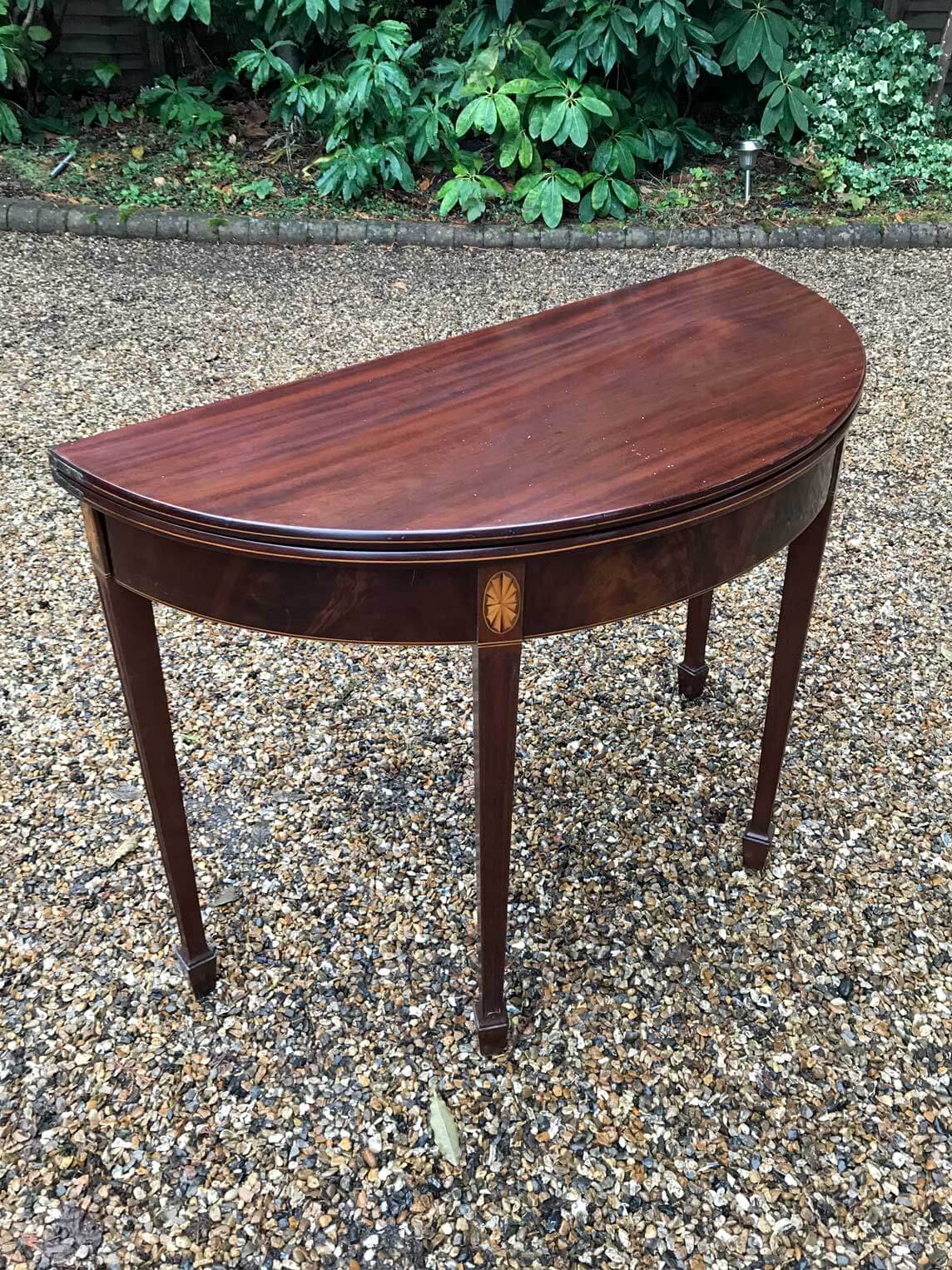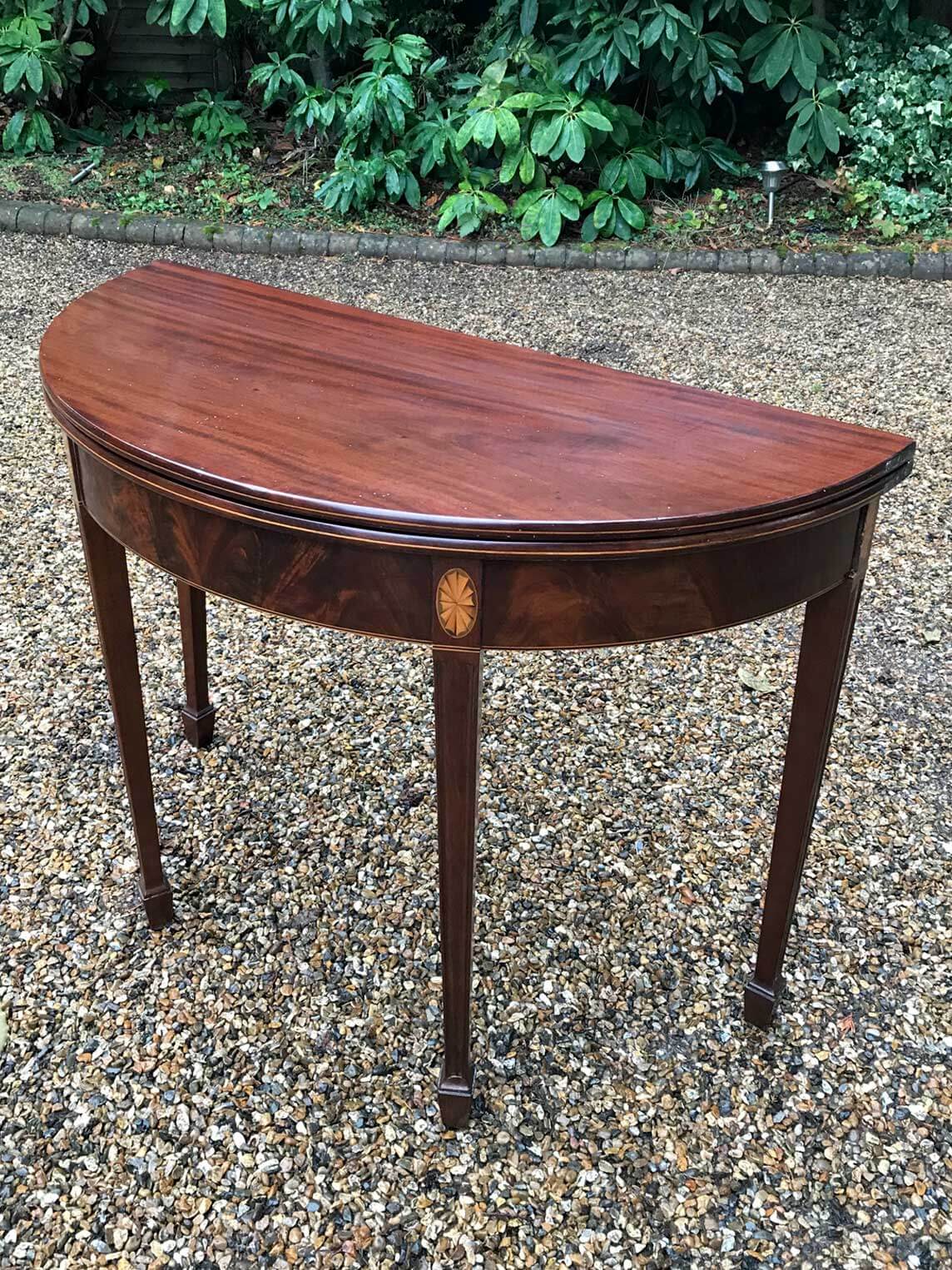 The demi lune solid mahogany top opens, supported by the adjustable rear leg below which is a frieze boxwood strung with satinwood banding. Above each finely tapered leg is a marquetry satinwood oval shell.