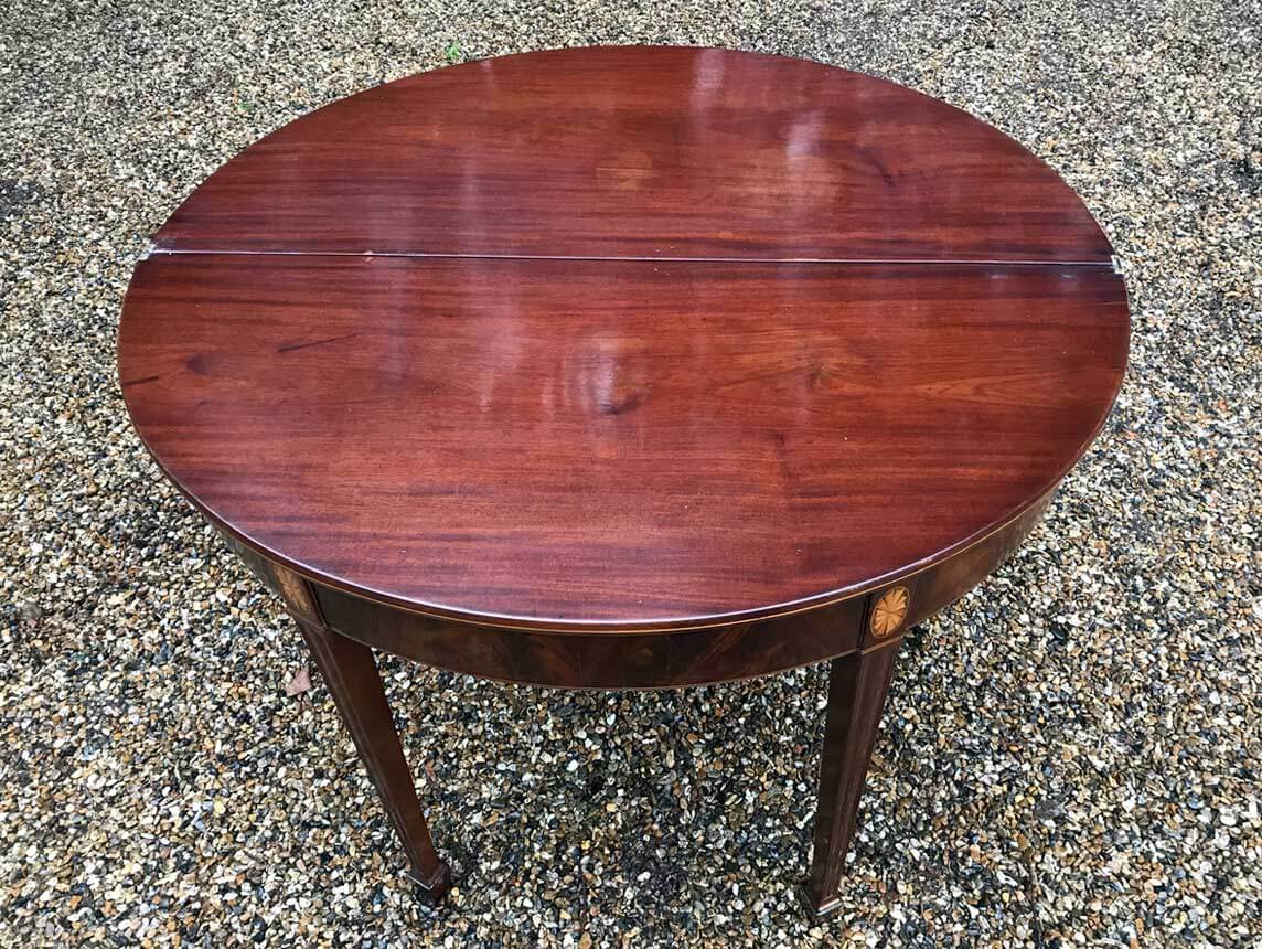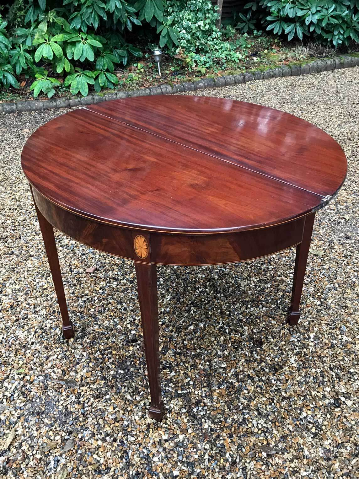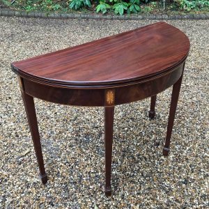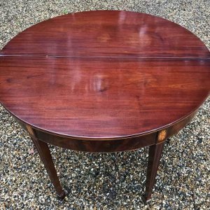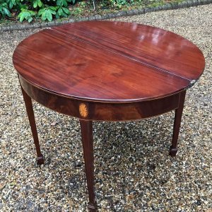 A fine quality George III inlaid mahogany tea table on tapering legs and with satinwood crossbanding.