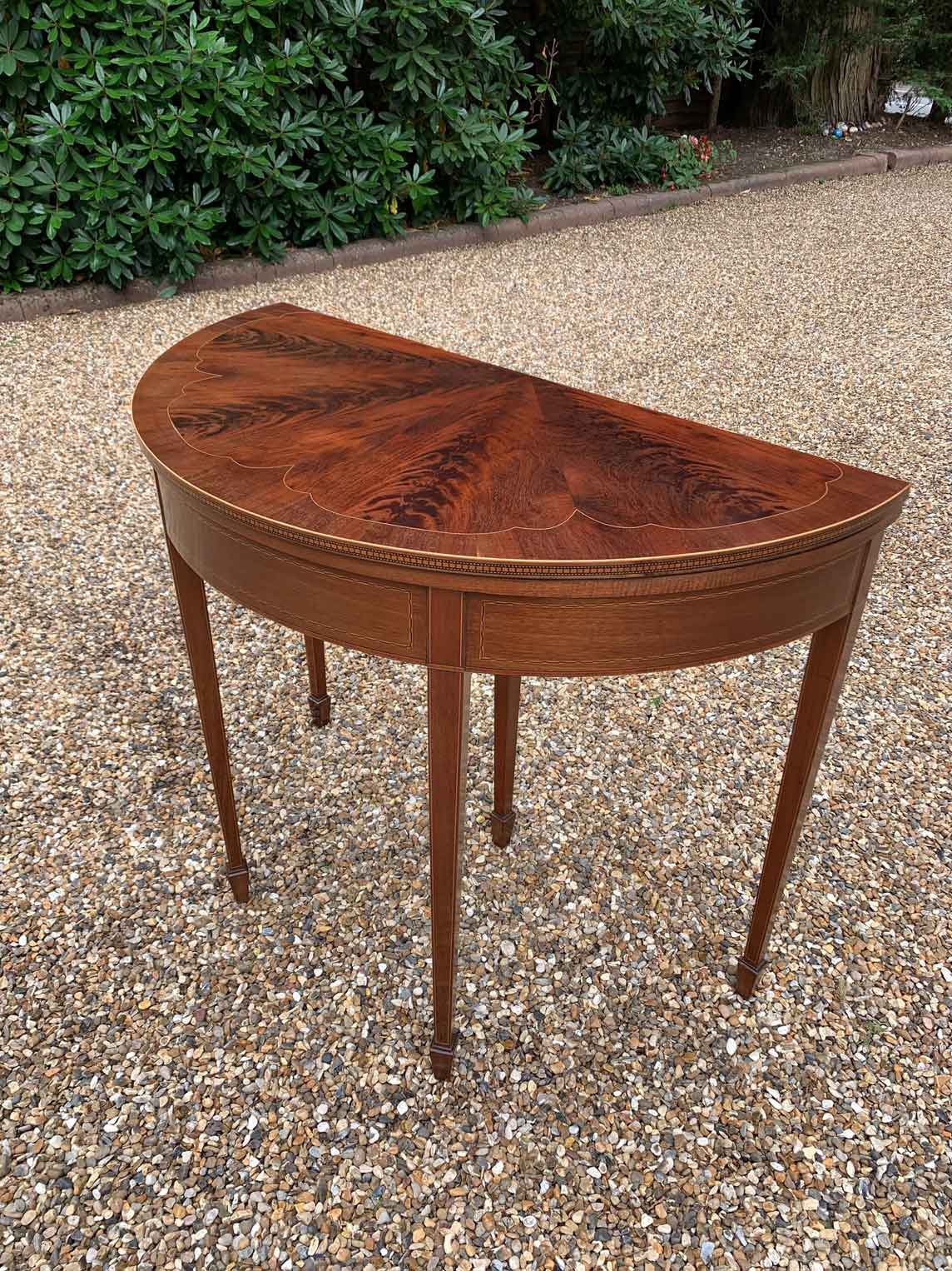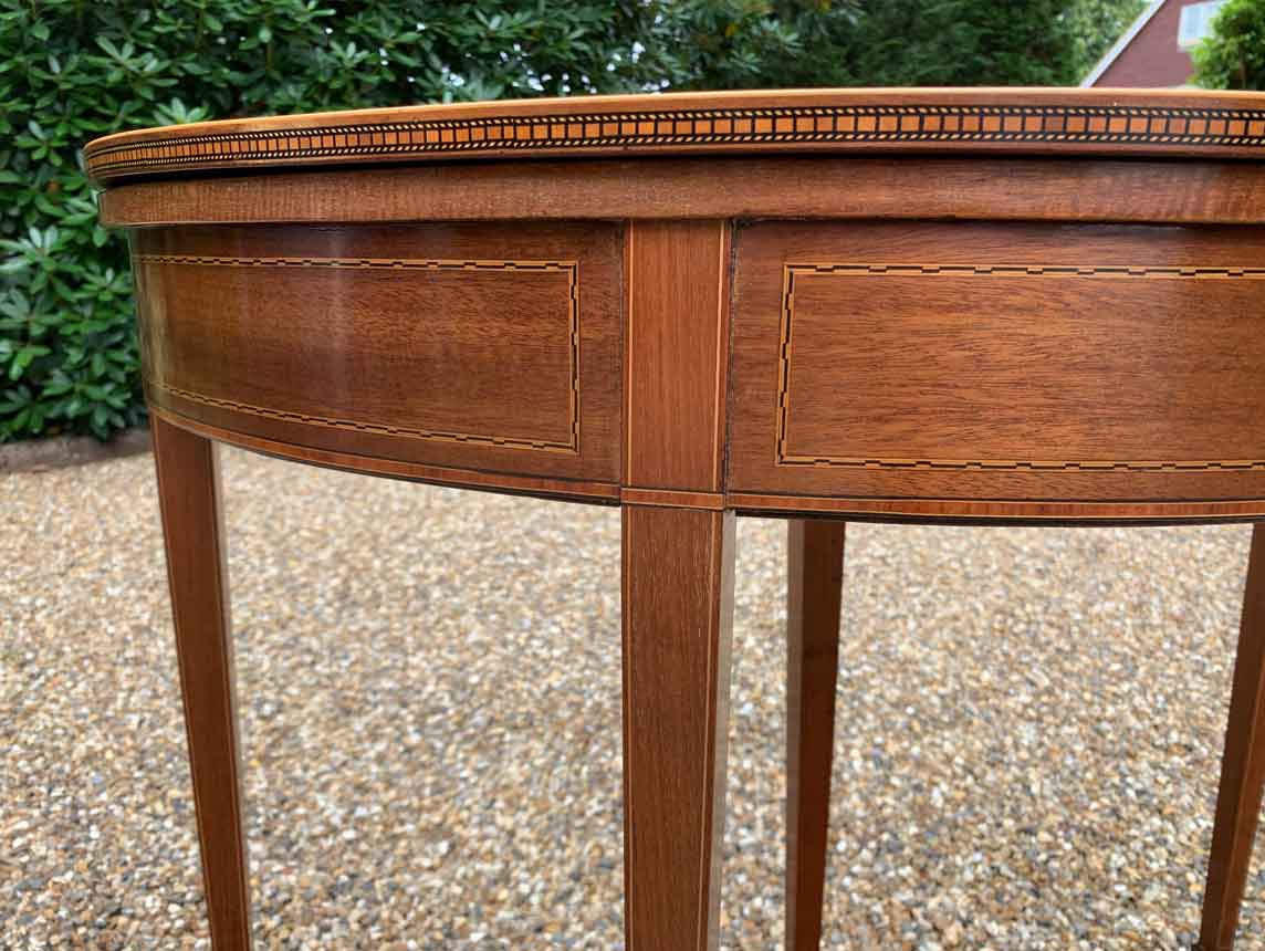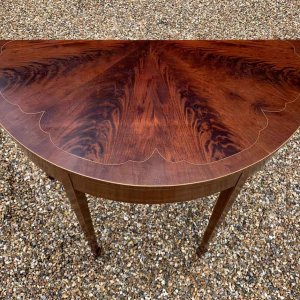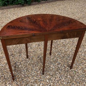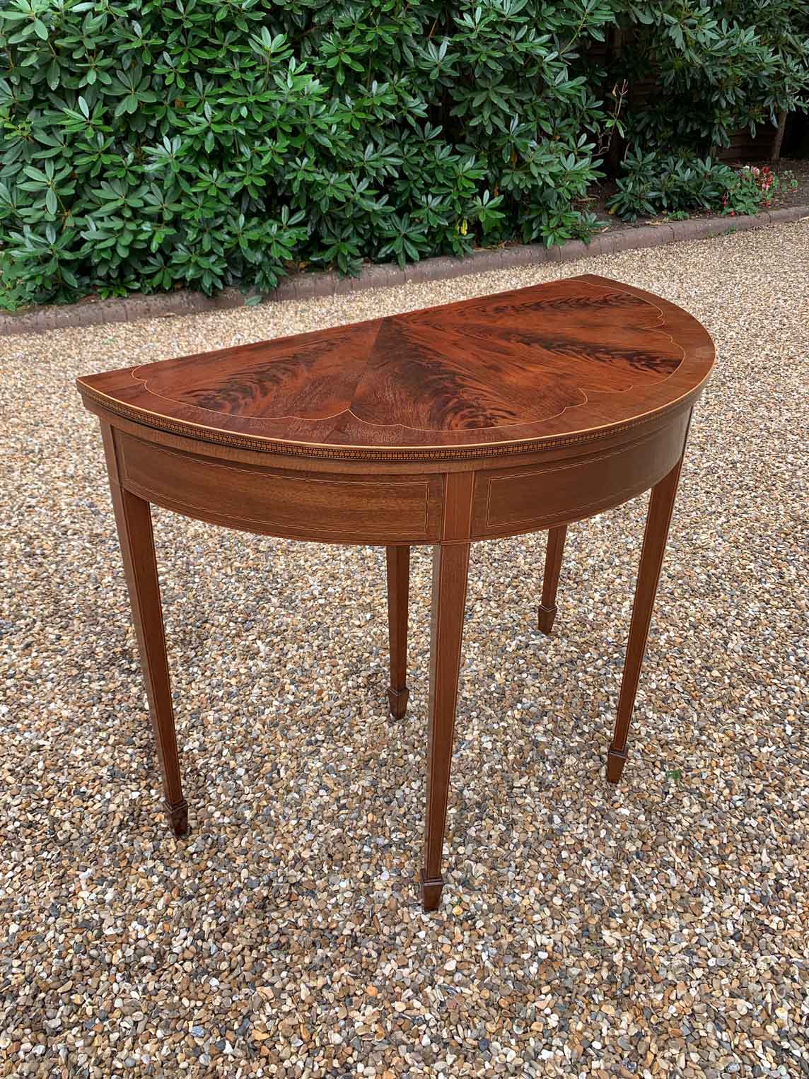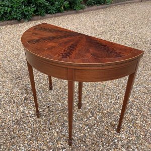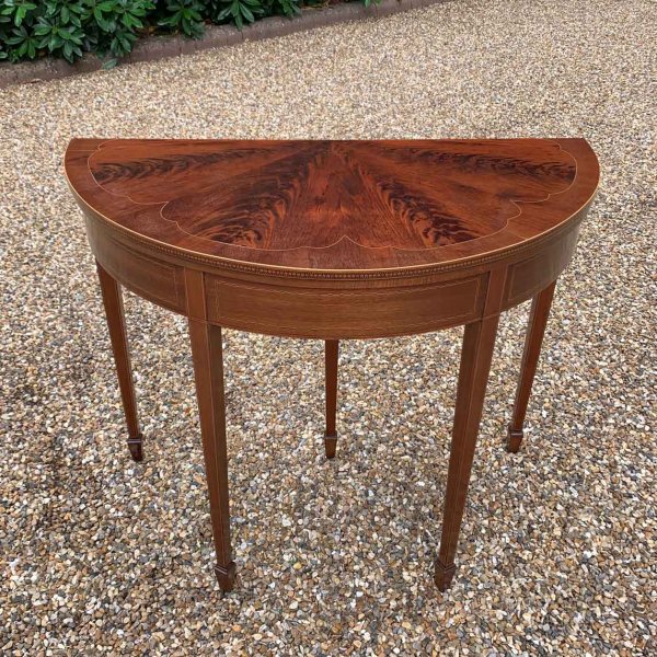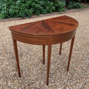 A Late 19th Century / Edwardian figured Mahogany Demi Lune Card Table with boxwood line and chequer inlaid borders, on square tapering legs and spade feet.