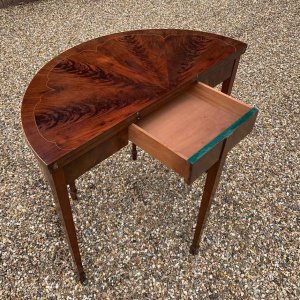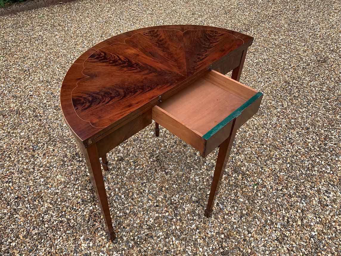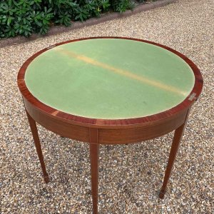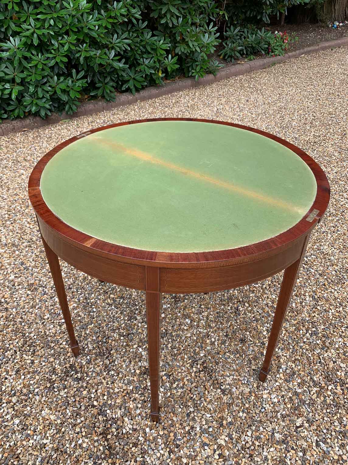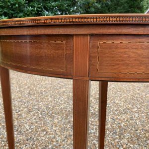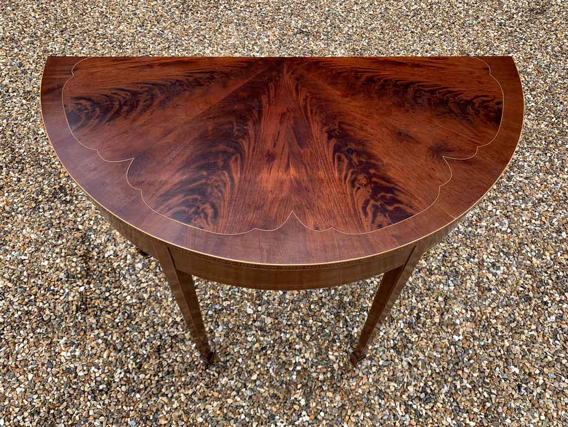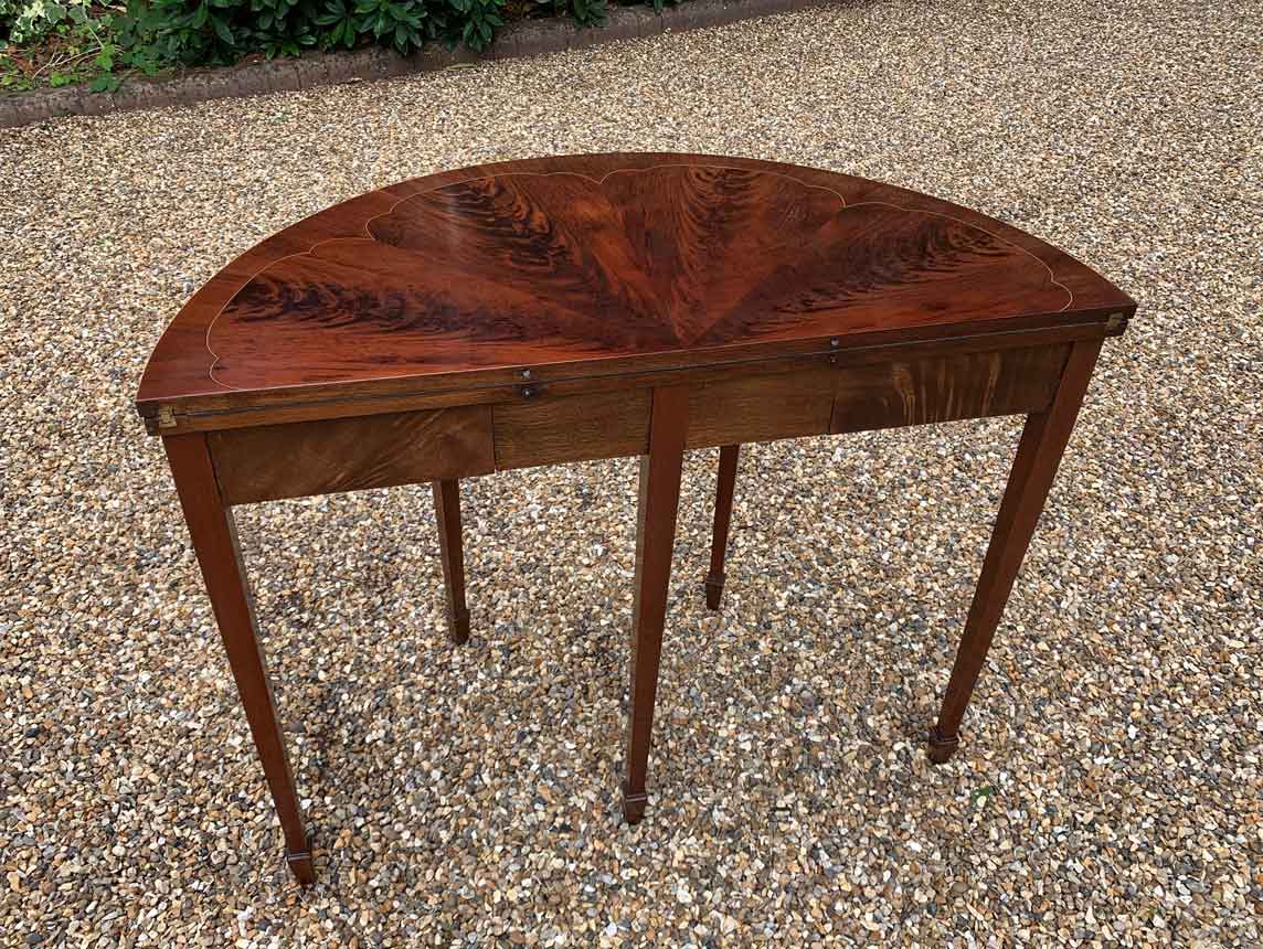 A Late 19th Century / Edwardian figured Mahogany Demi Lune Card Table with boxwood line and chequer inlaid borders, on square tapering legs and spade feet.
