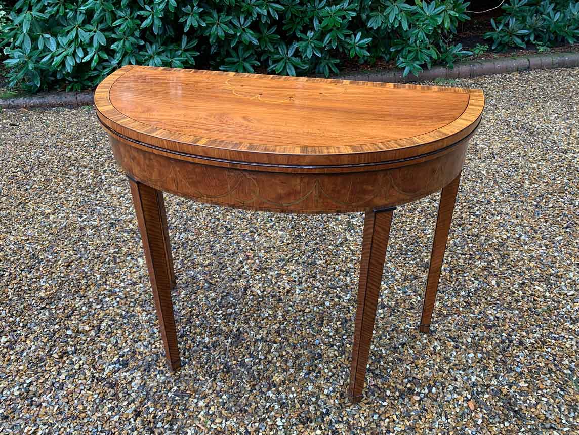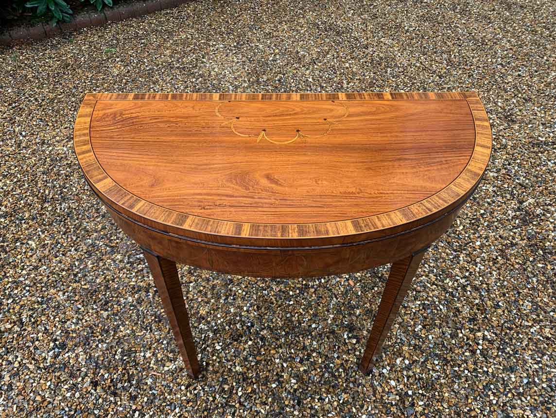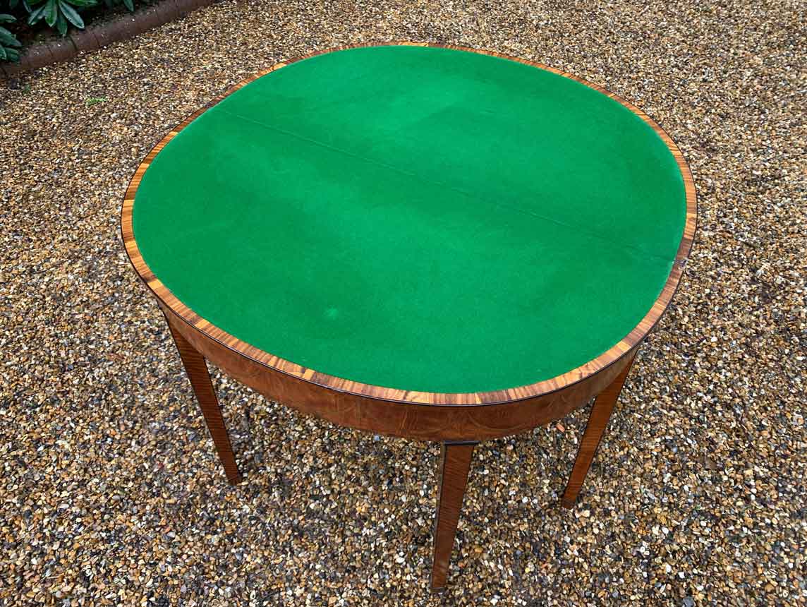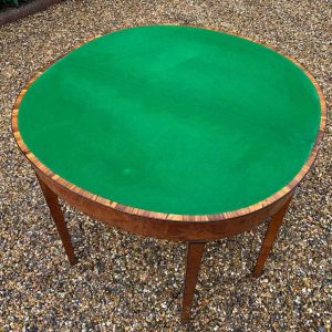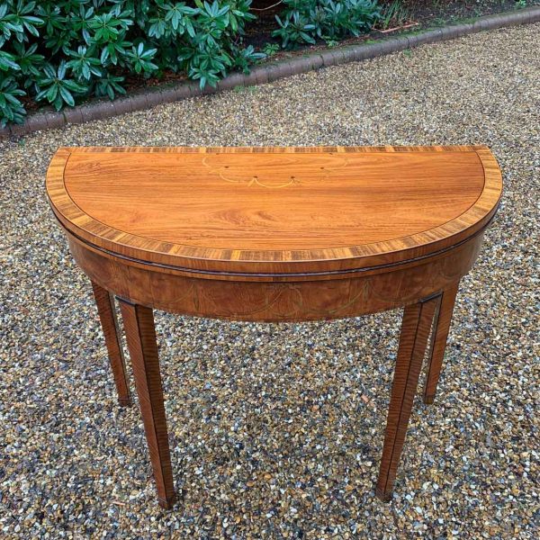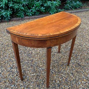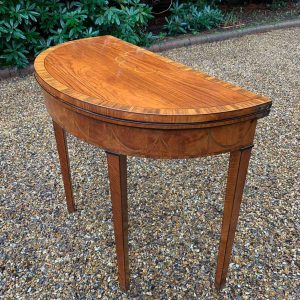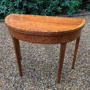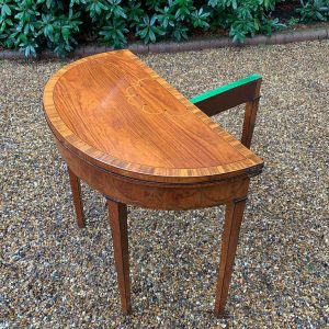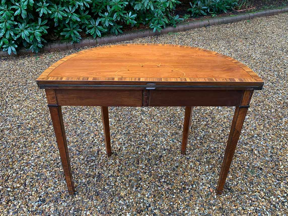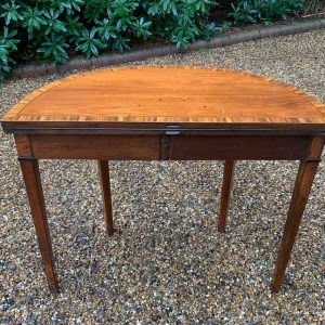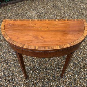 George III Demi Lune Card Table with a figured marquetry inlaid top with crossbanded rosewood, boxwood and ebony, raised on mahogany square tapering legs.