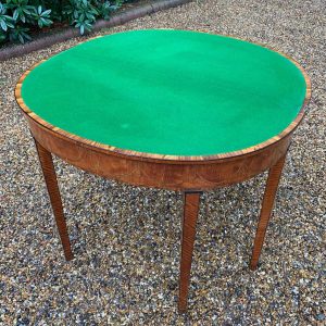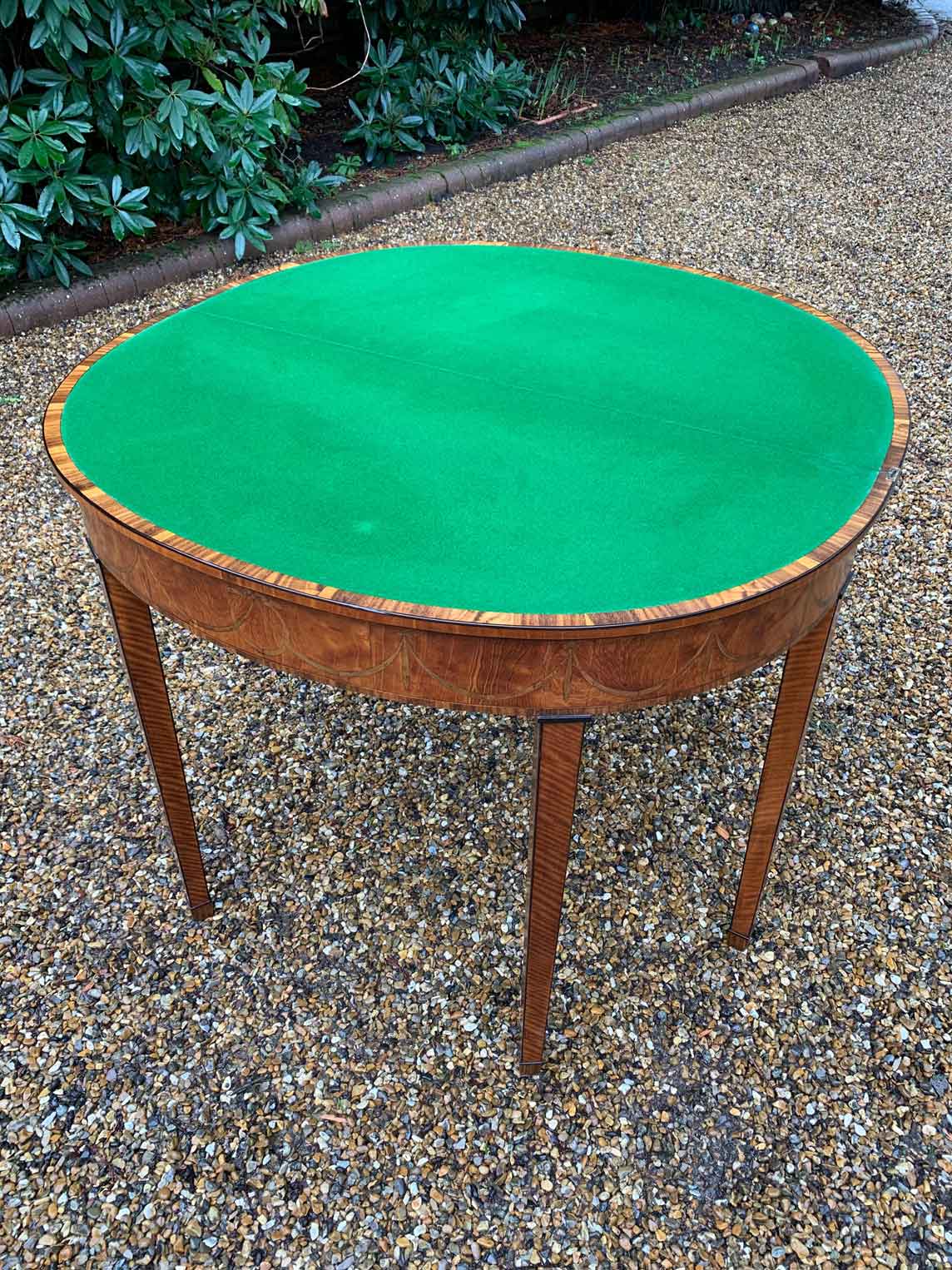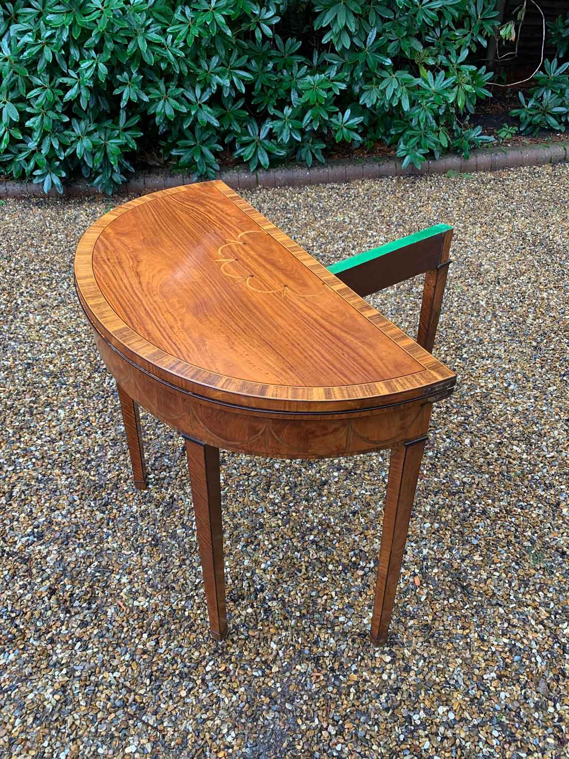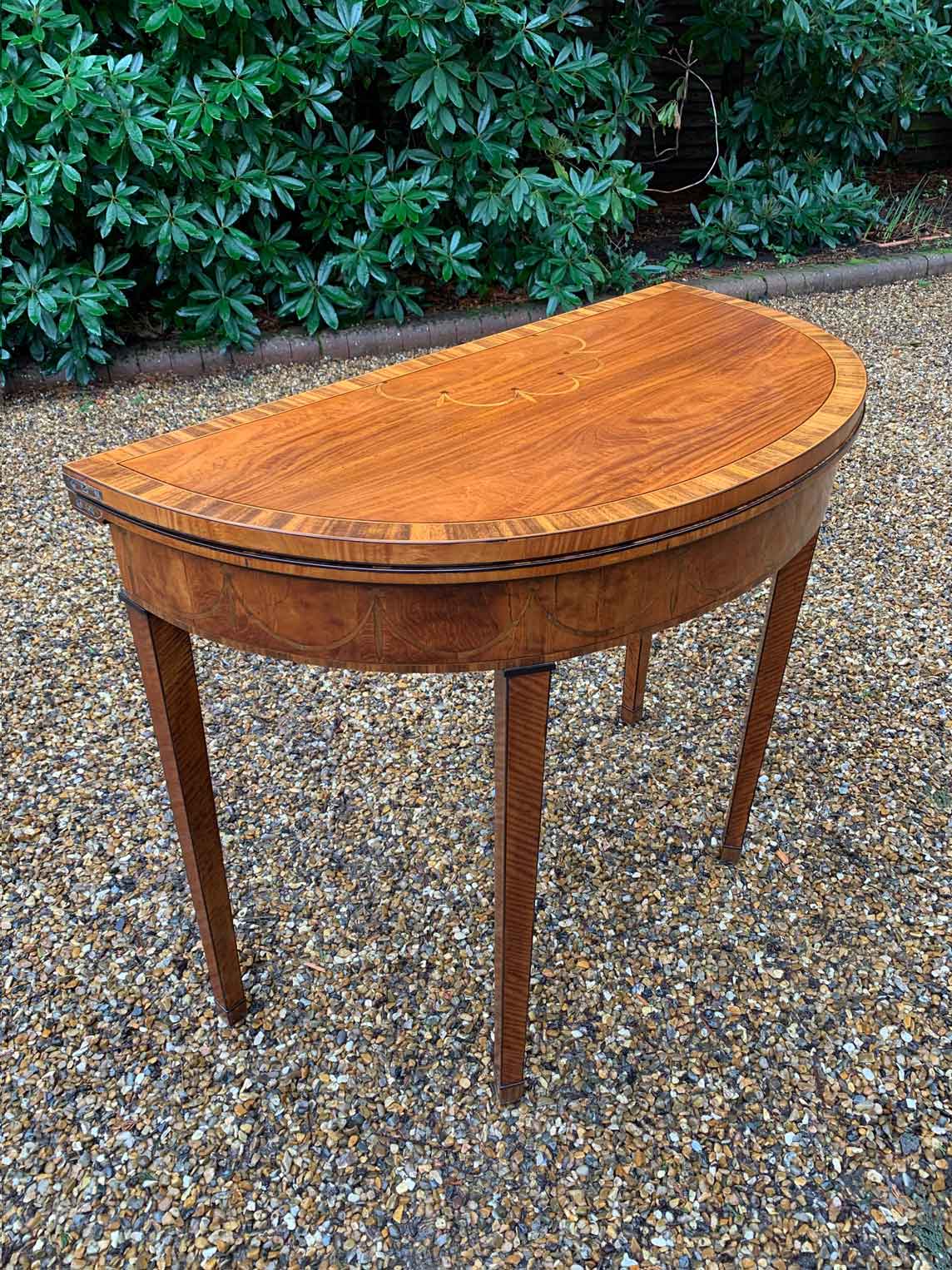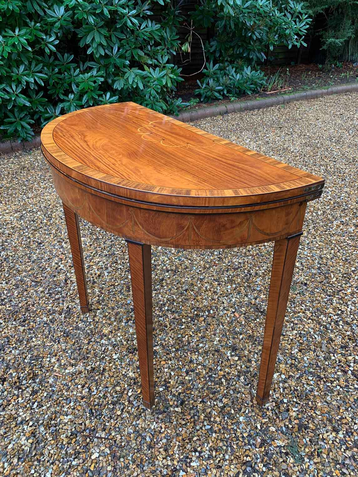 George III Demi Lune Card Table with a figured marquetry inlaid top with crossbanded rosewood, boxwood and ebony, raised on mahogany square tapering legs.