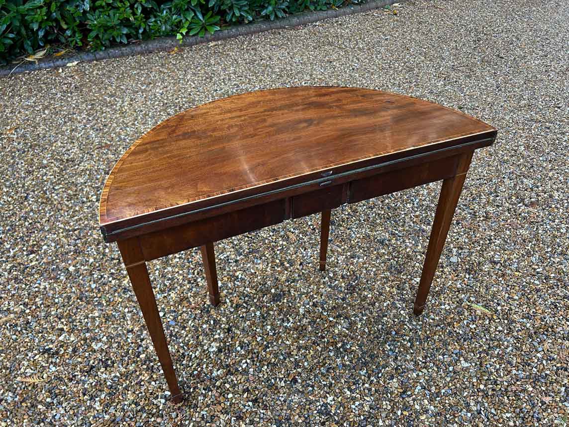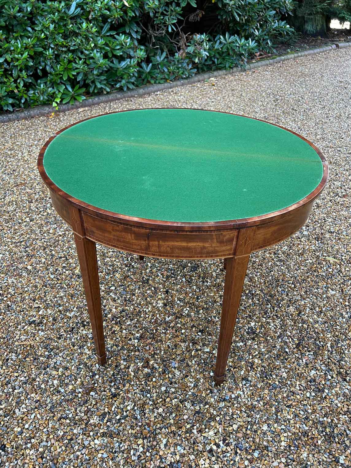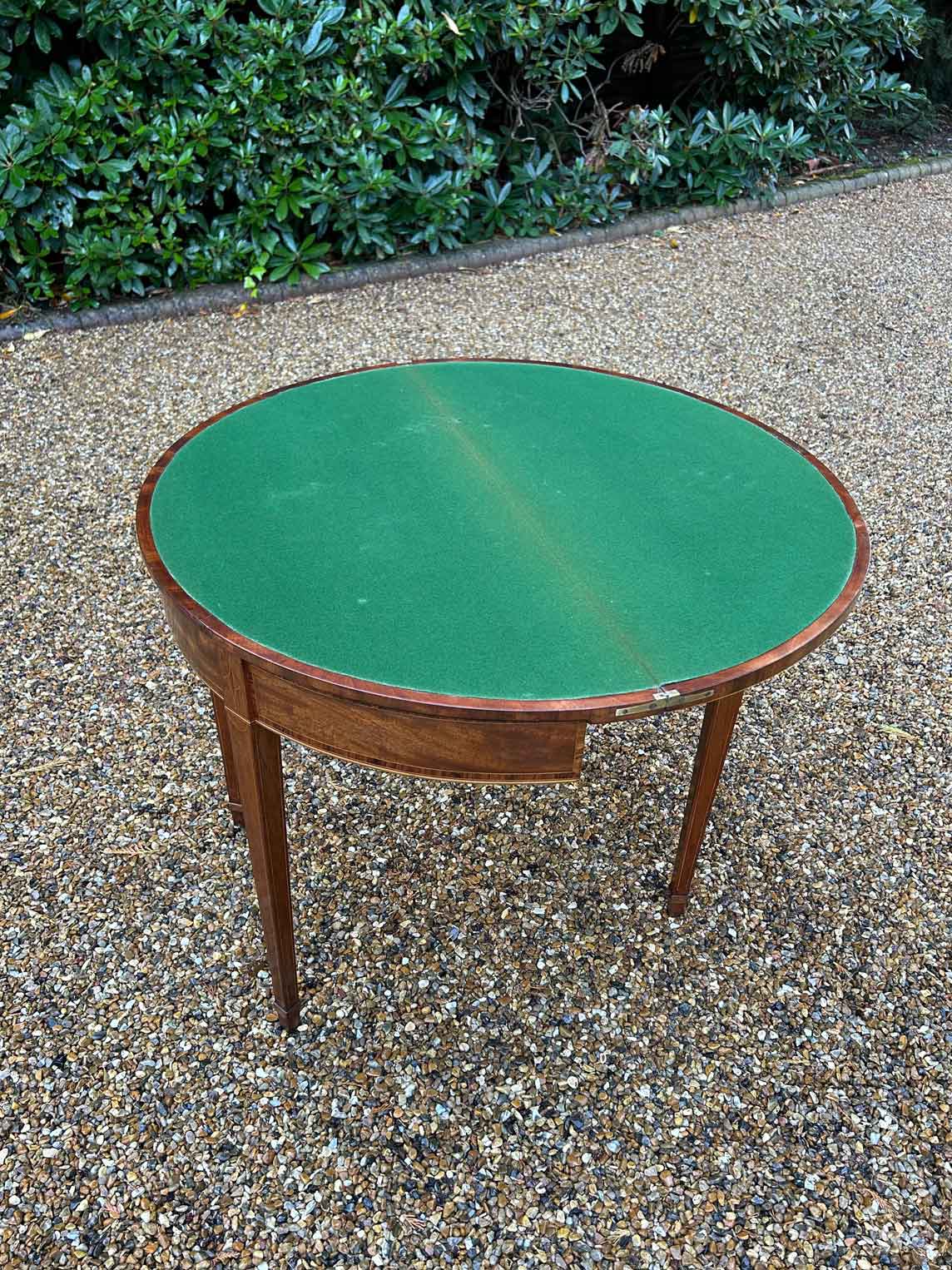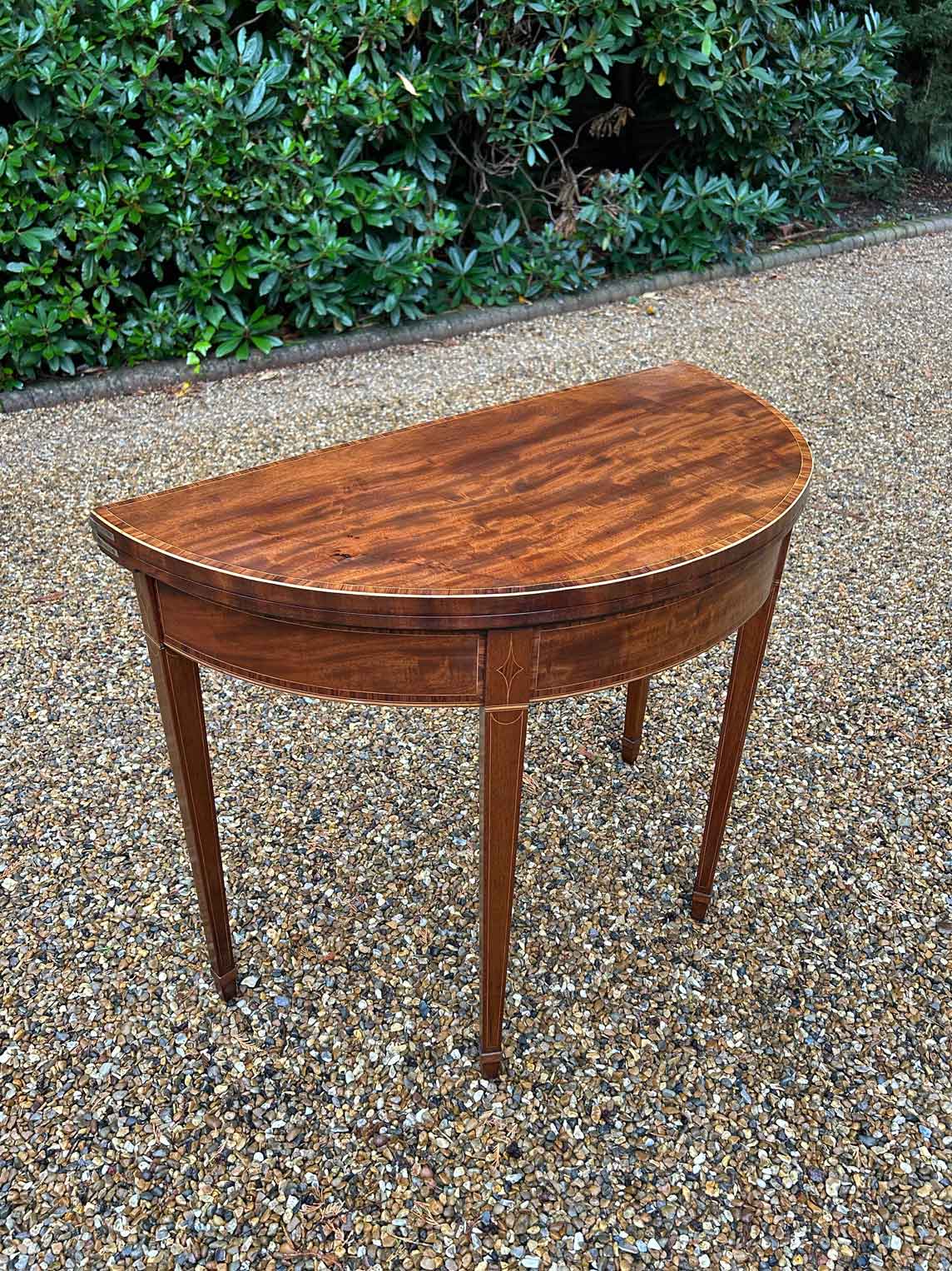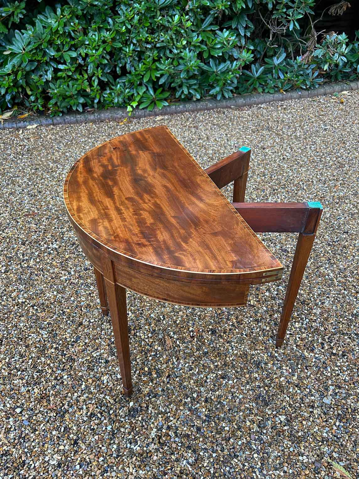 19th Century George III Mahogany Inlaid Demi Lune Card Table with a folding top lined with a green baize, crossbanded and line inlaid decoration on square tapering legs with spade feet.